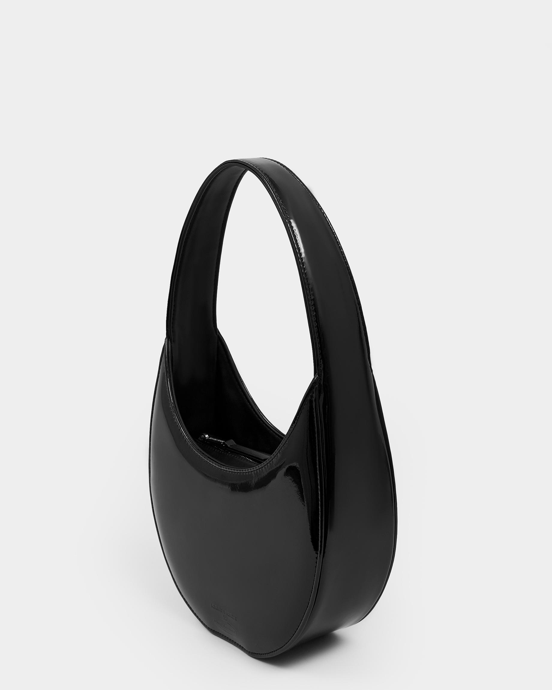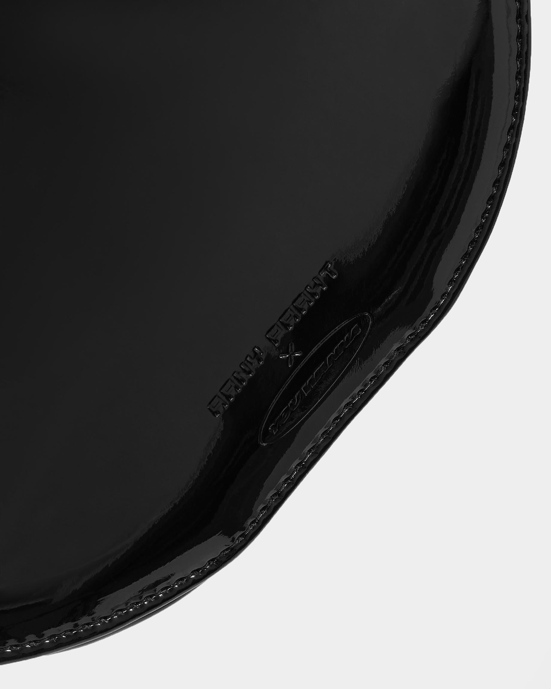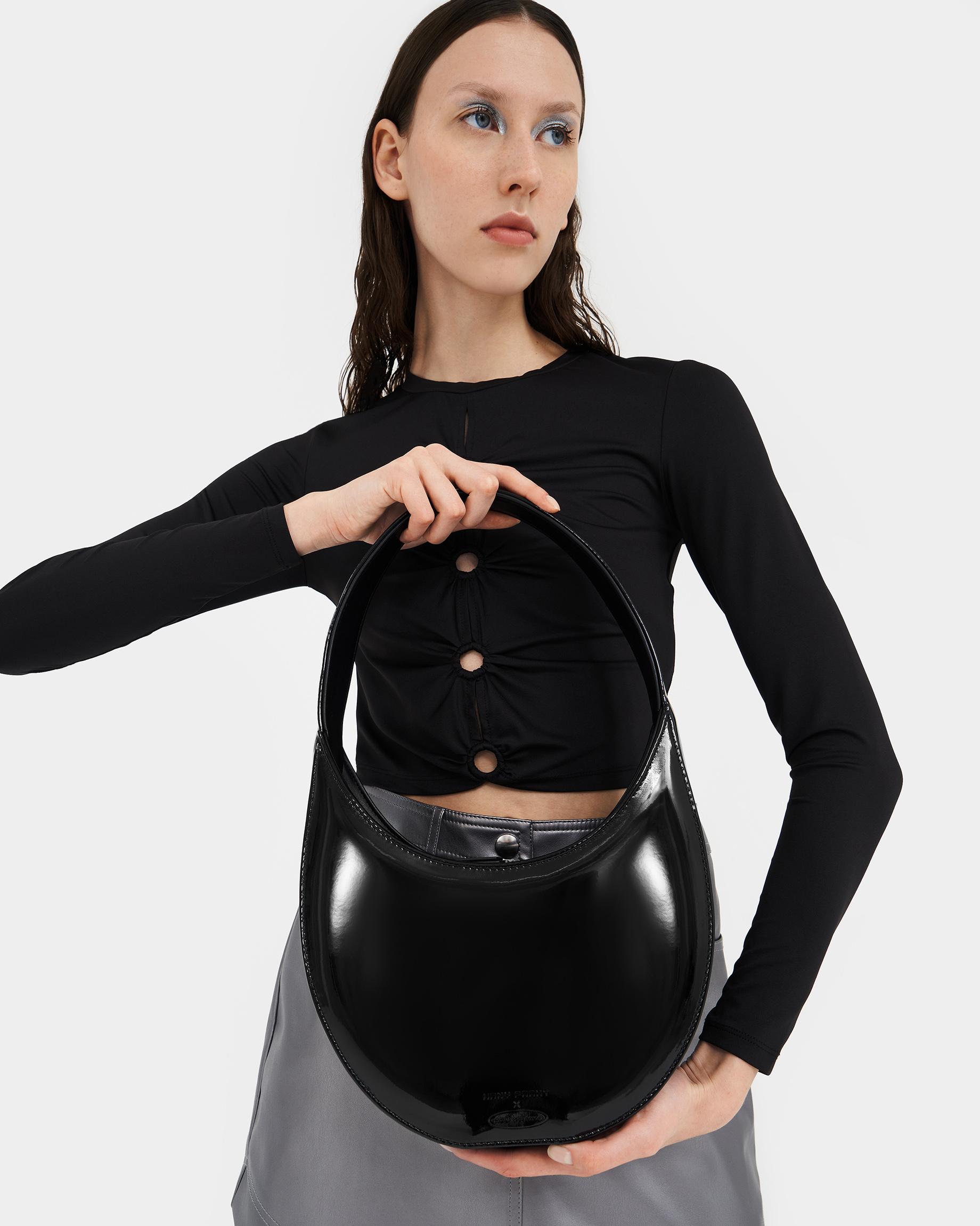 Каркасная сумка круглой формы в черном цвете из лаковой экокожи