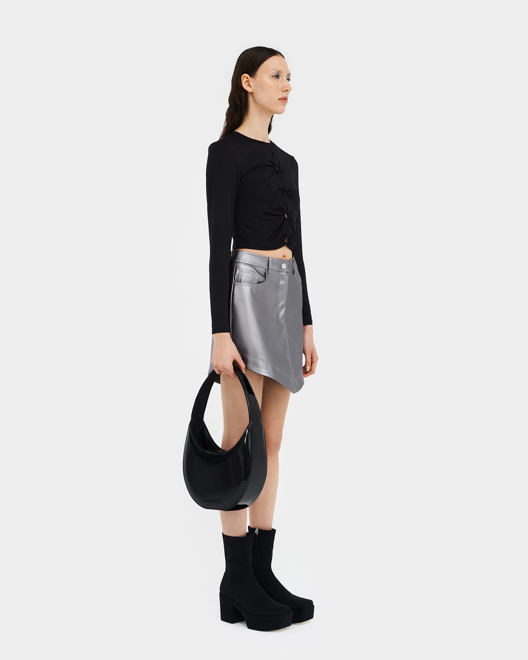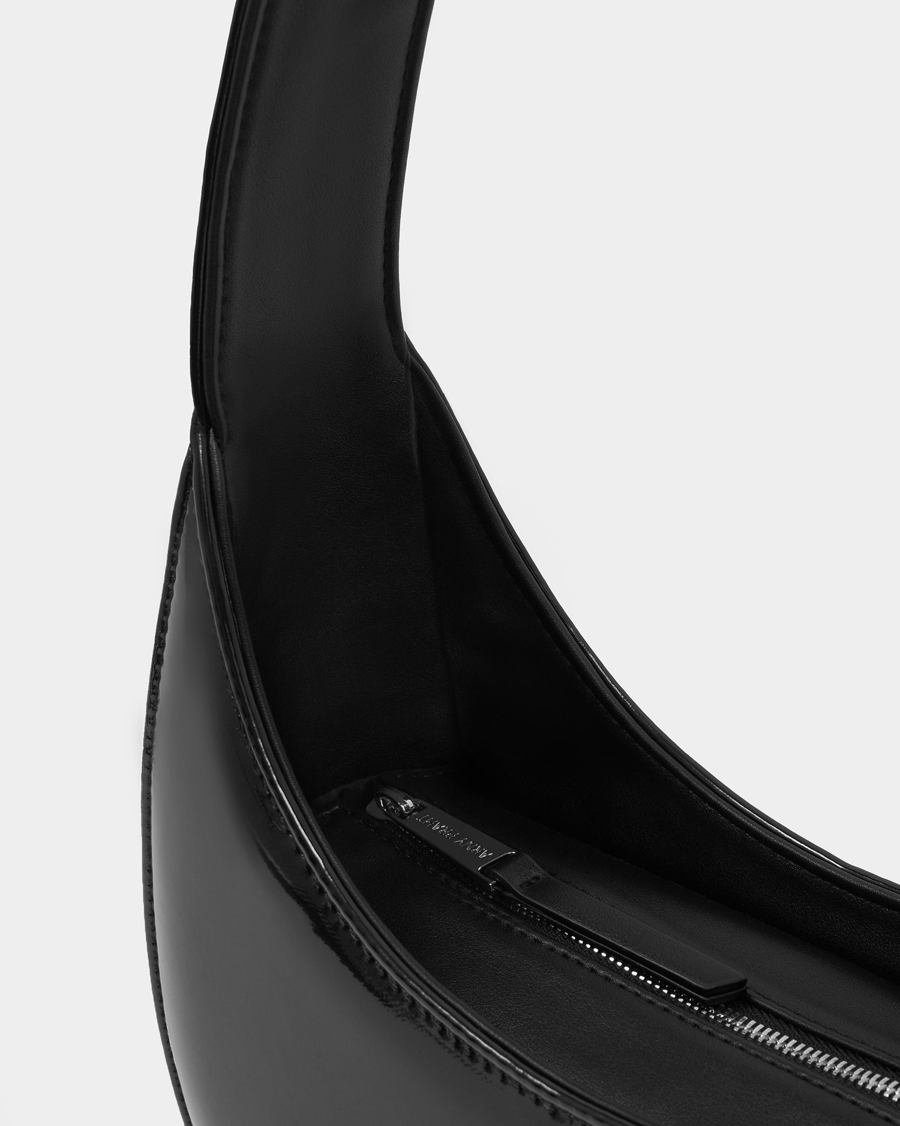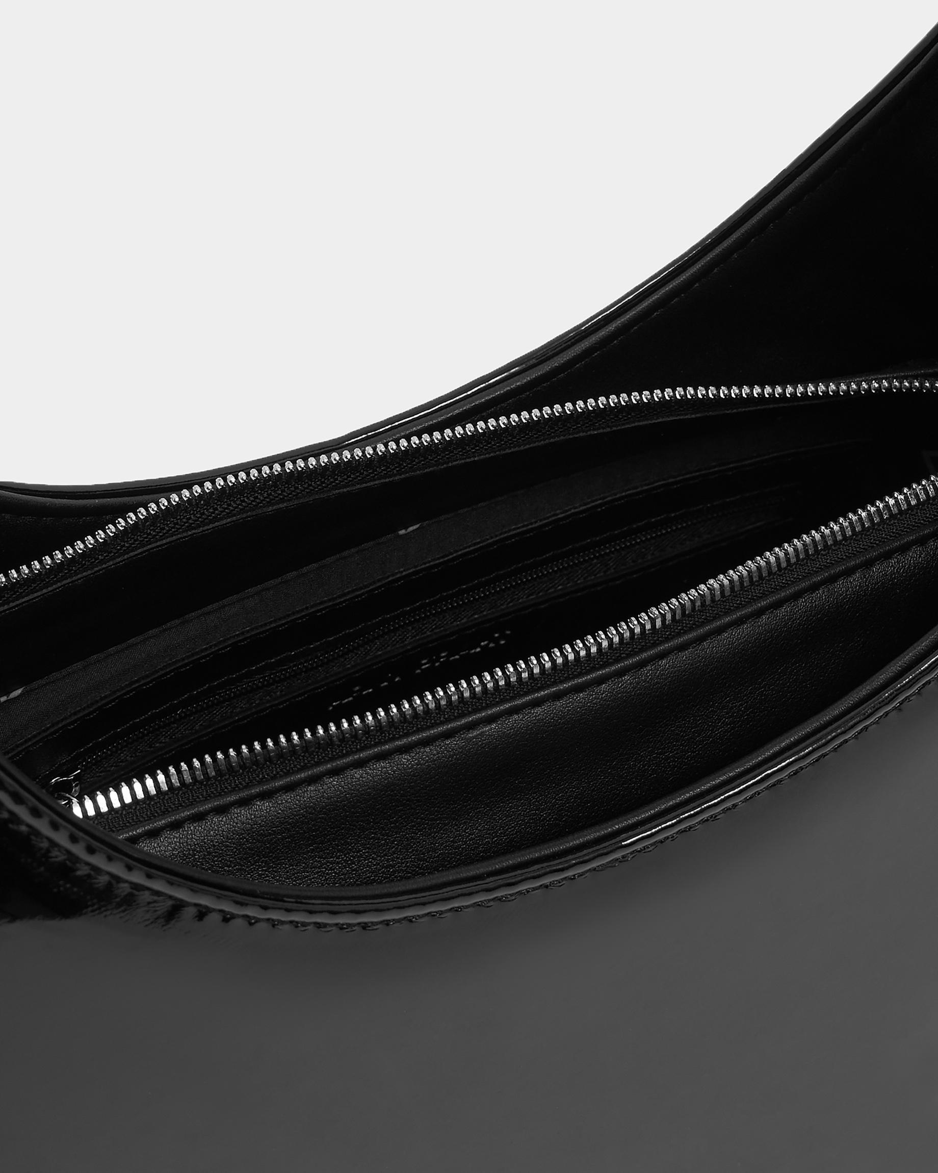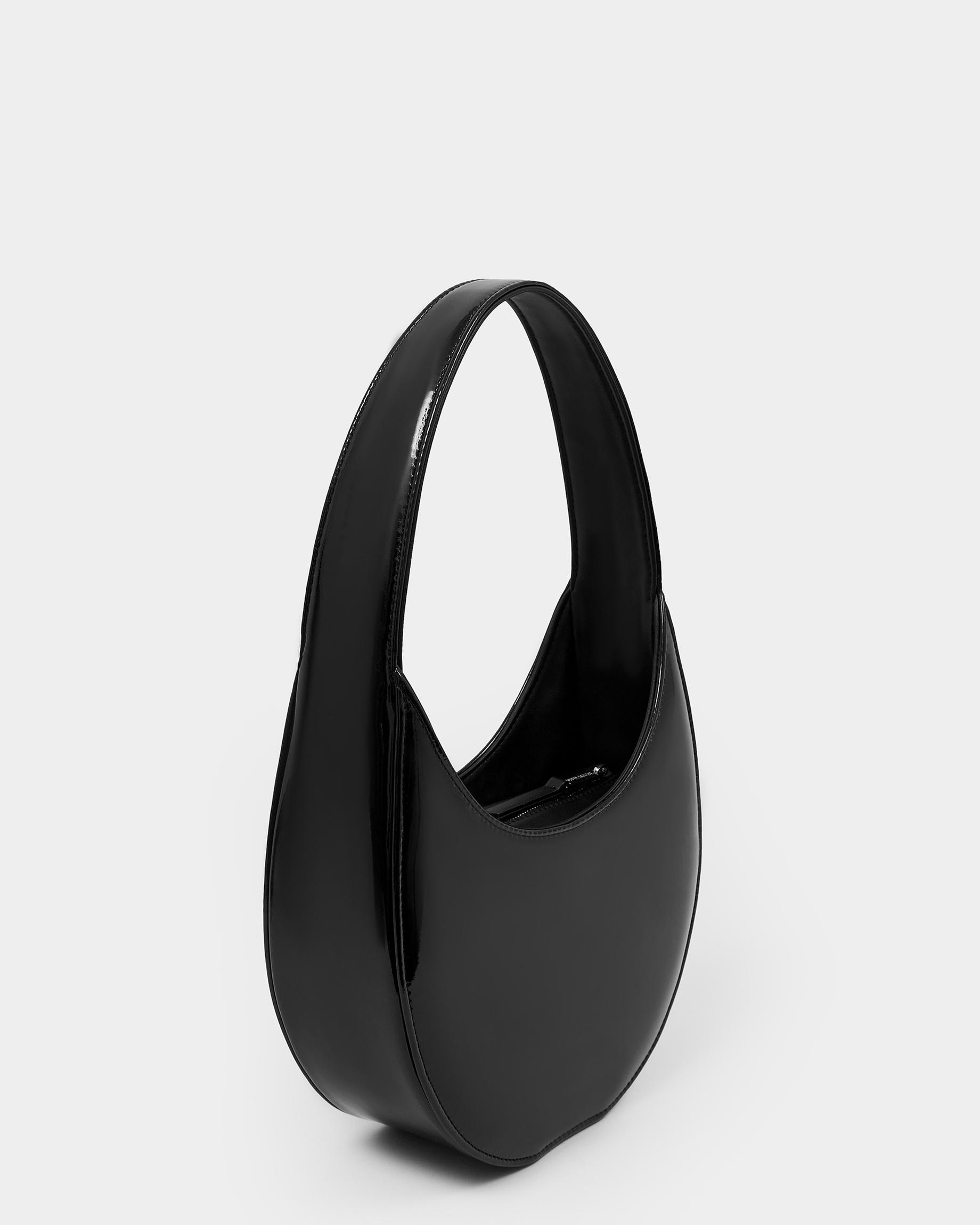 Каркасная сумка круглой формы в черном цвете из лаковой экокожи
