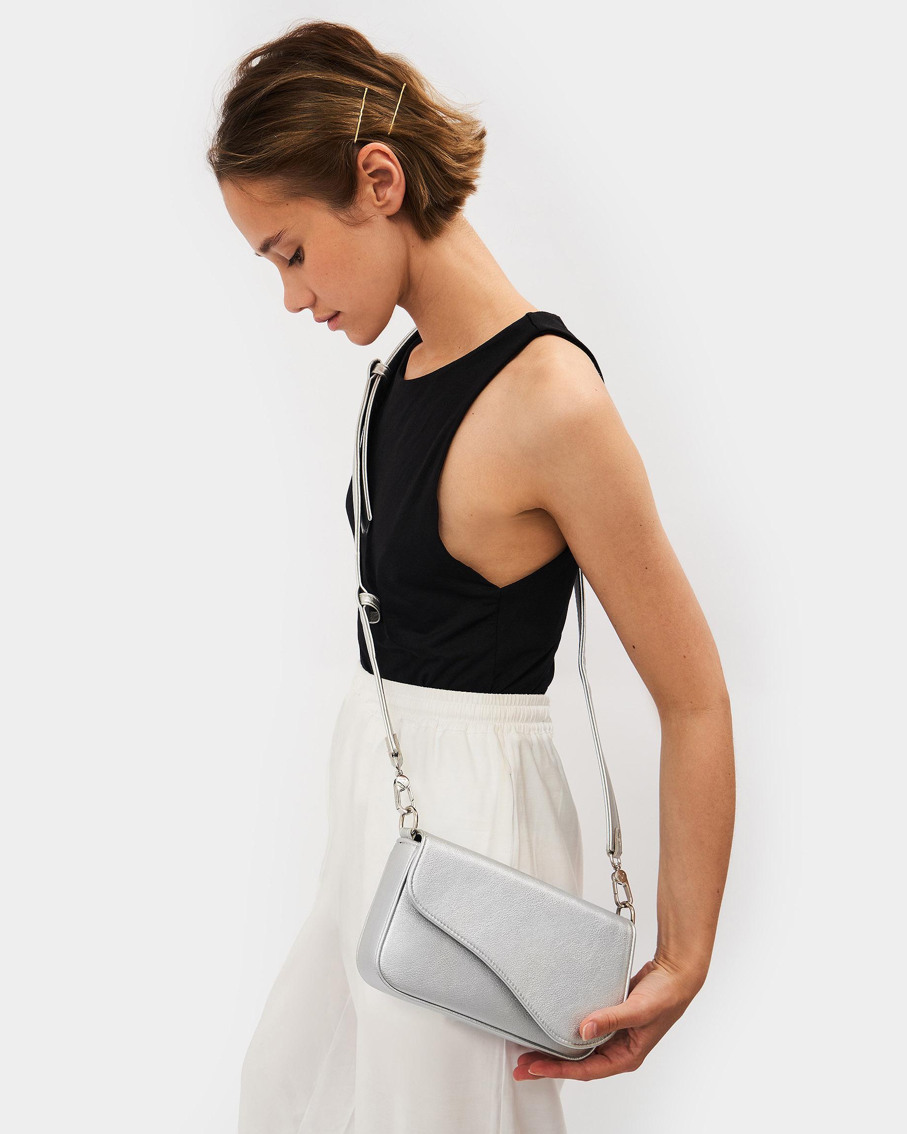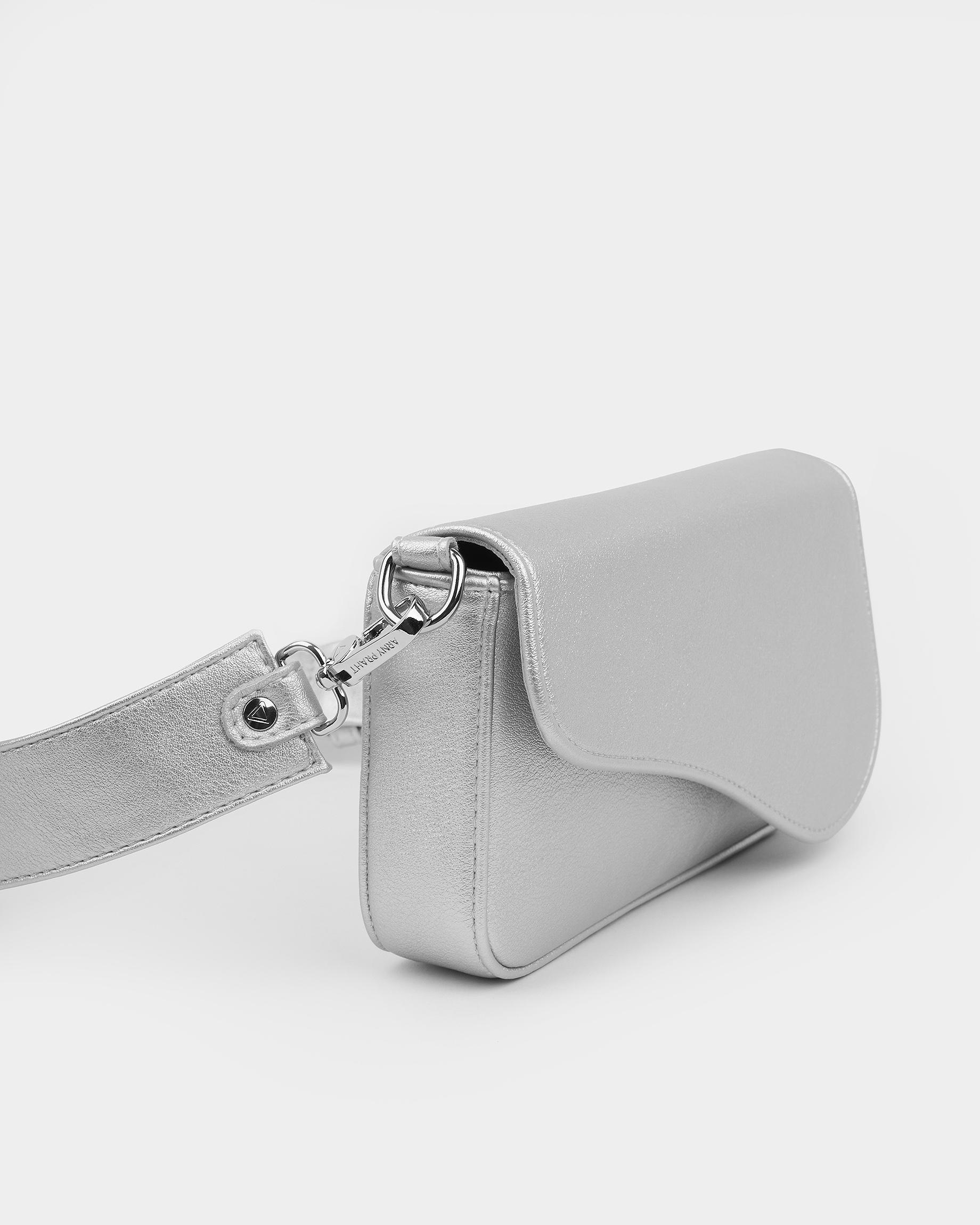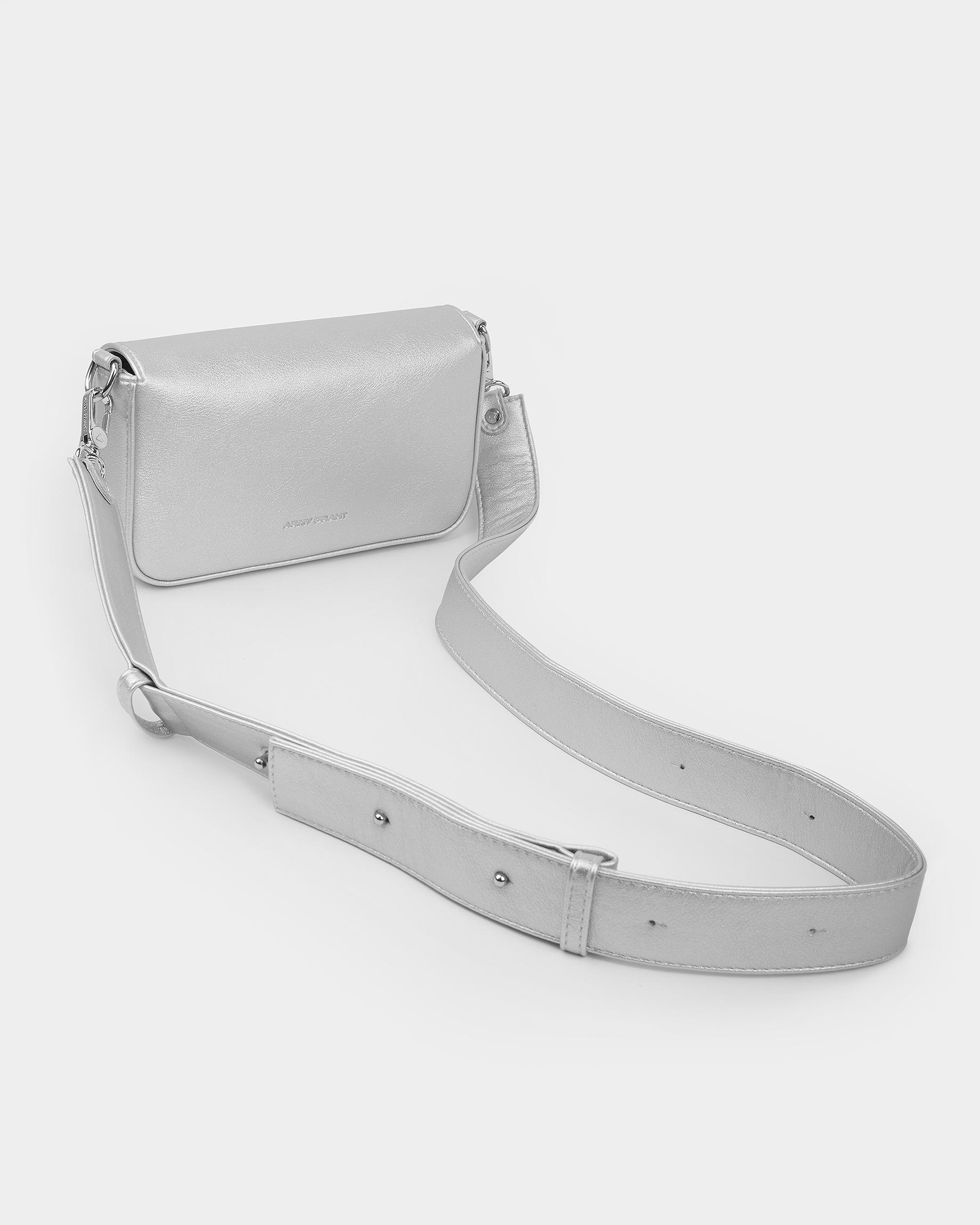 Сумка-клатч серебристого цвета с широким ремнем