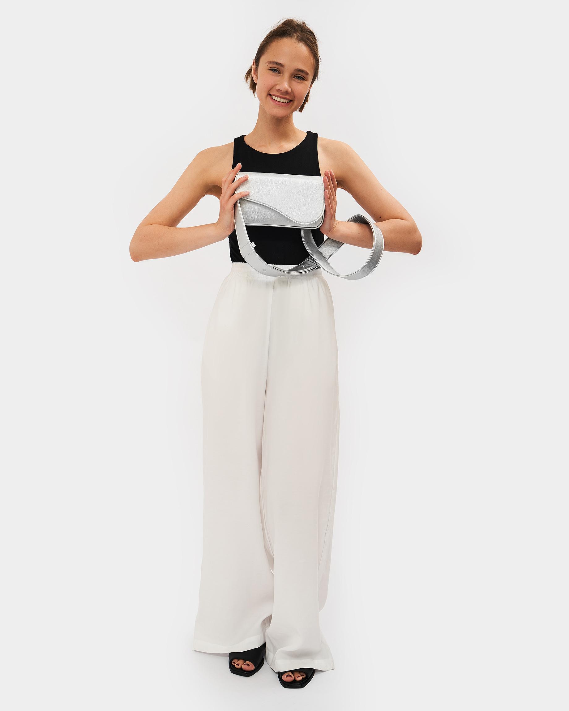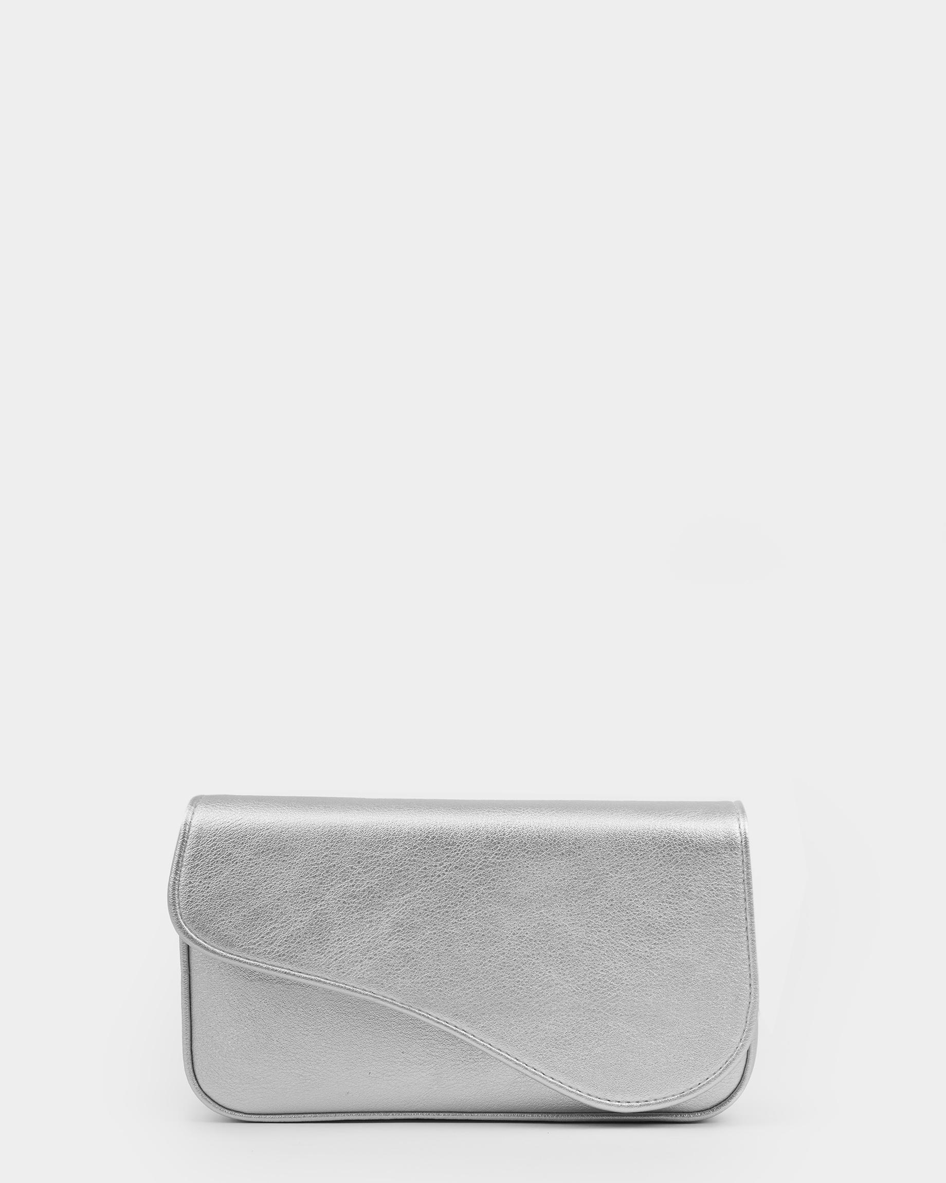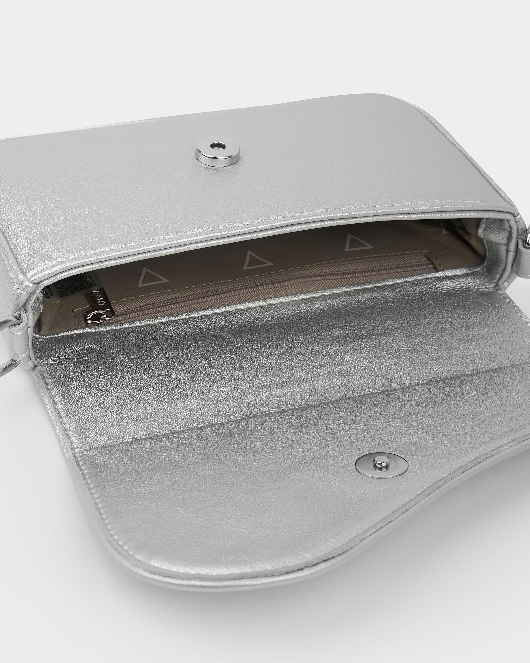 Сумка-клатч серебристого цвета с широким ремнем