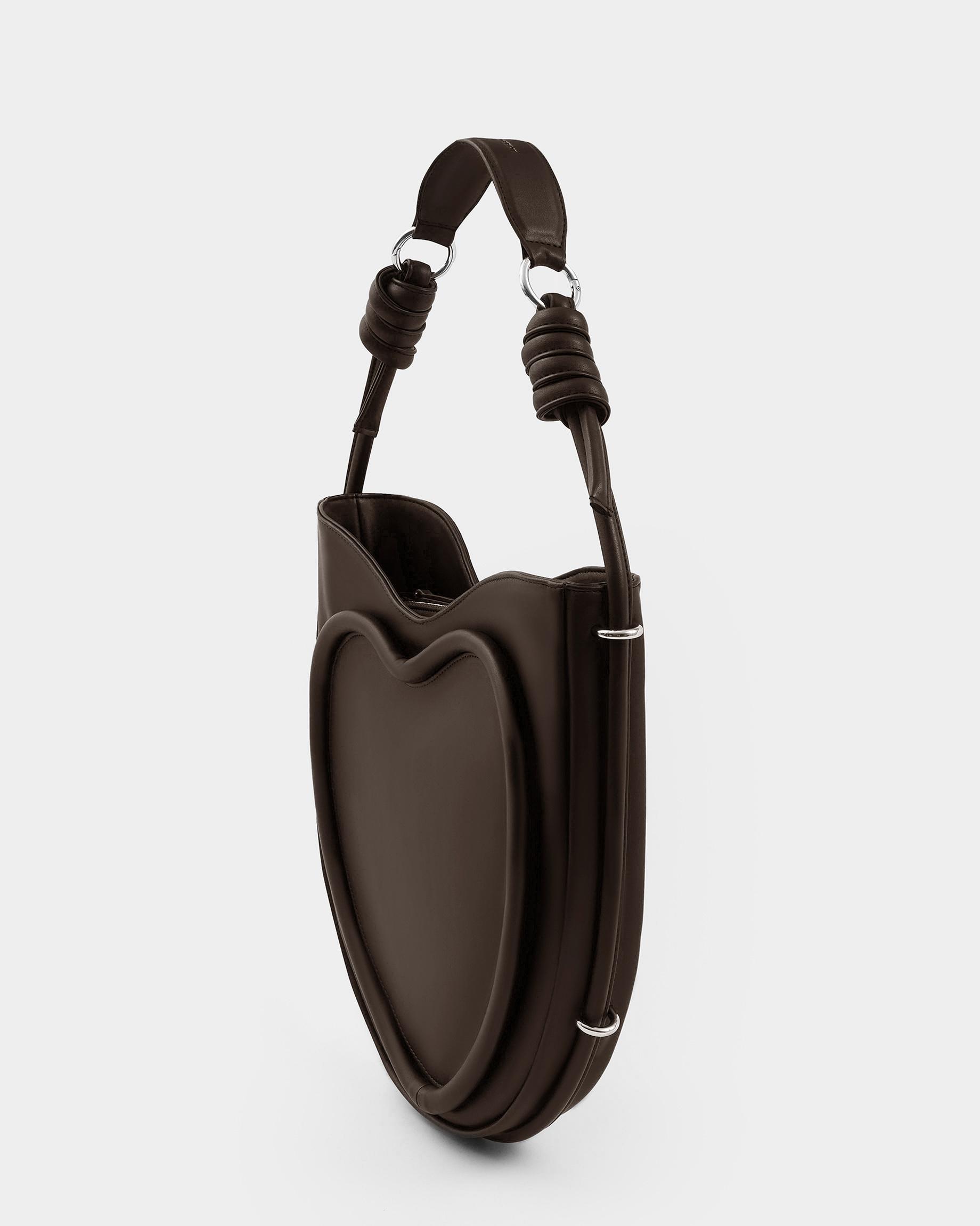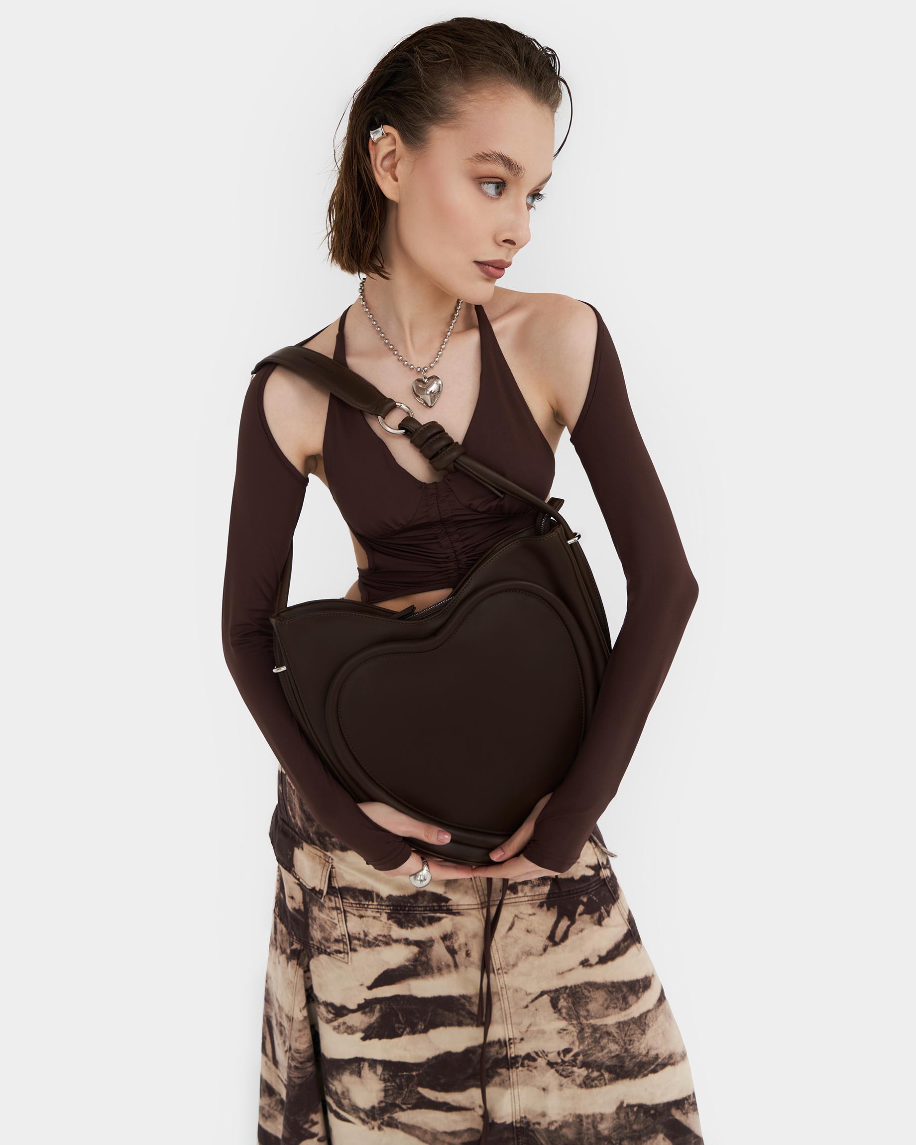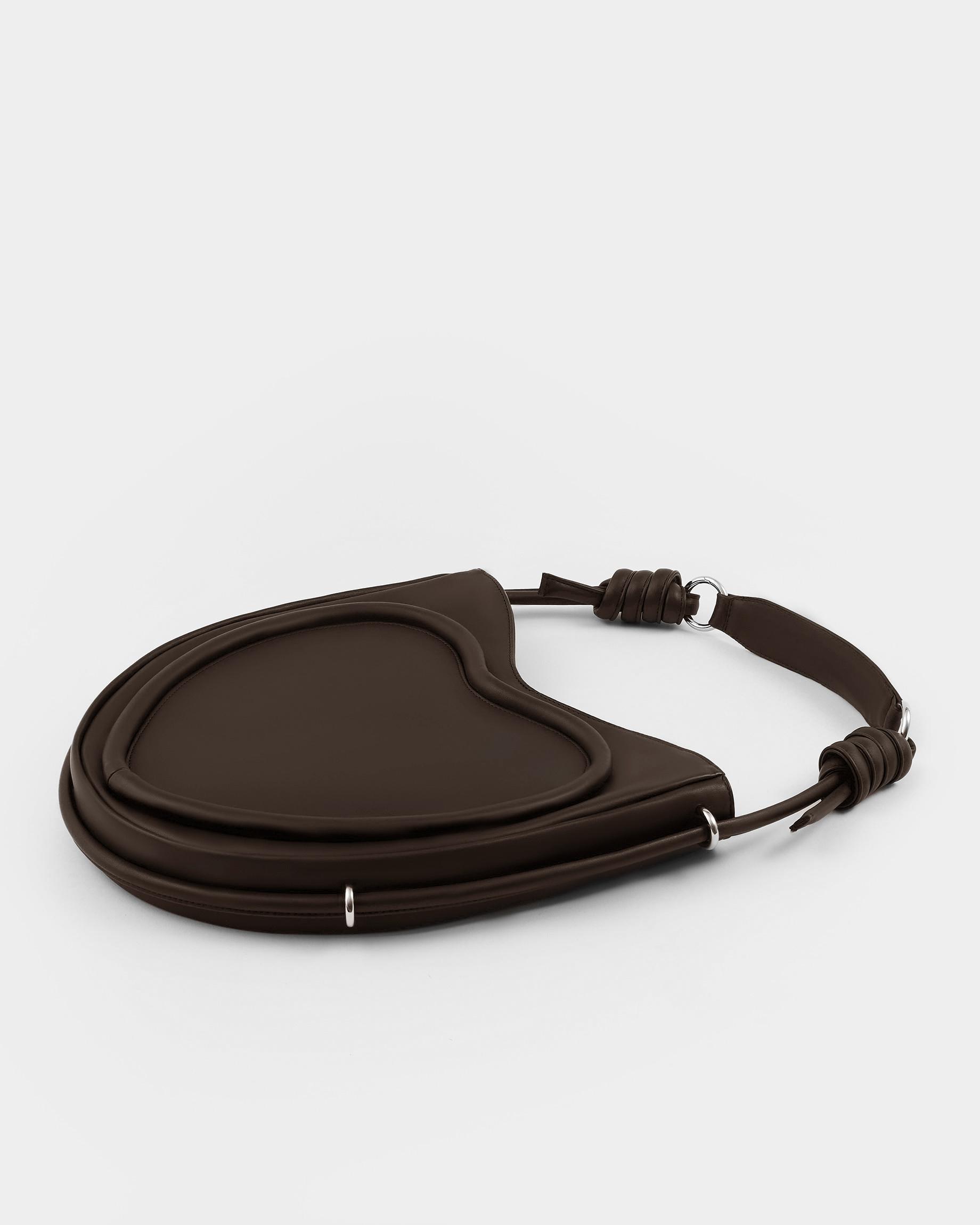Ассиметричная сумка в форме сердца c объемным кантом и ремнем в виде жгута в цвете горький шоколад