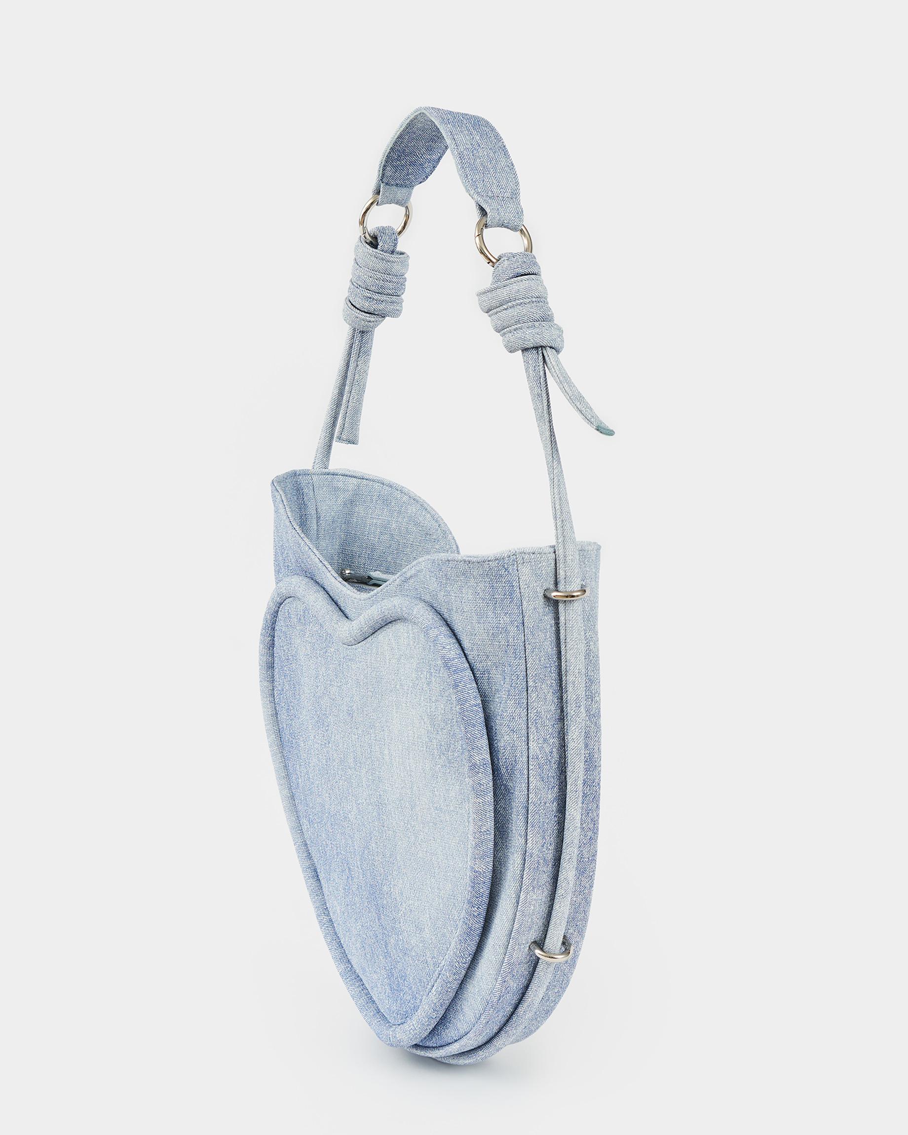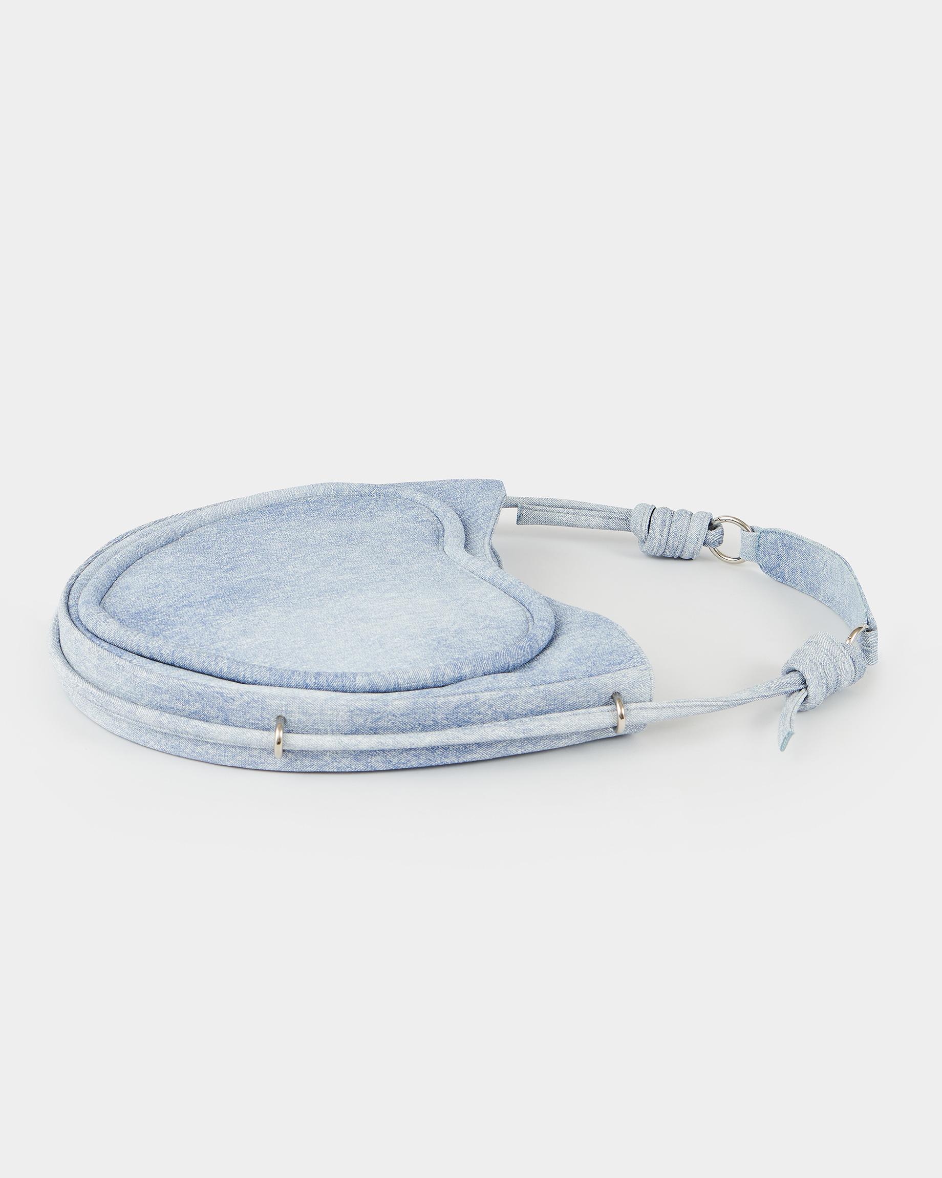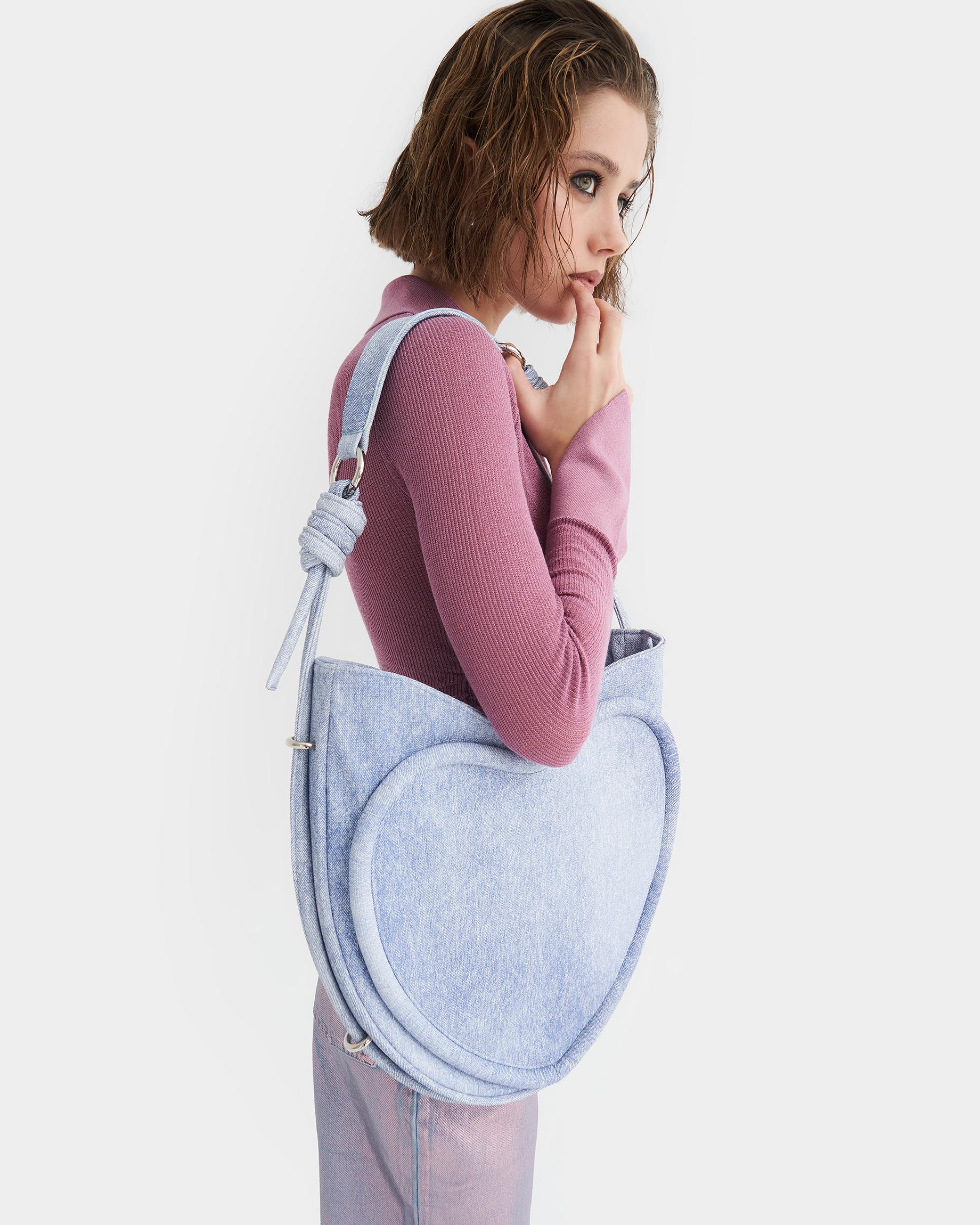 Ассиметричная сумка в форме сердца c объемным кантом и ремнем в виде жгута в цвете потертый деним