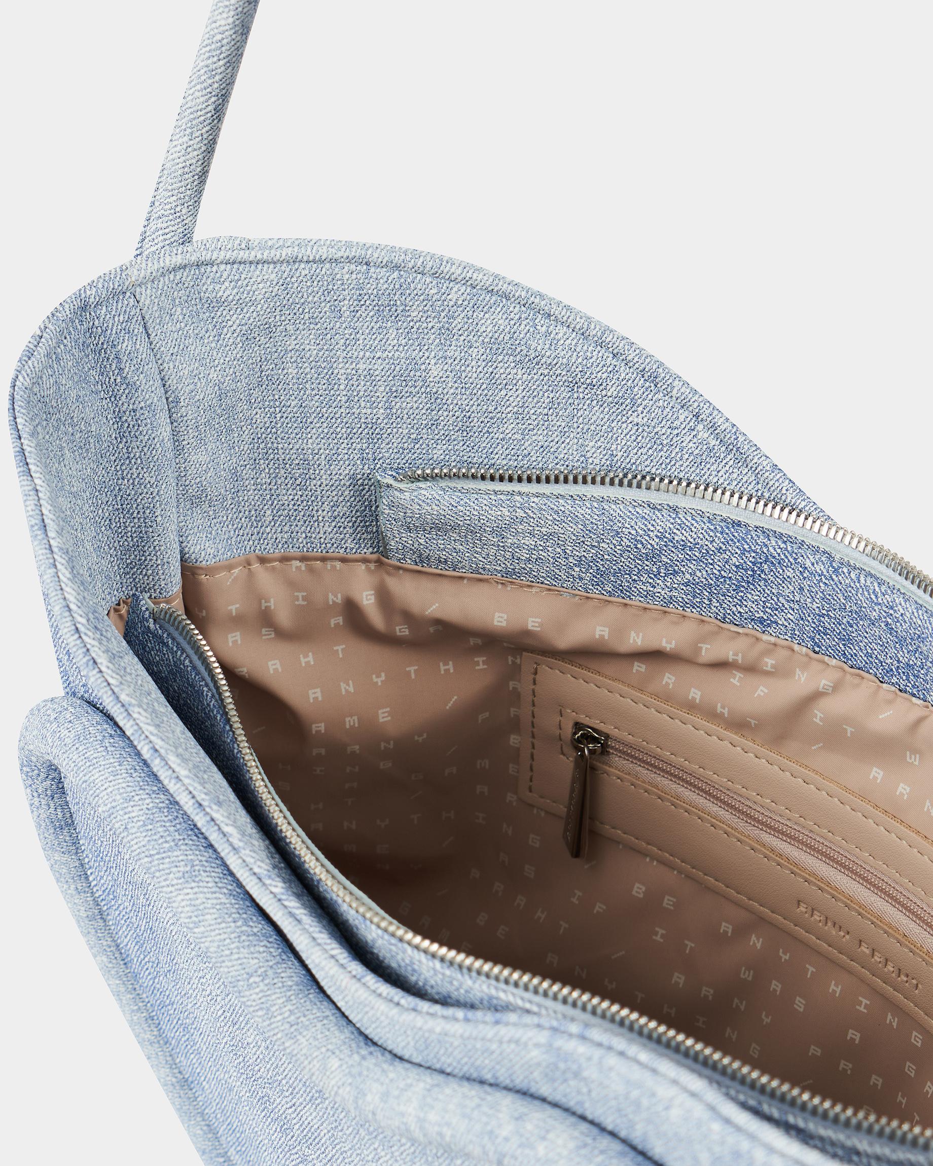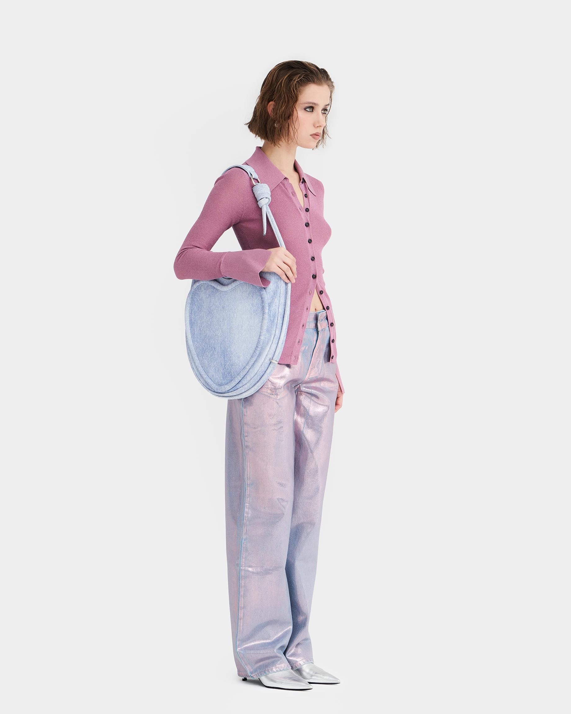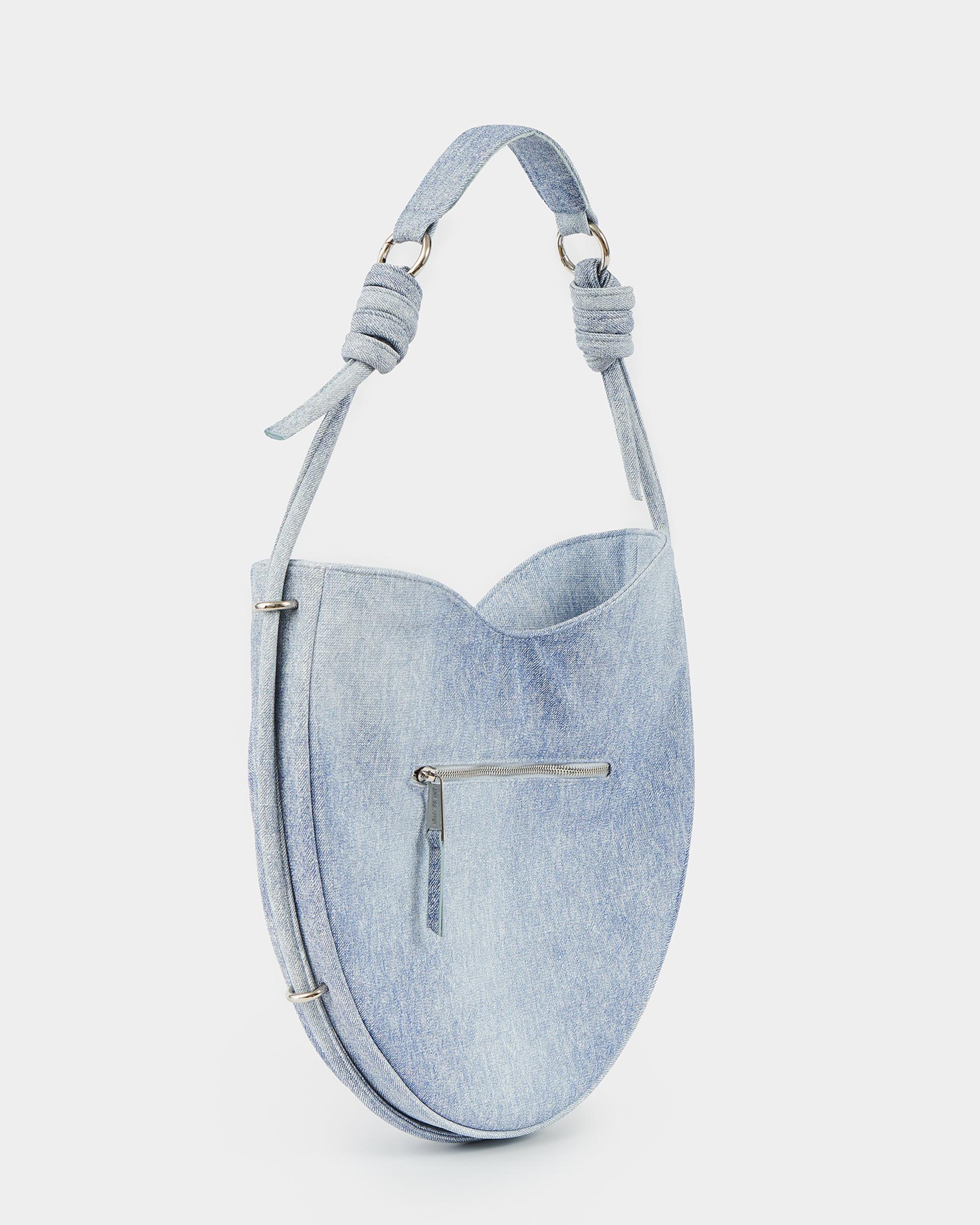 Ассиметричная сумка в форме сердца c объемным кантом и ремнем в виде жгута в цвете потертый деним