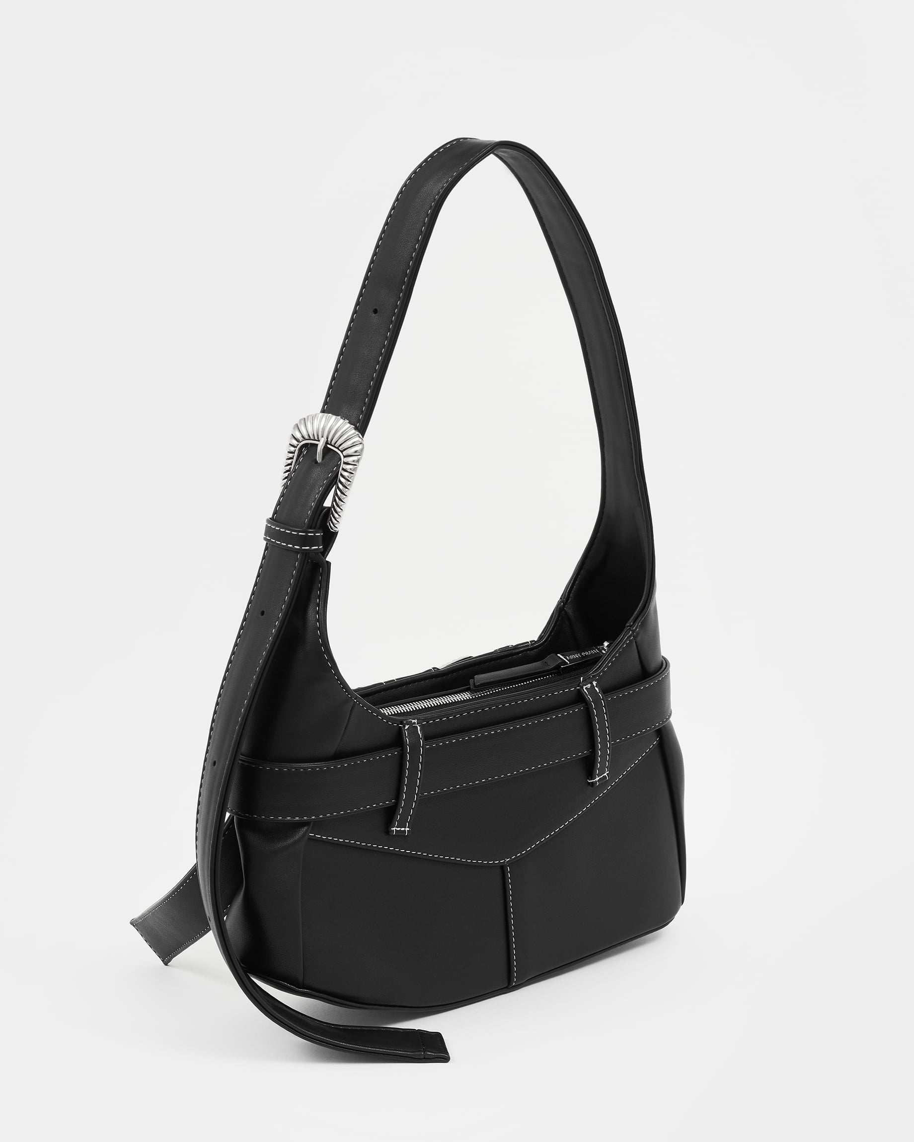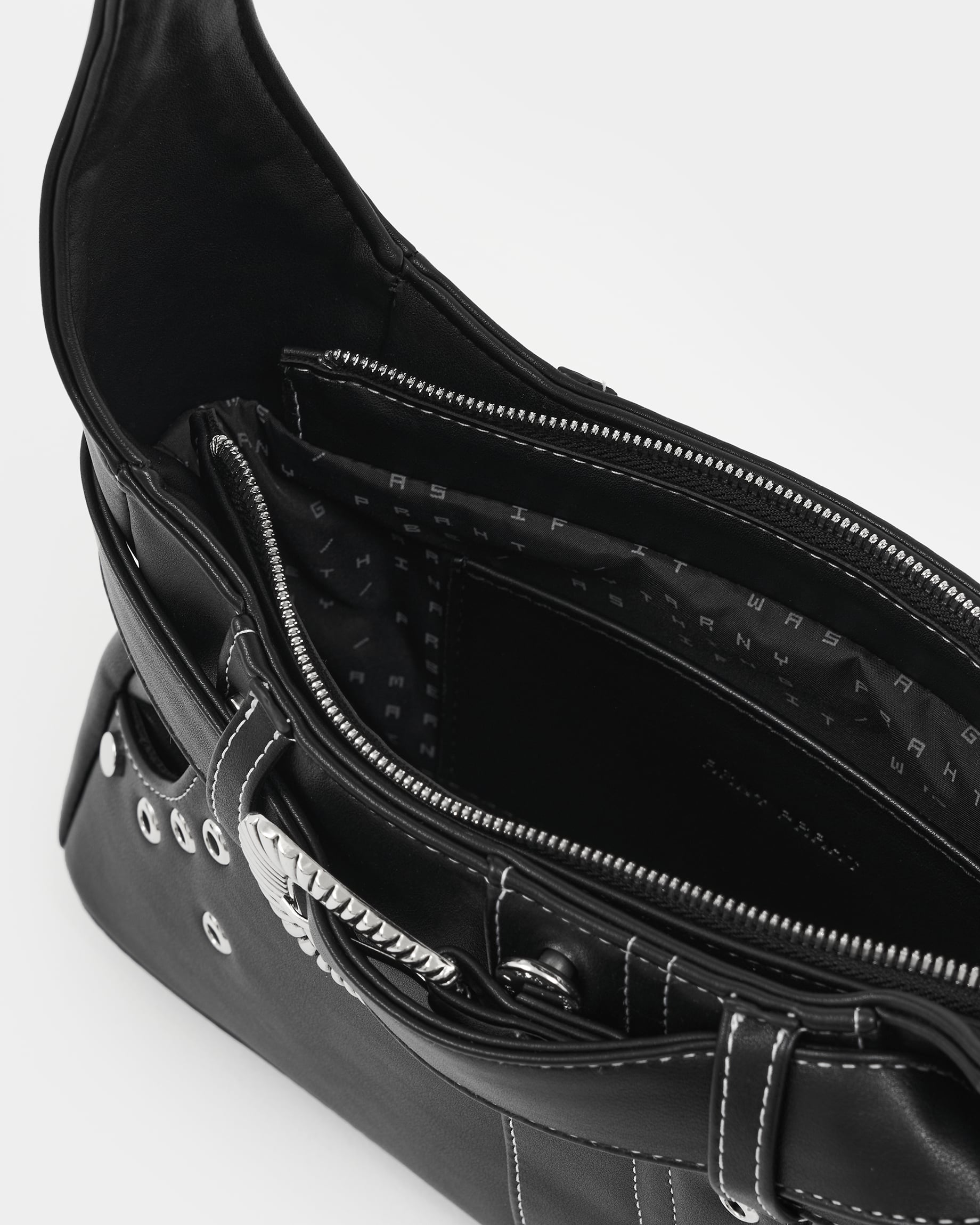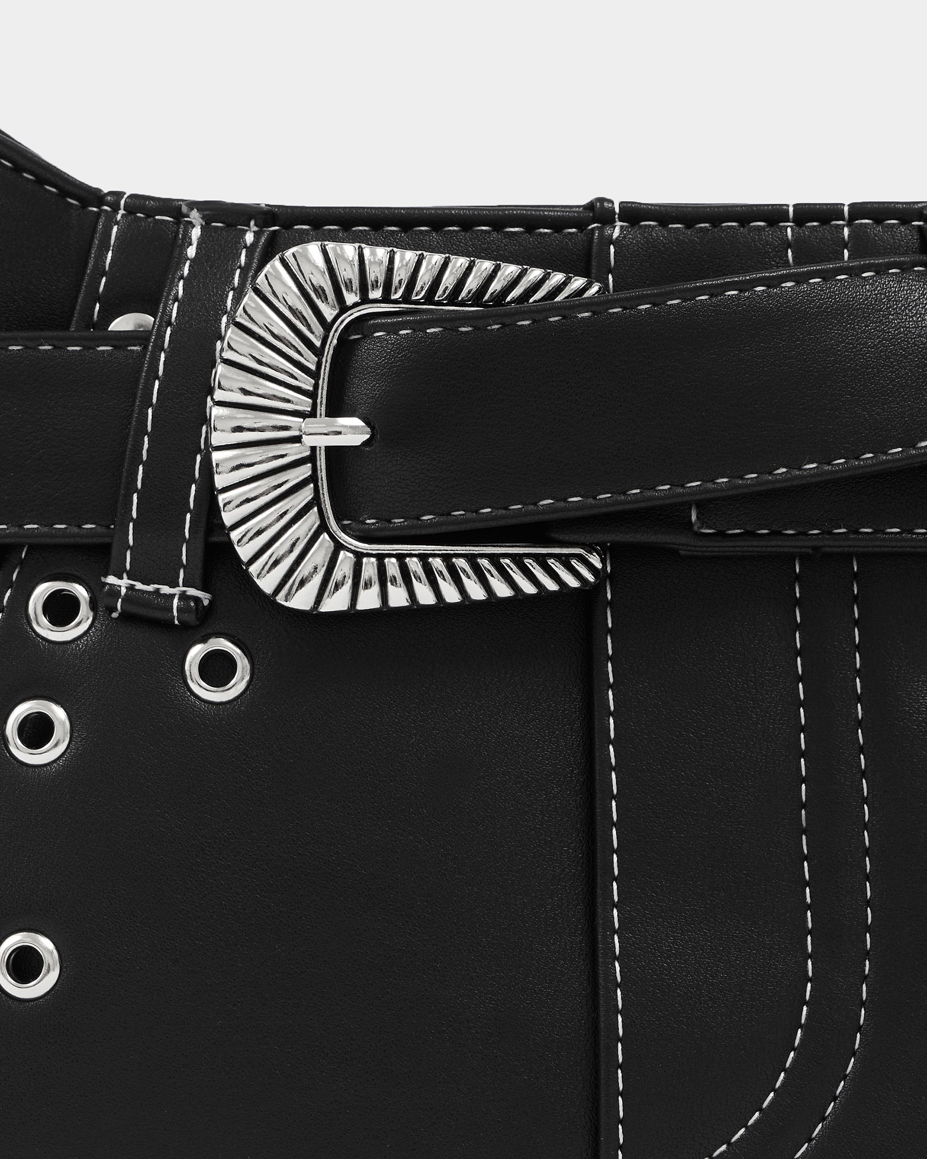 Сумка из экокожи с карманами и декоративным ремнем и клепками в черном цвете