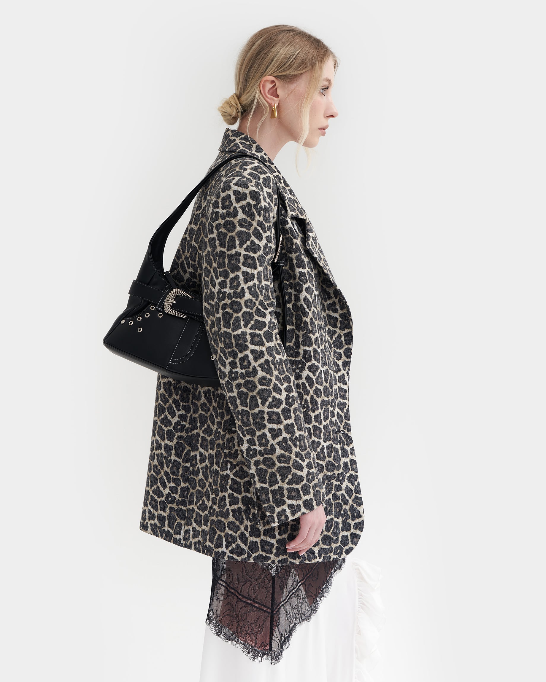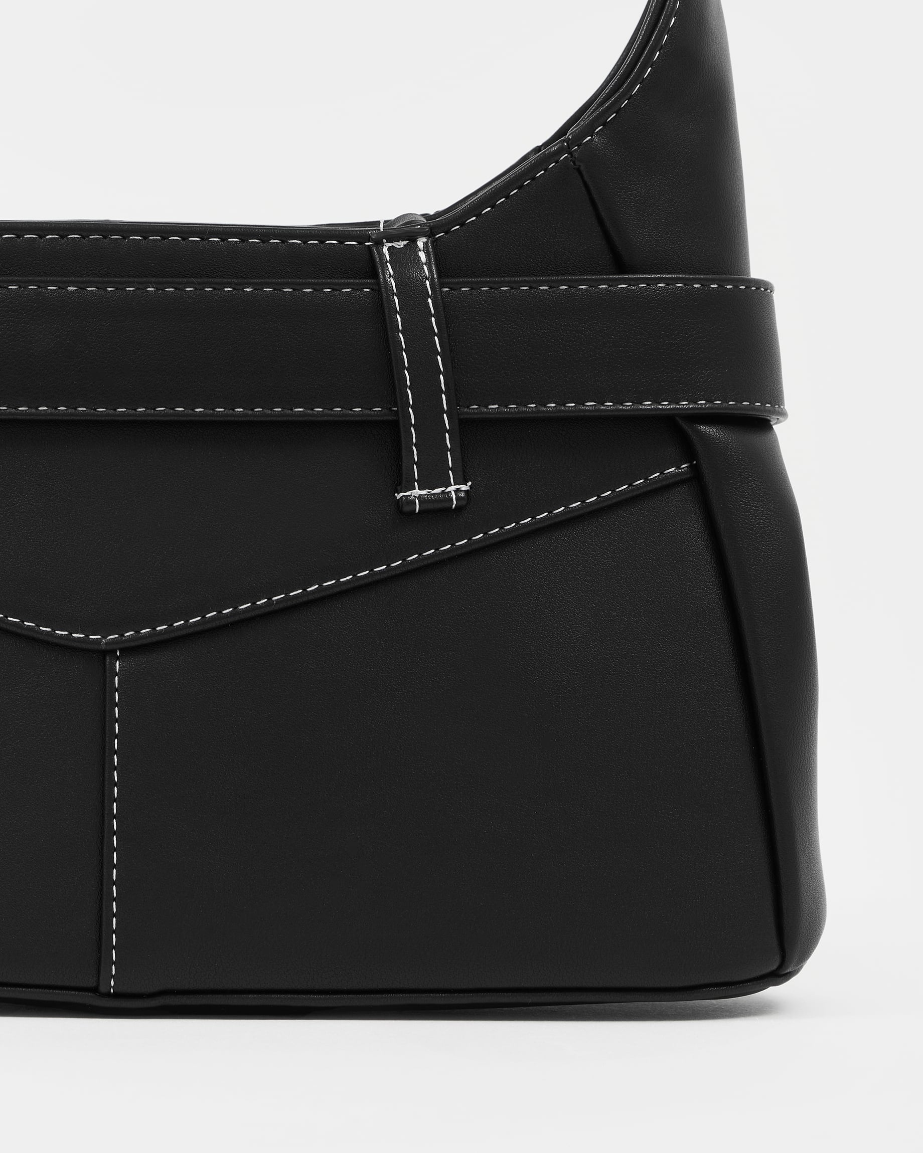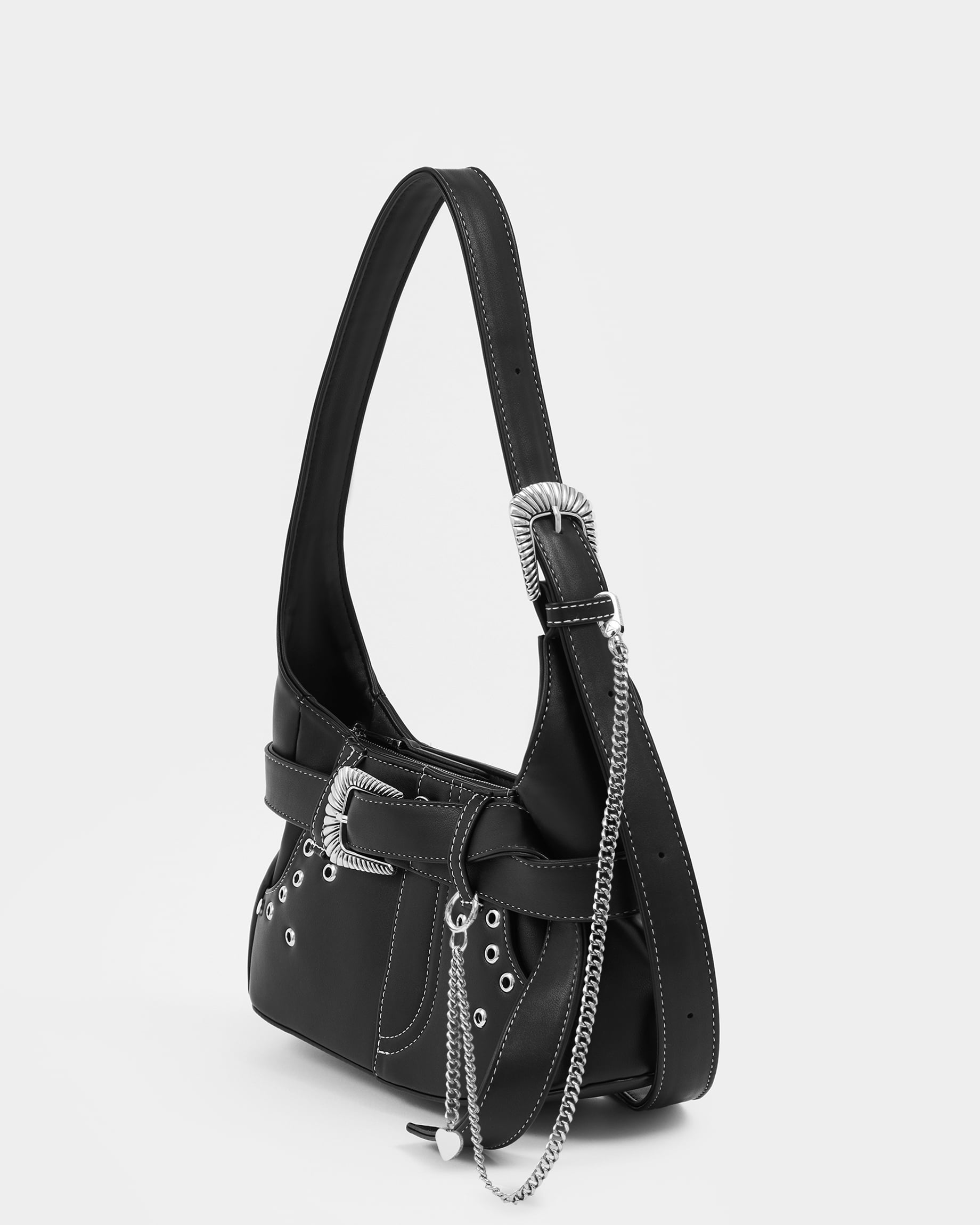 Сумка из экокожи с карманами и декоративным ремнем и клепками в черном цвете