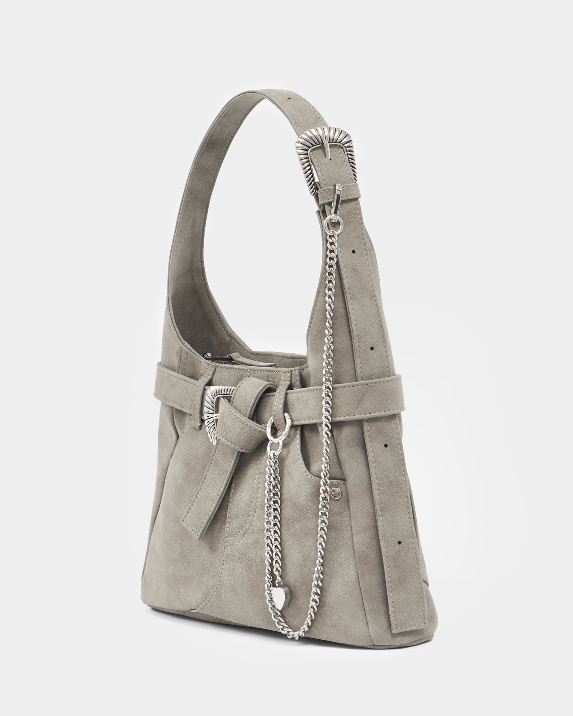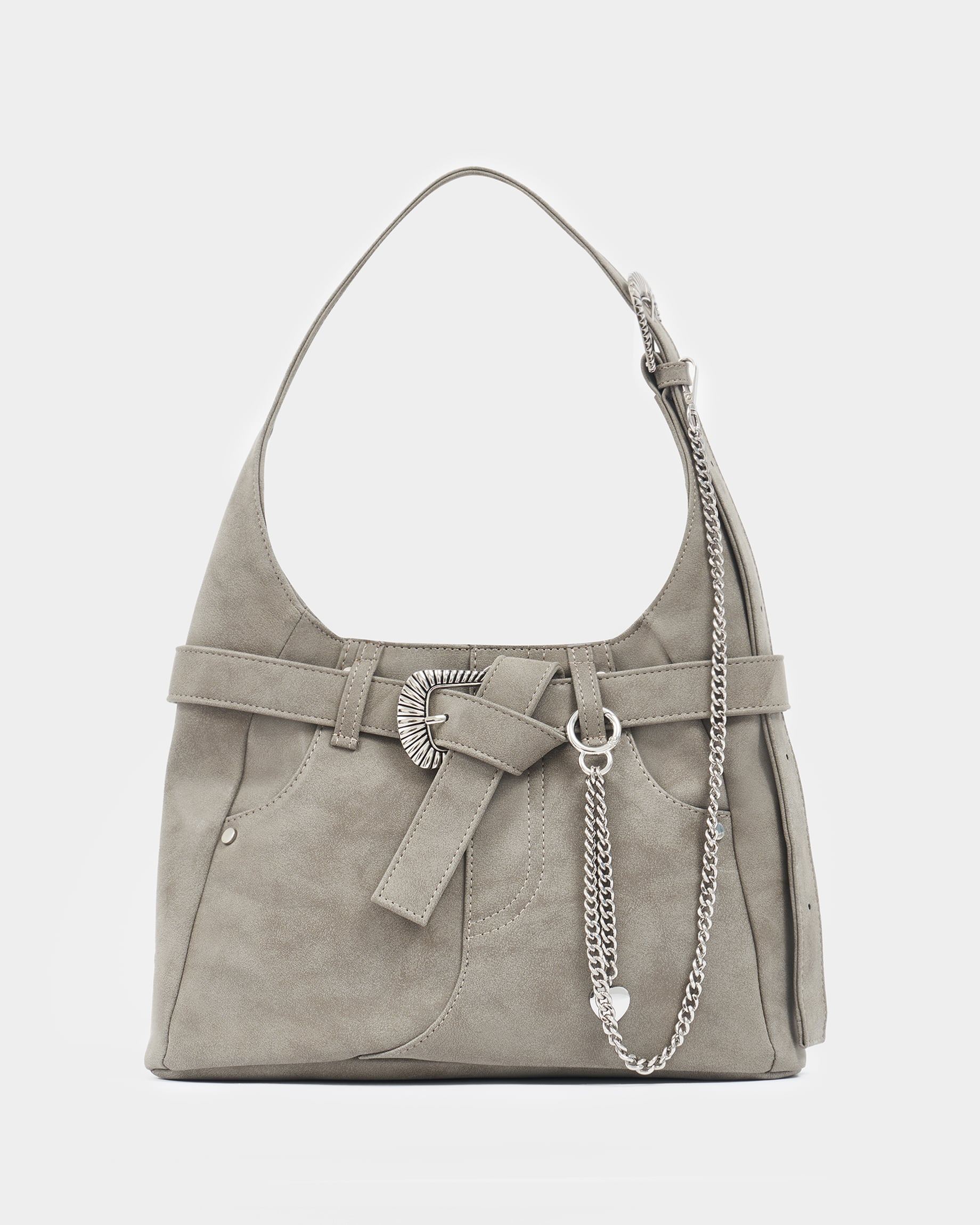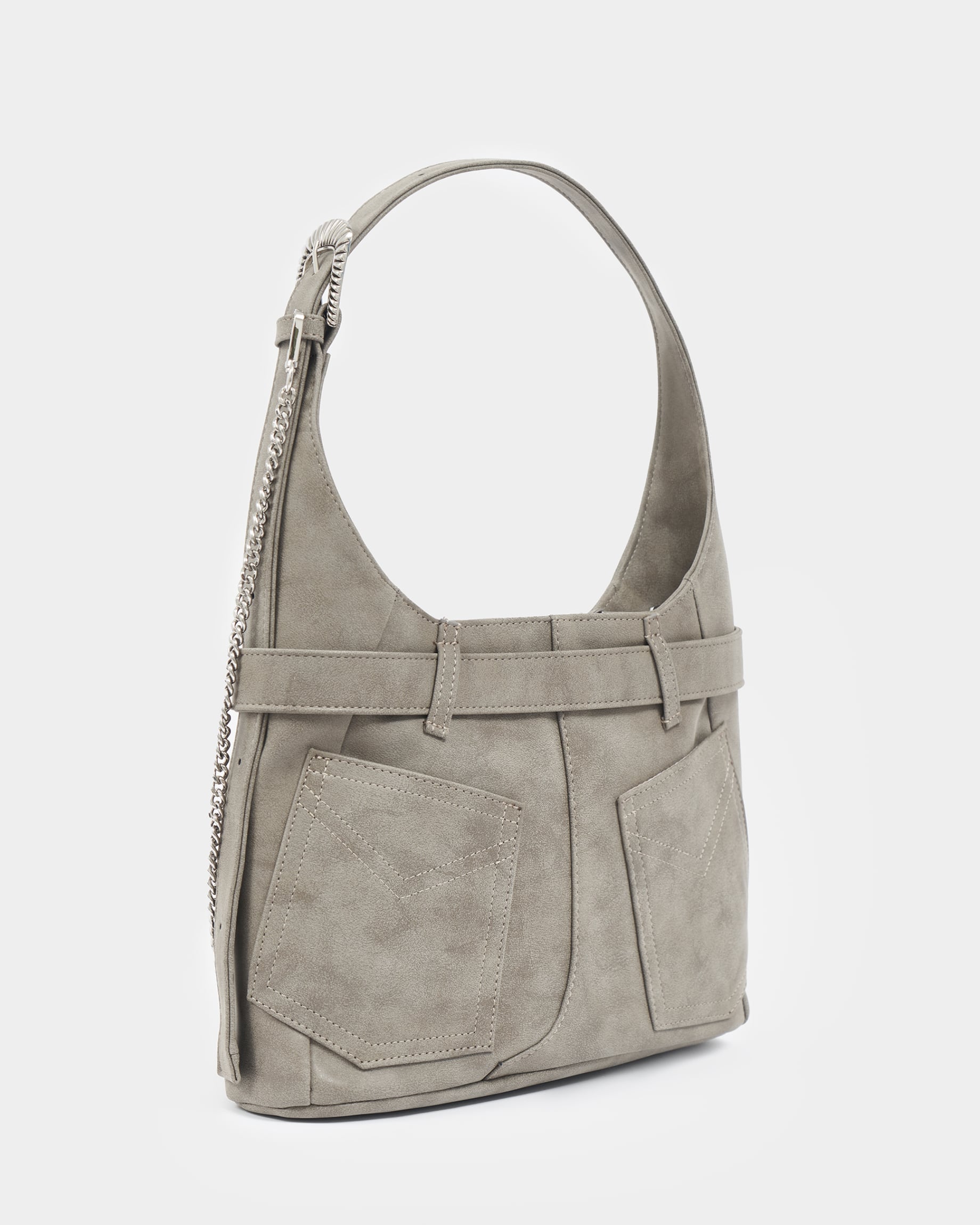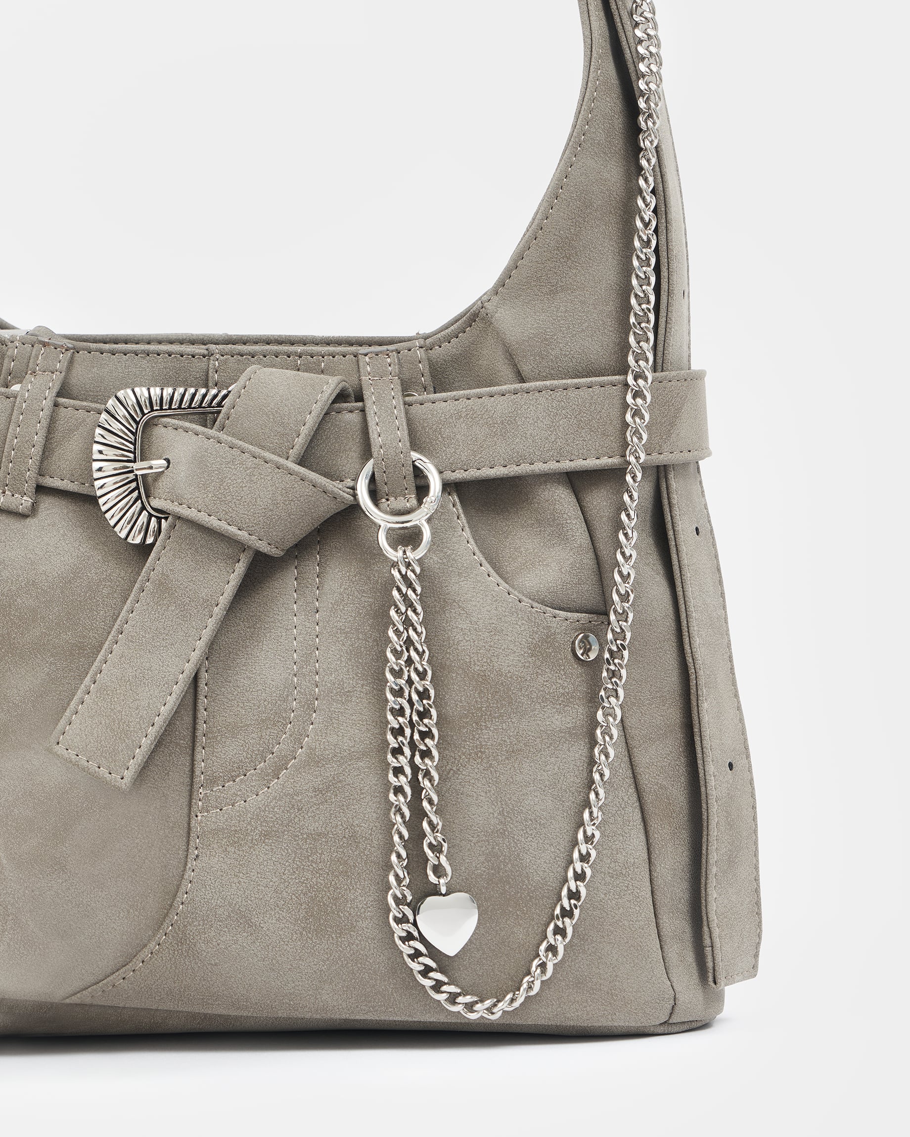 Сумка из экокожи с карманами и декоративным ремнем и цепочкой в цвете песочный