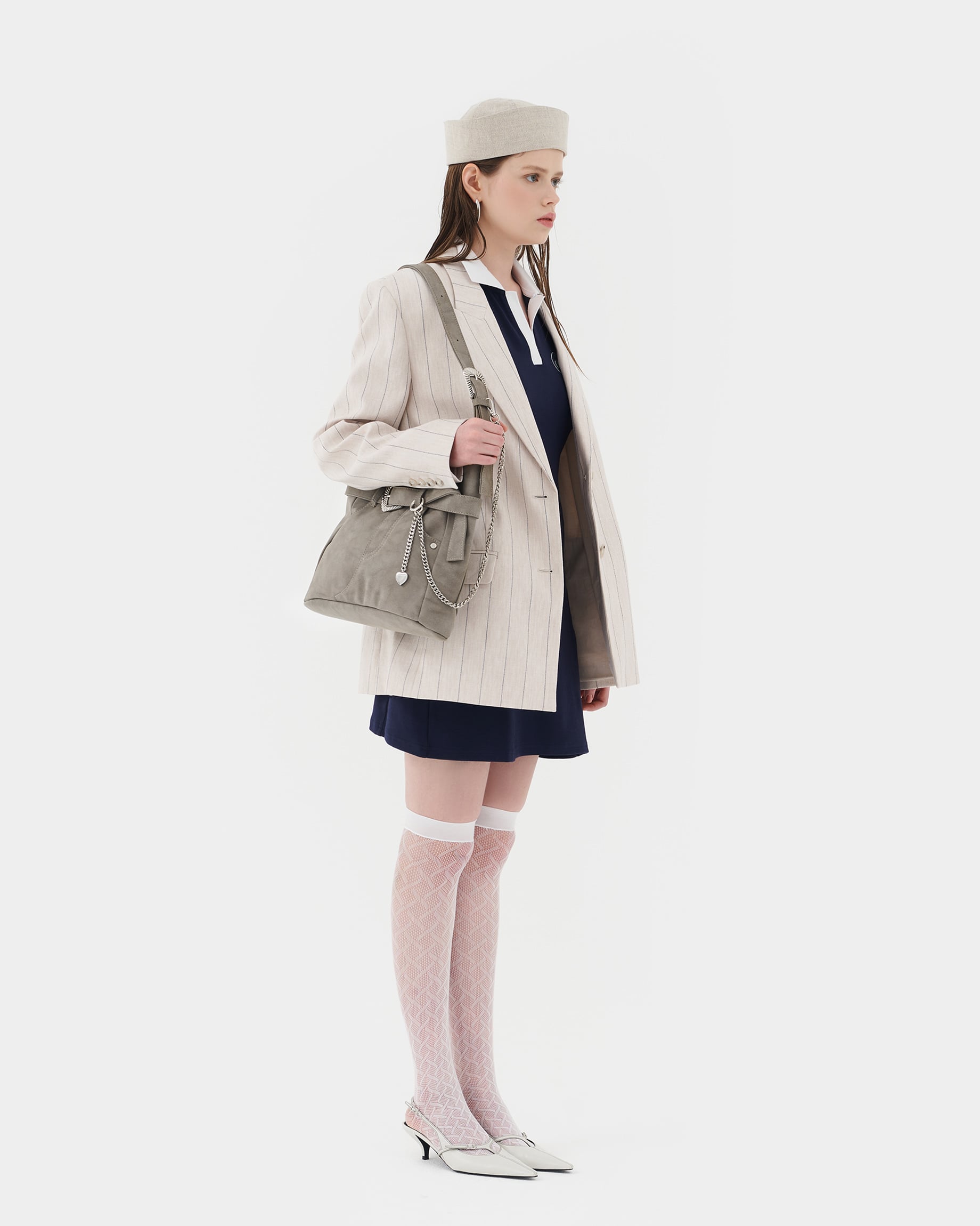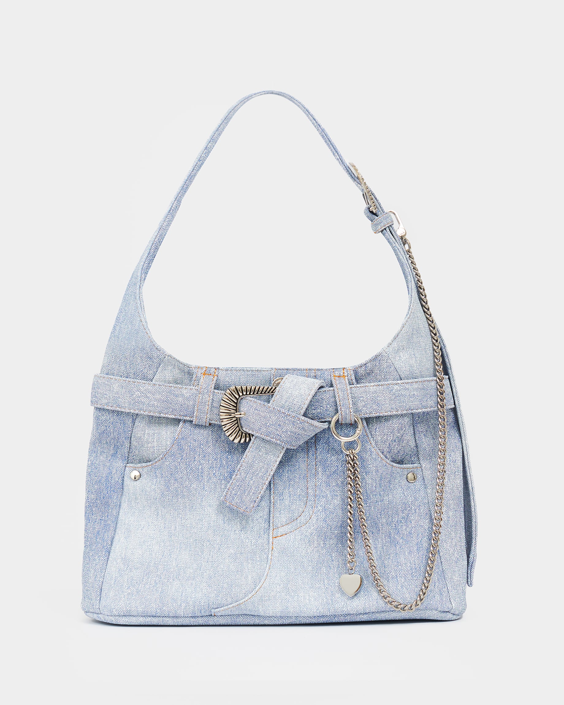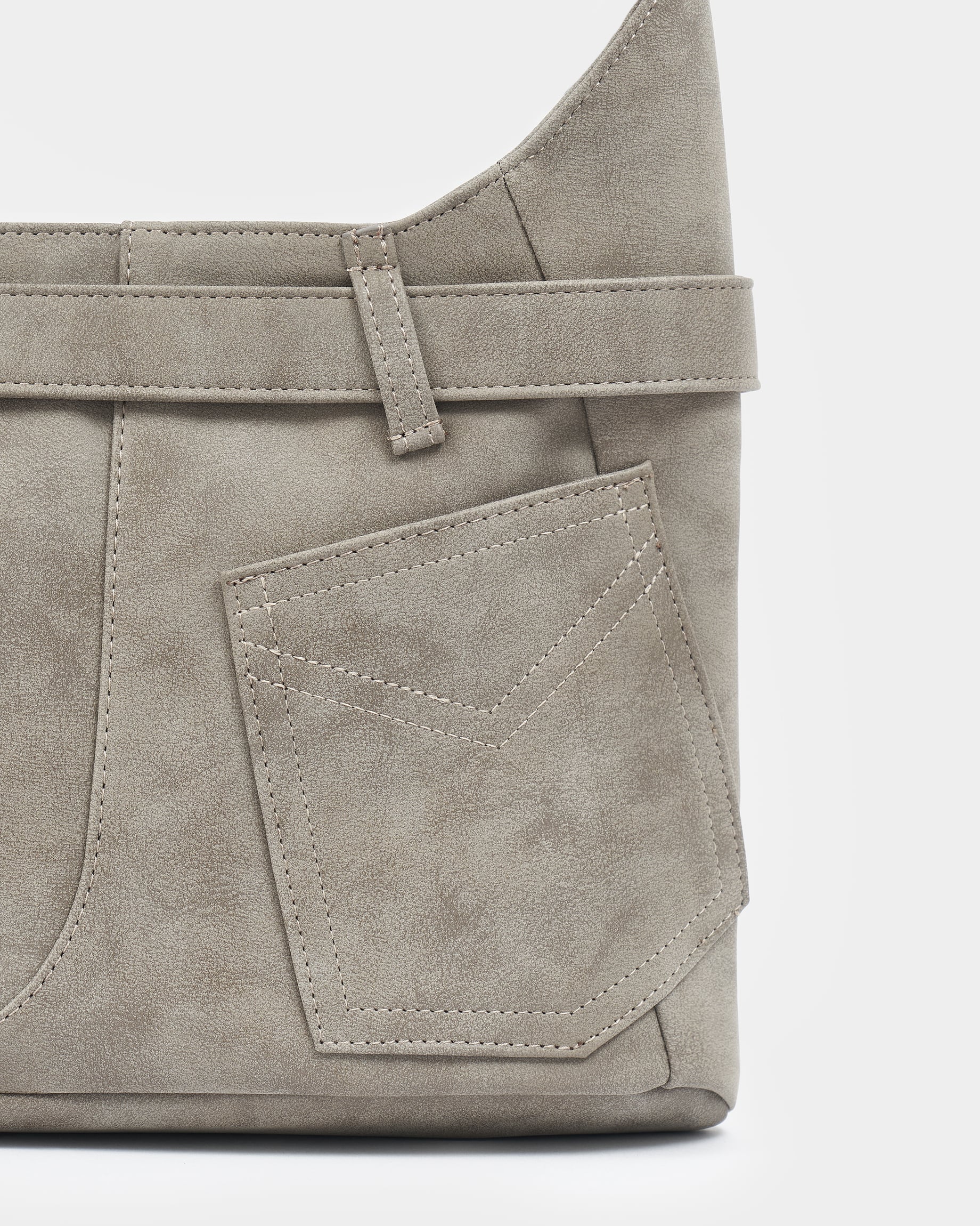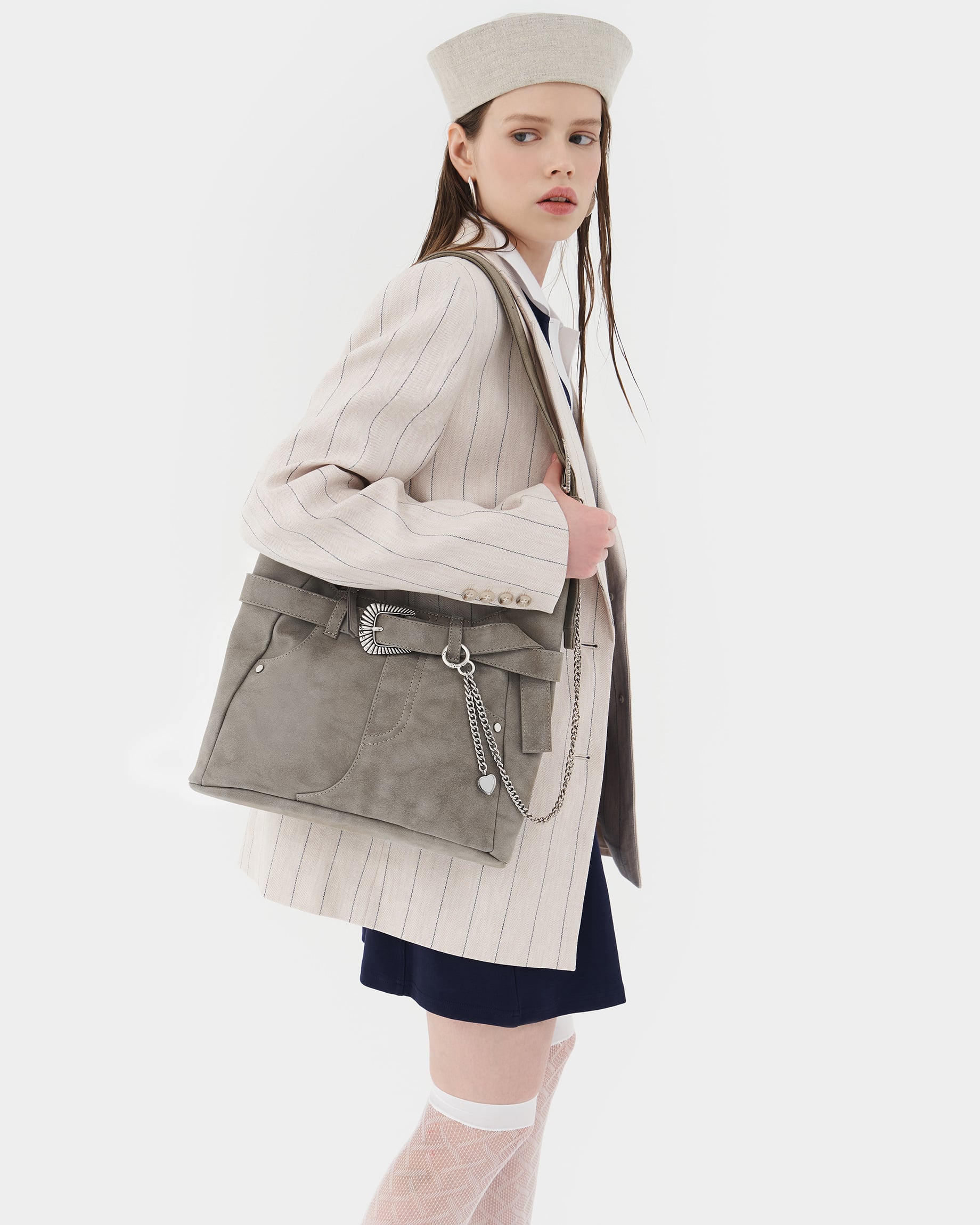 Сумка из экокожи с карманами и декоративным ремнем и цепочкой в цвете песочный
