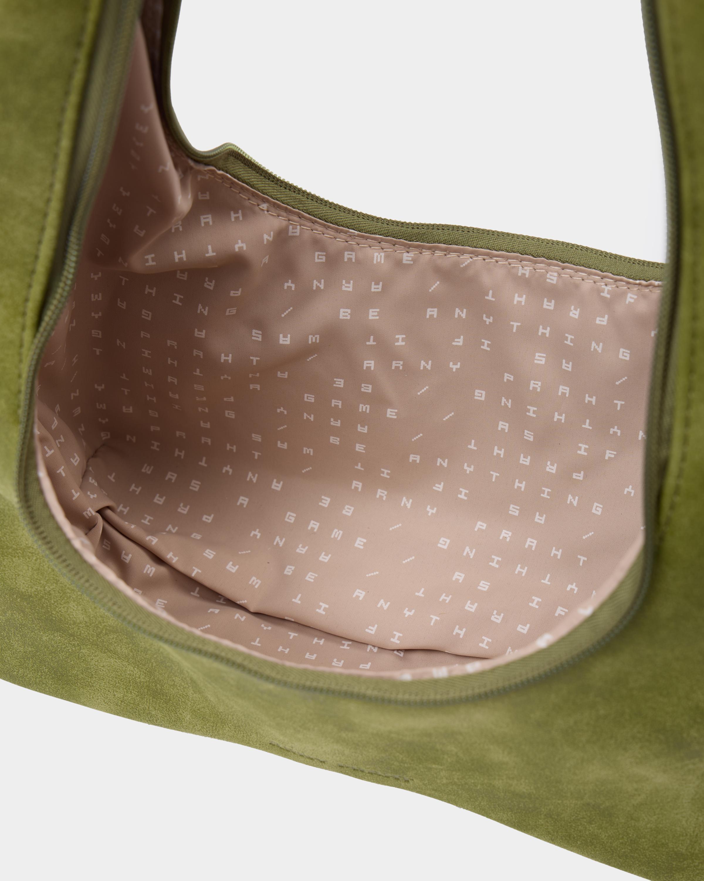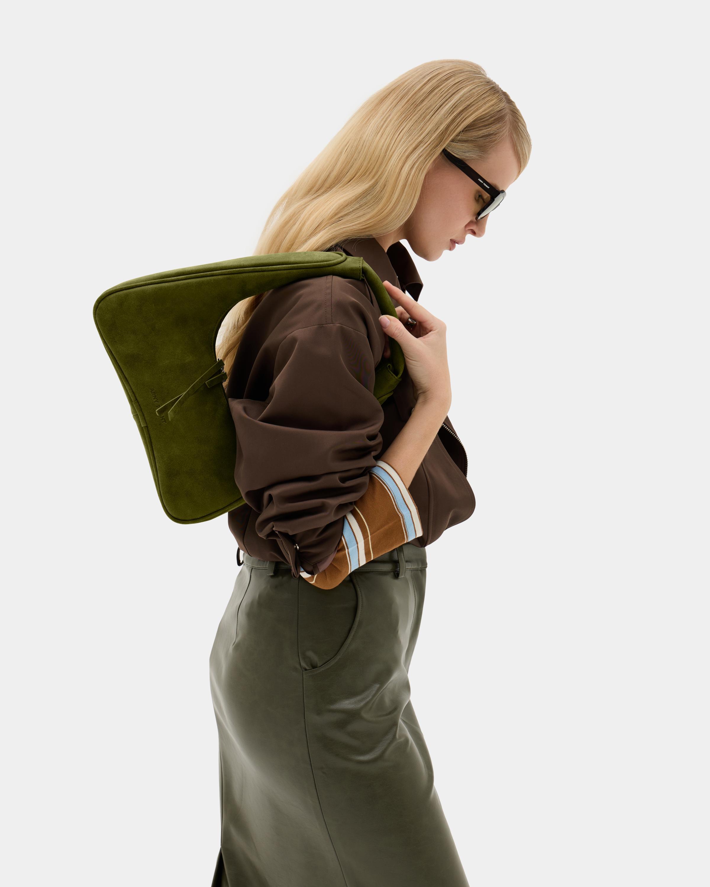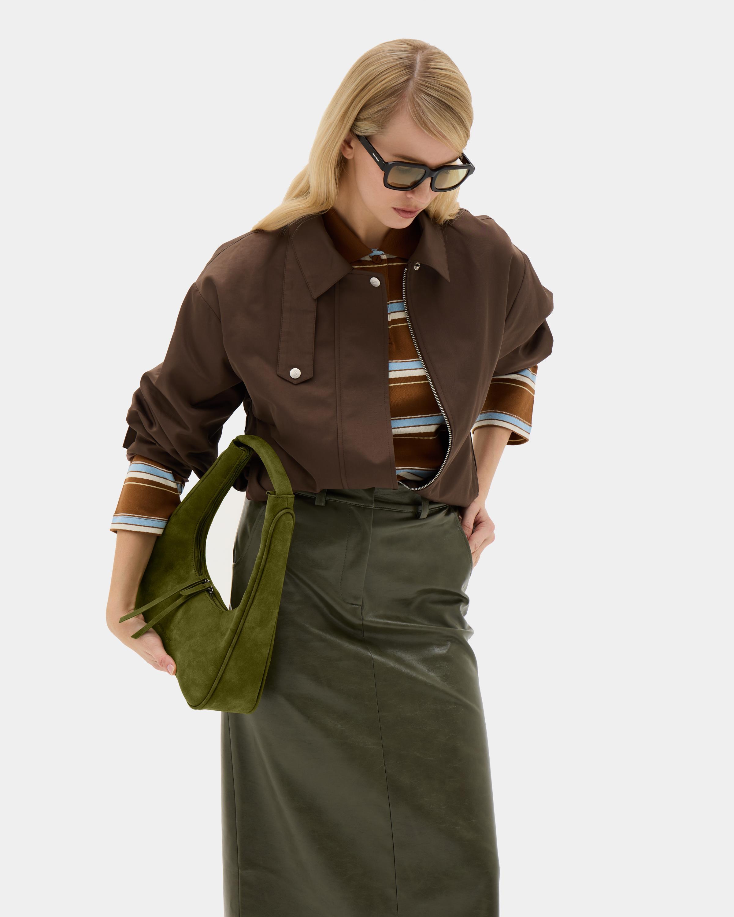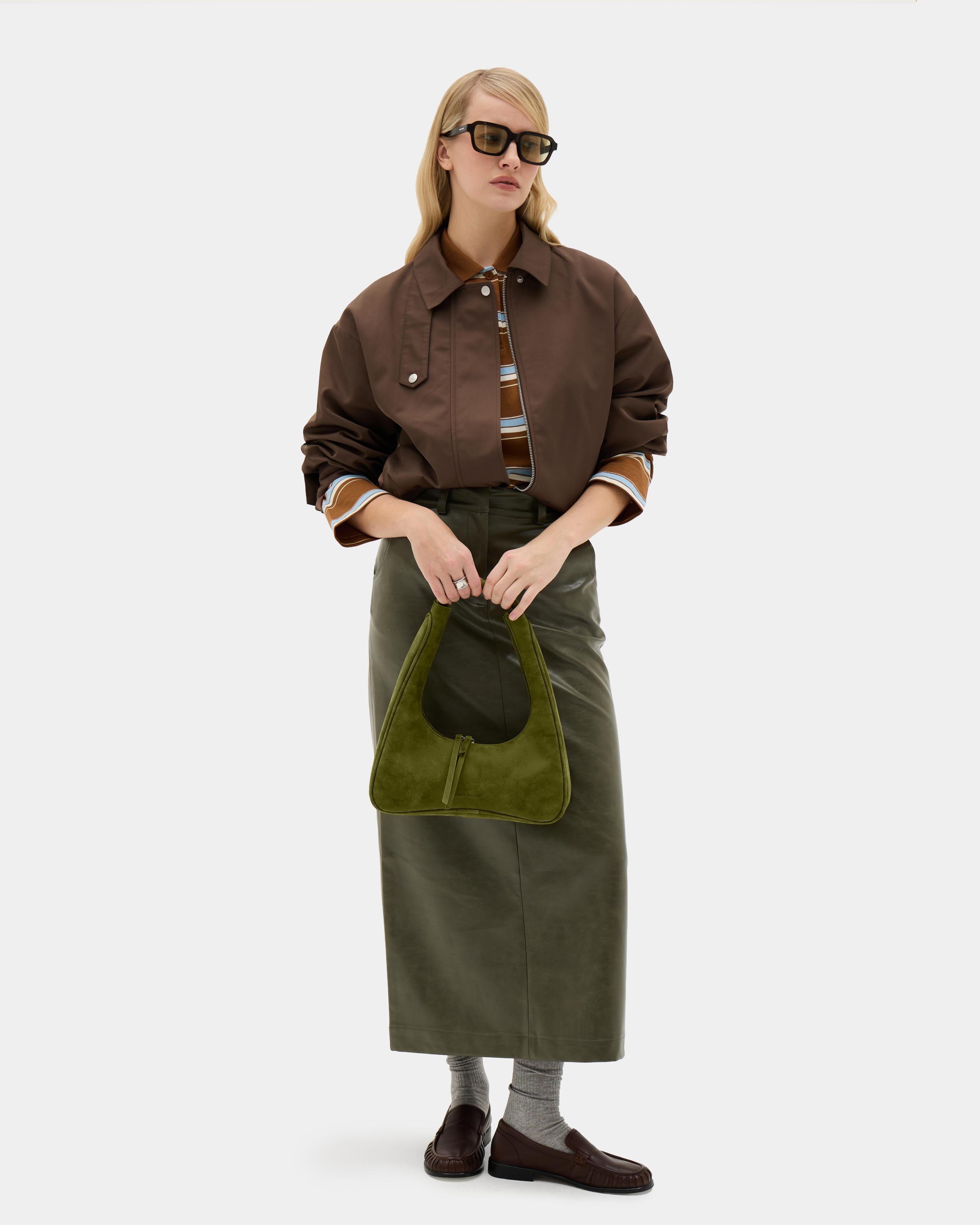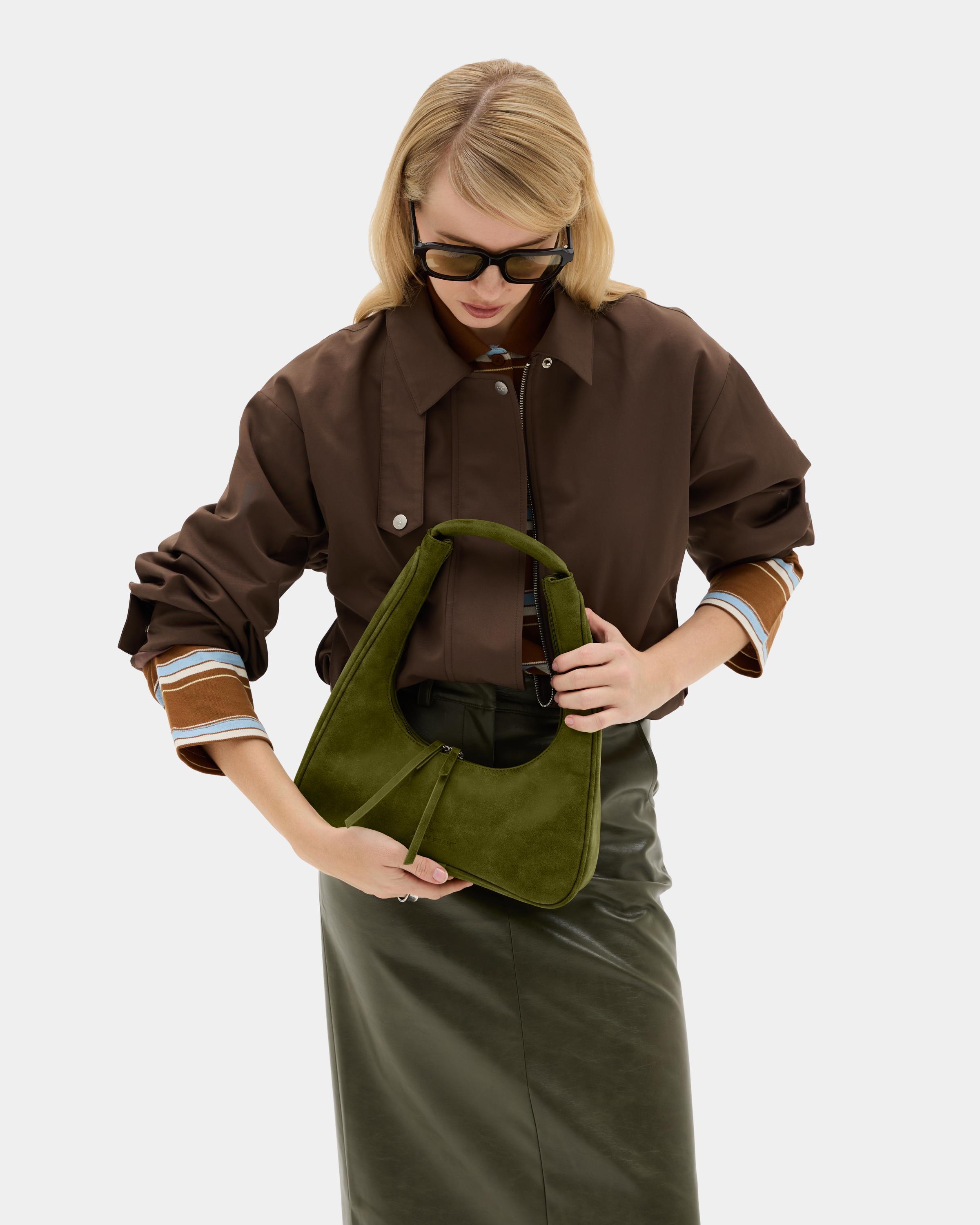 Миниатюрная сумка с фигурным дном из замшевой экокожи