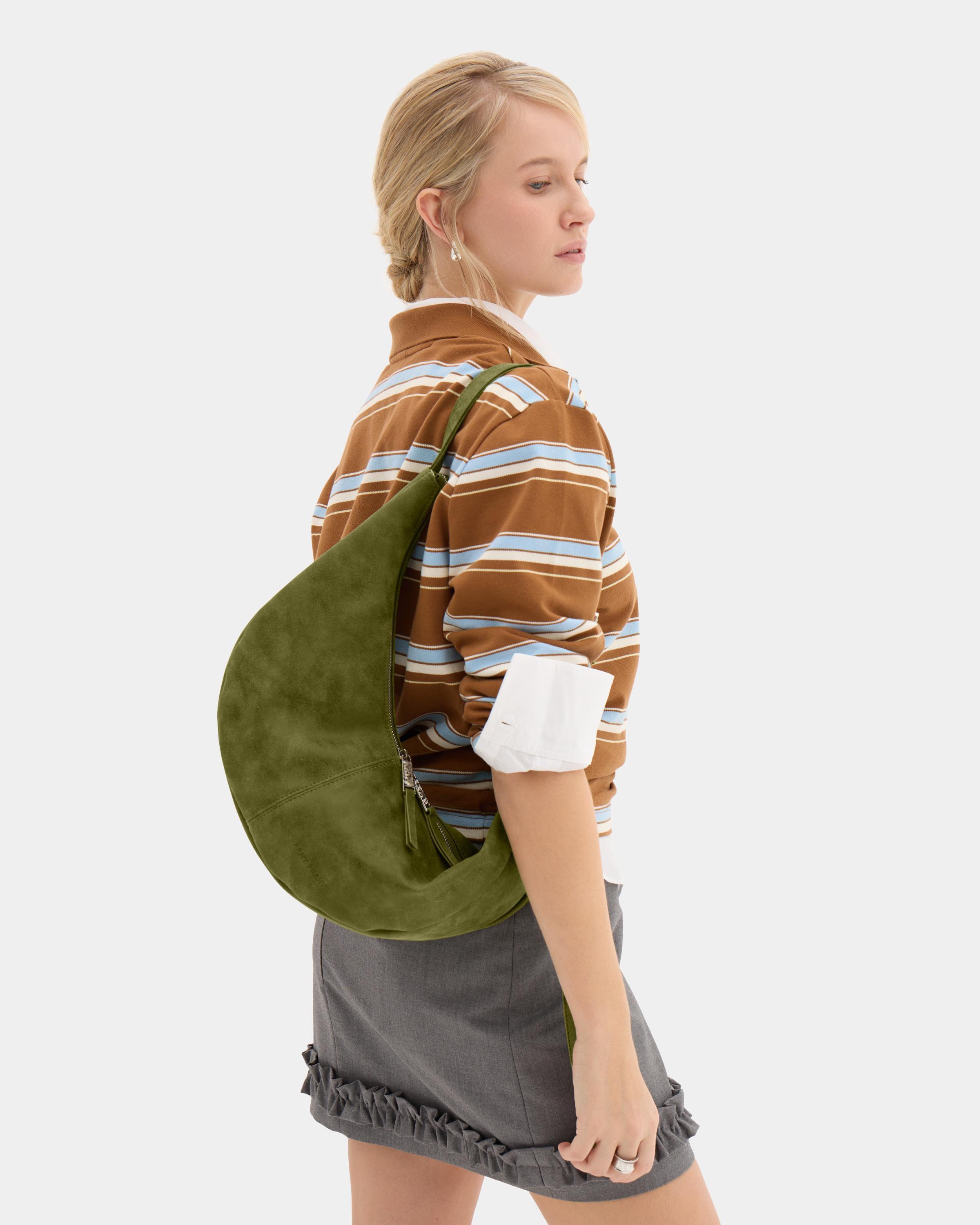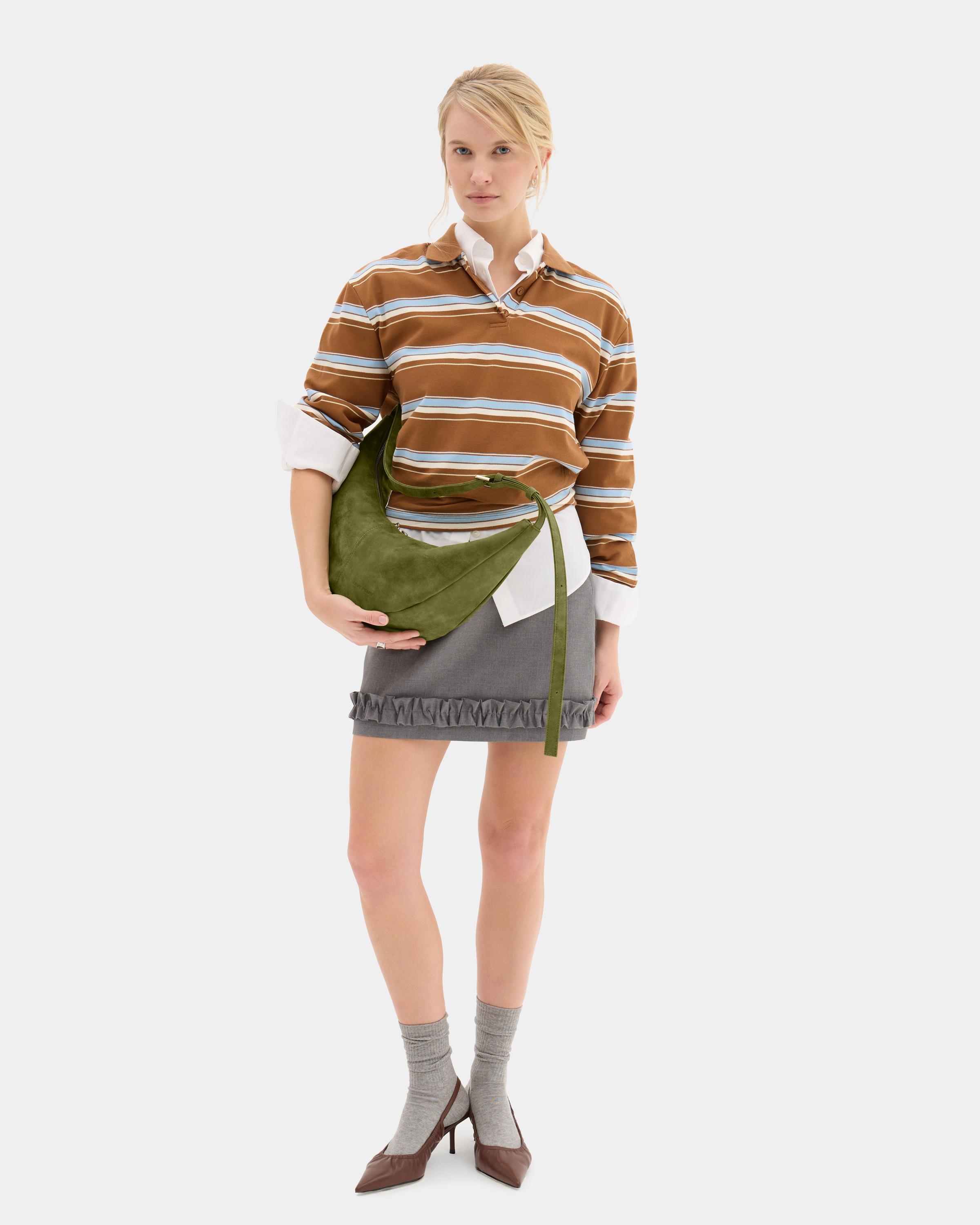 Милейший круассанчик)) Уже все подруги спросили, где купила такую замшевую красоту. Нравится, что у сумочки регулируется длина ремня и мягкая форма. Ее можно прилично наполнить, если нужно, а пустая она совсем малышка под мышку. В общем, универсальная штучка ))
