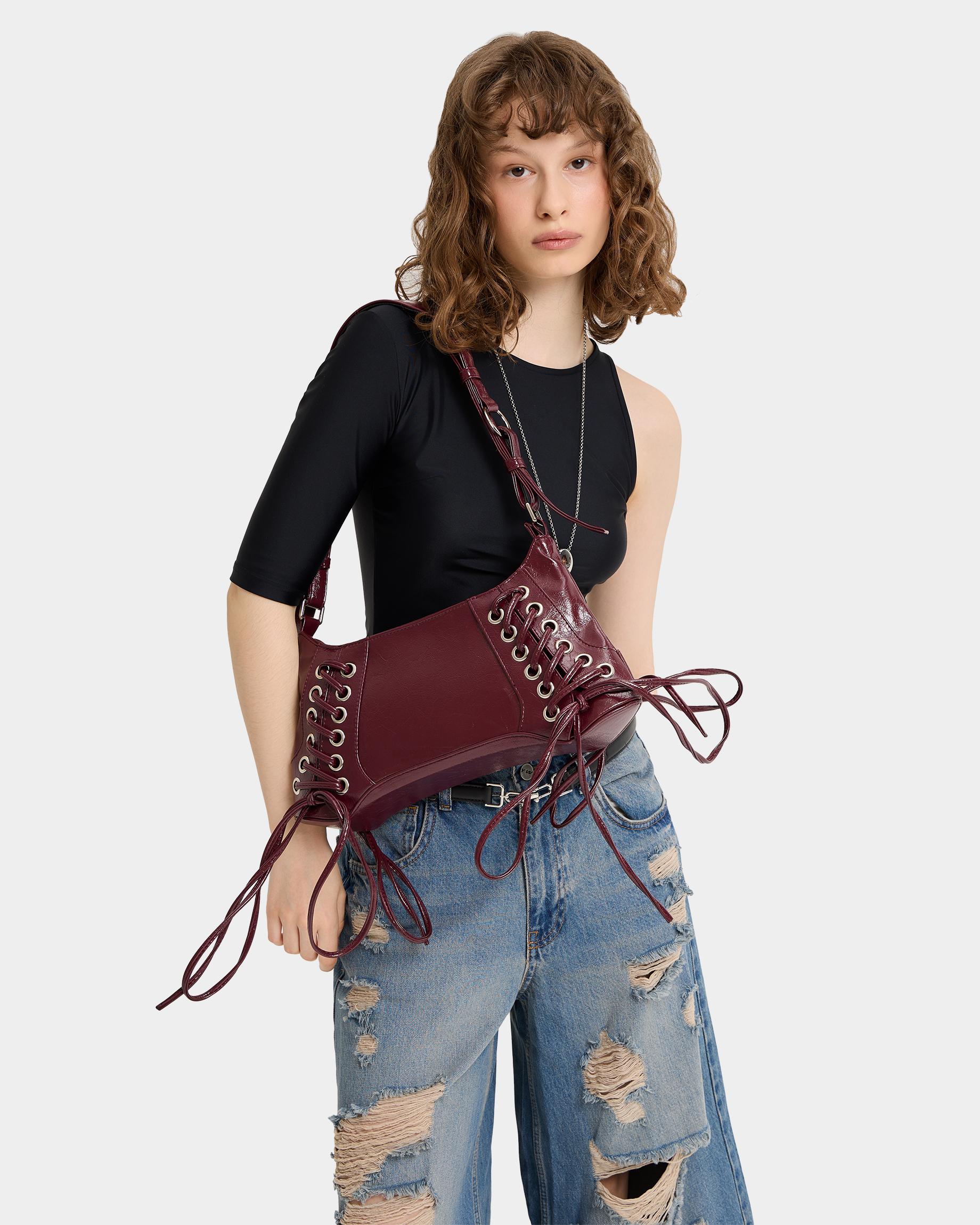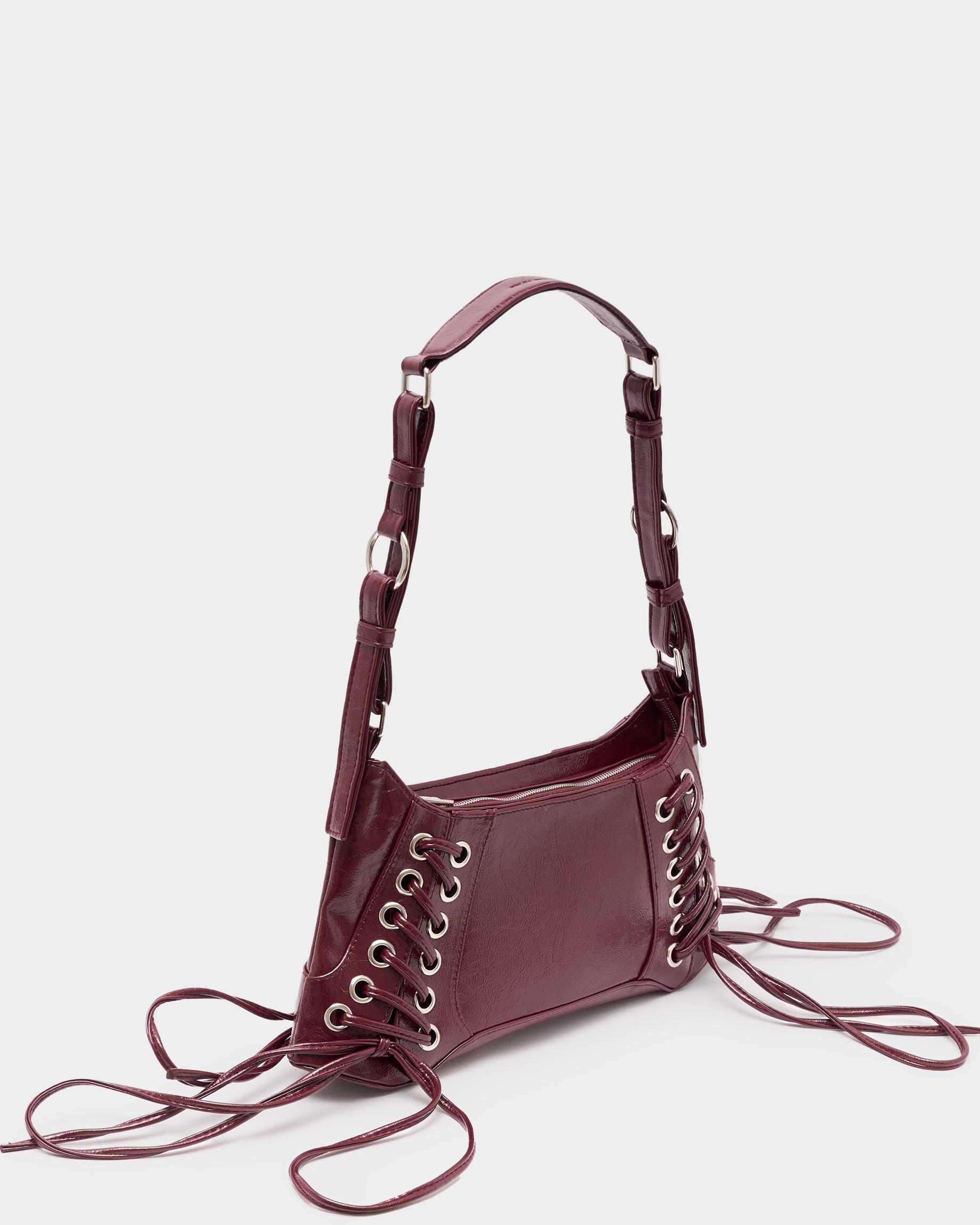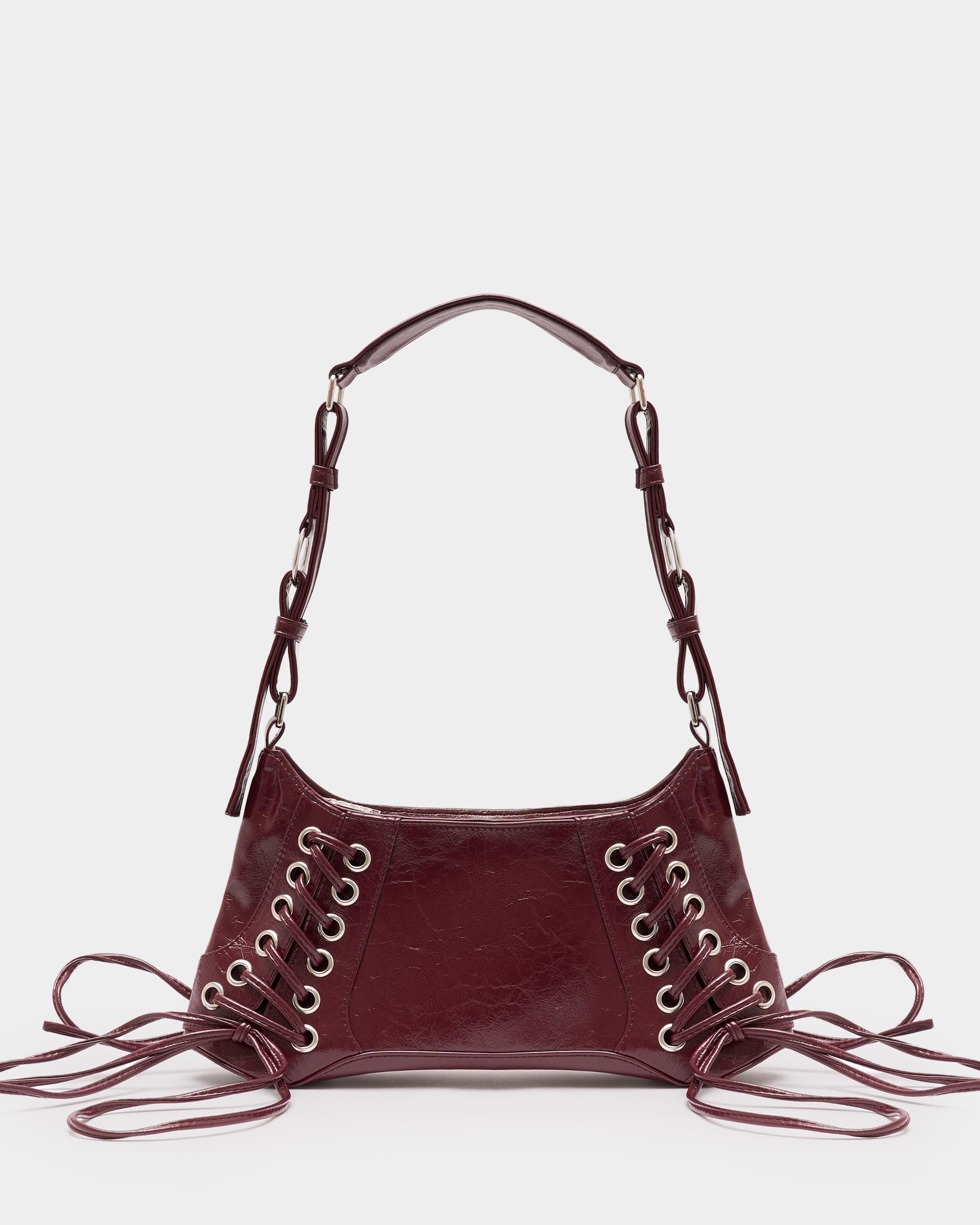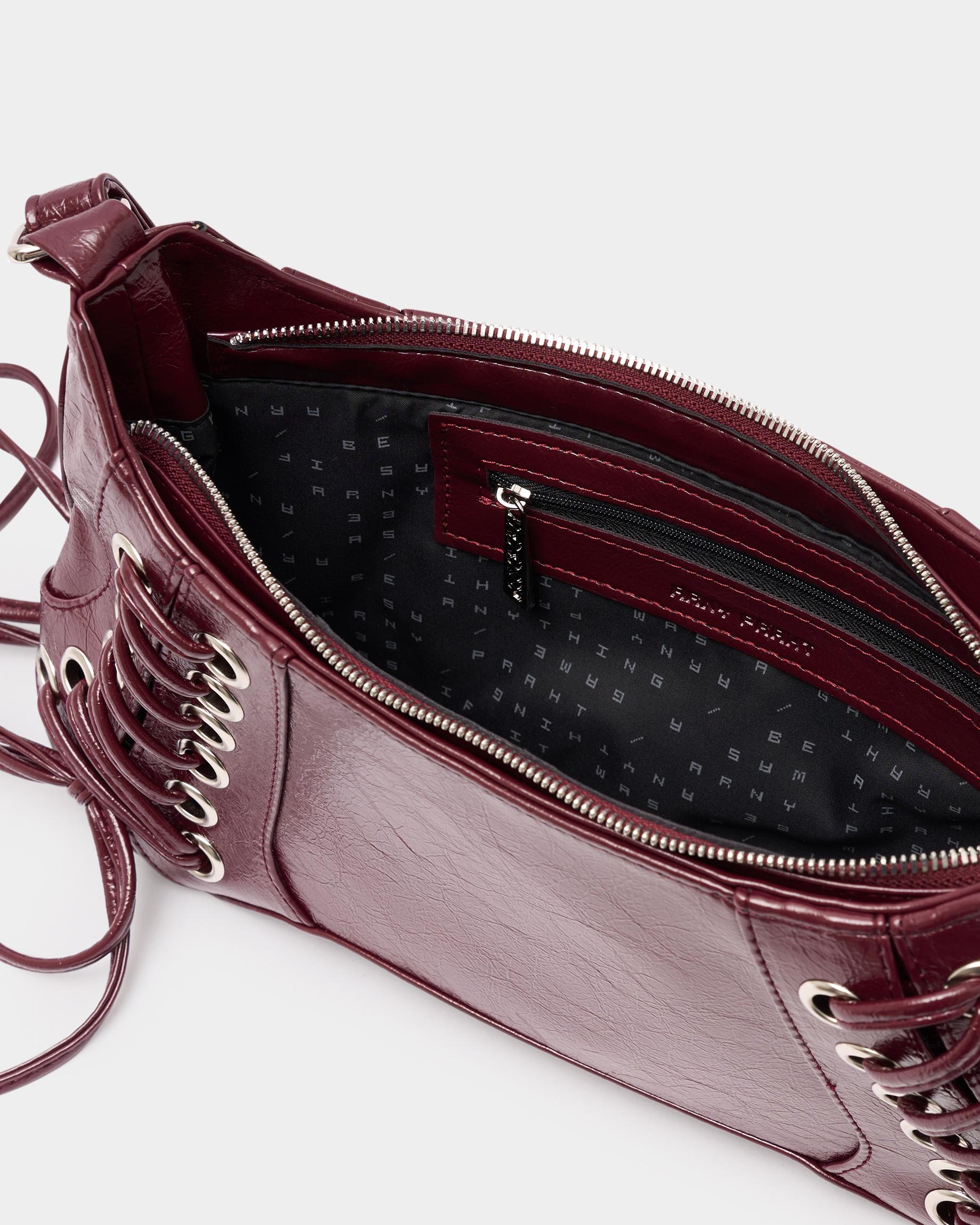 Сумка-багет из лаковой экокожи с широким ремнем и декоративной шнуровкой