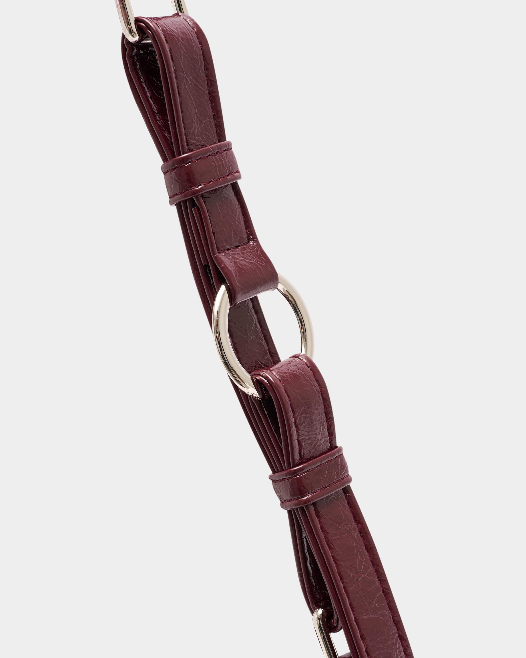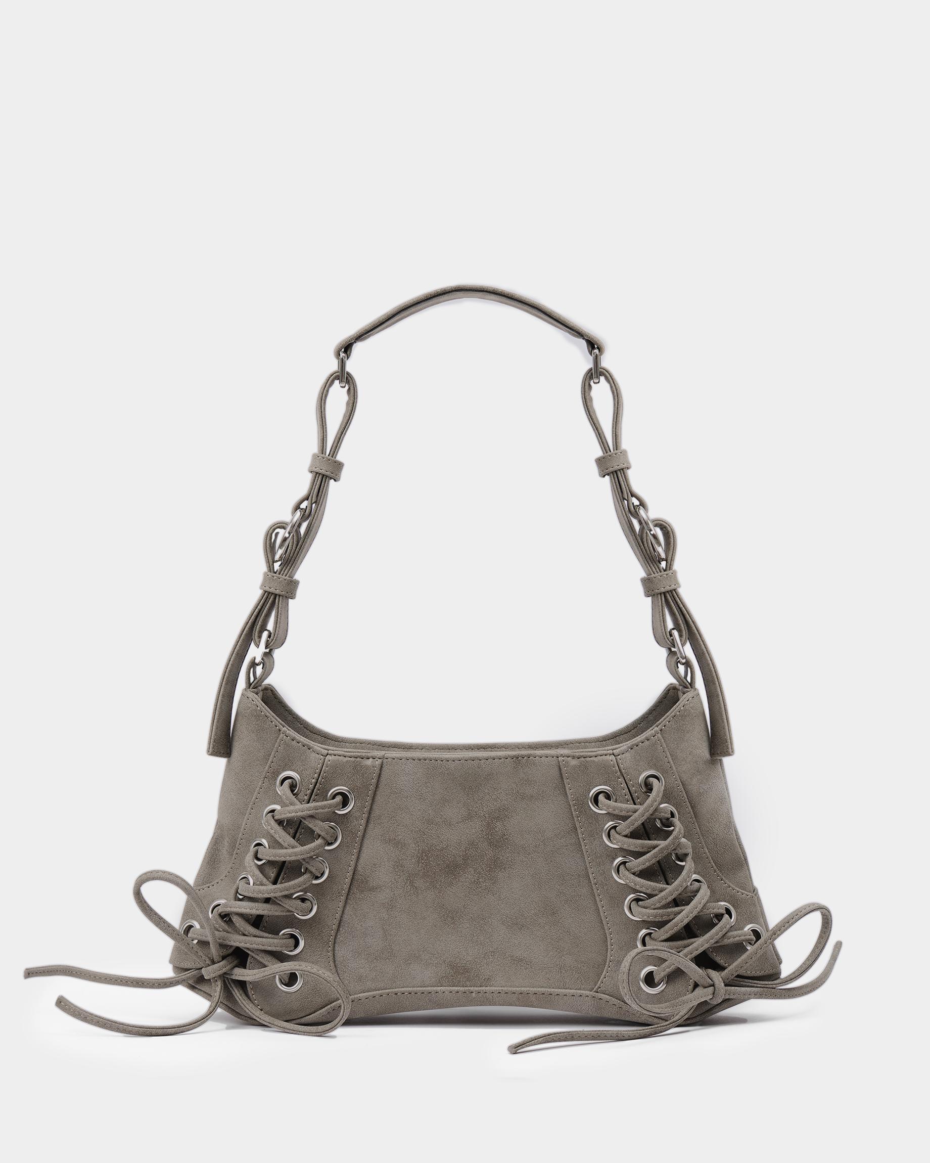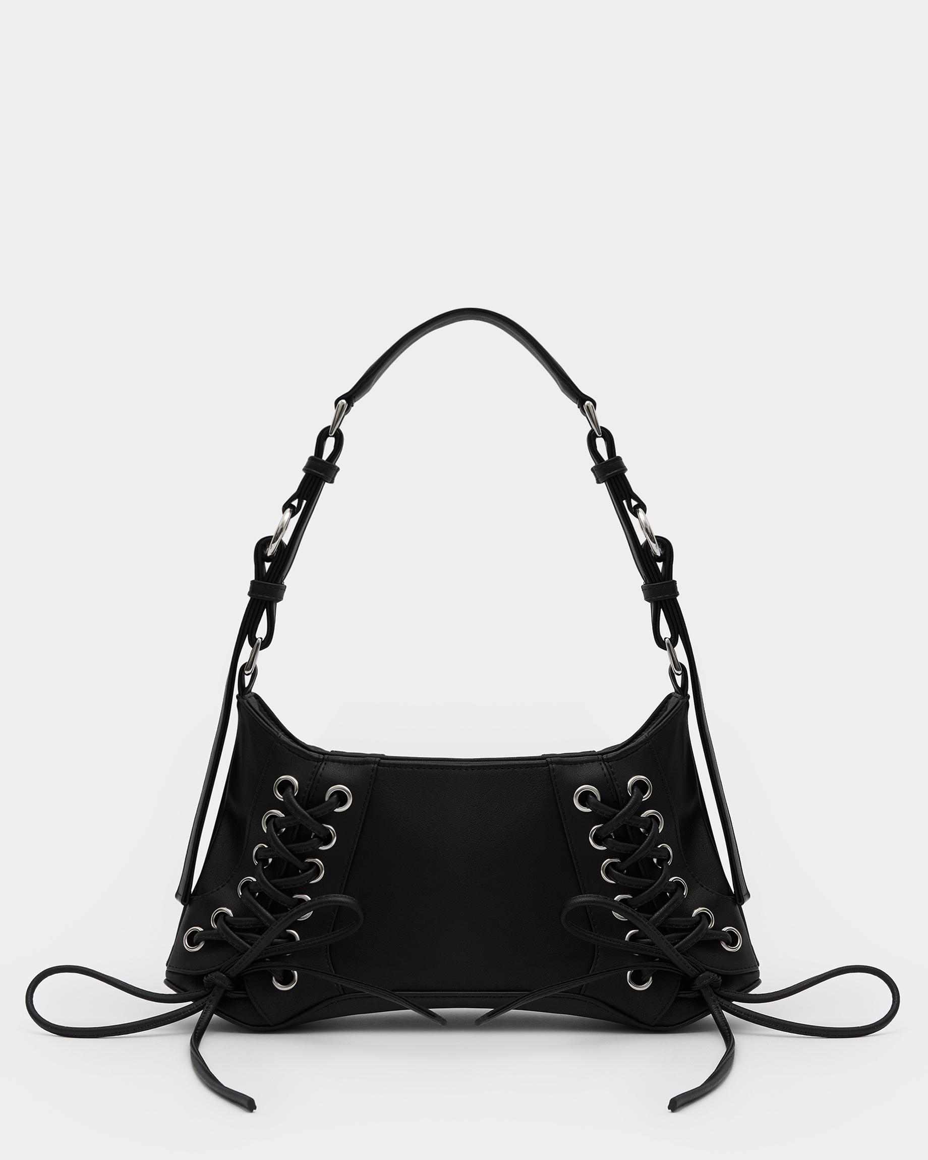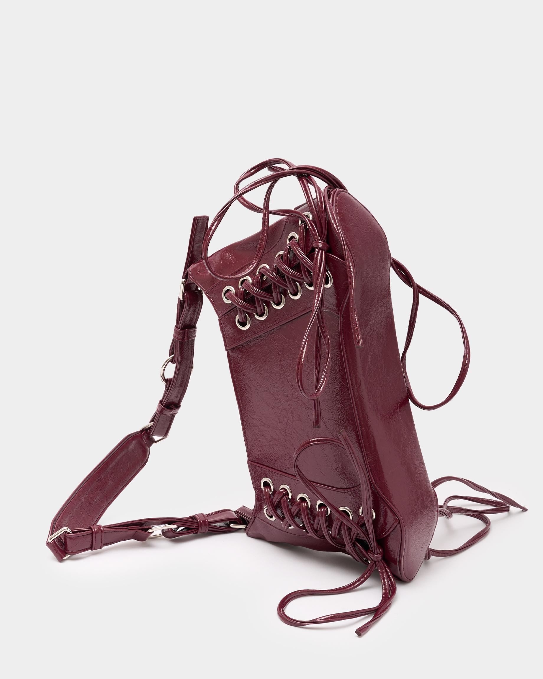 Сумка-багет из лаковой экокожи с широким ремнем и декоративной шнуровкой