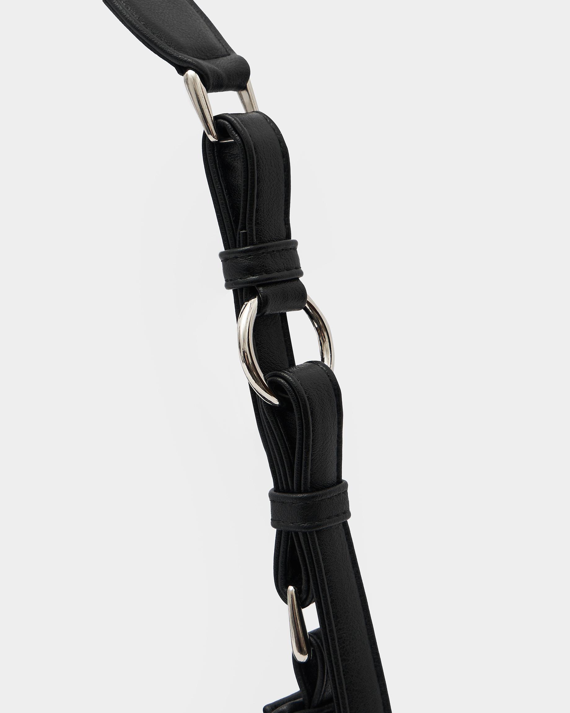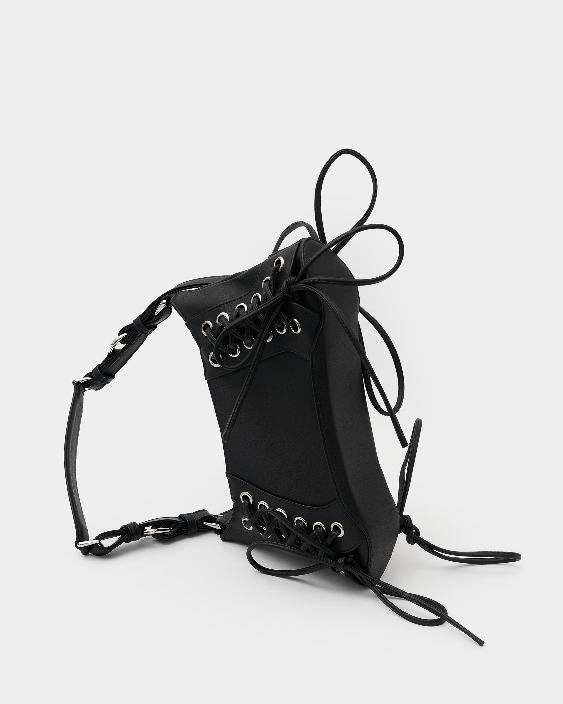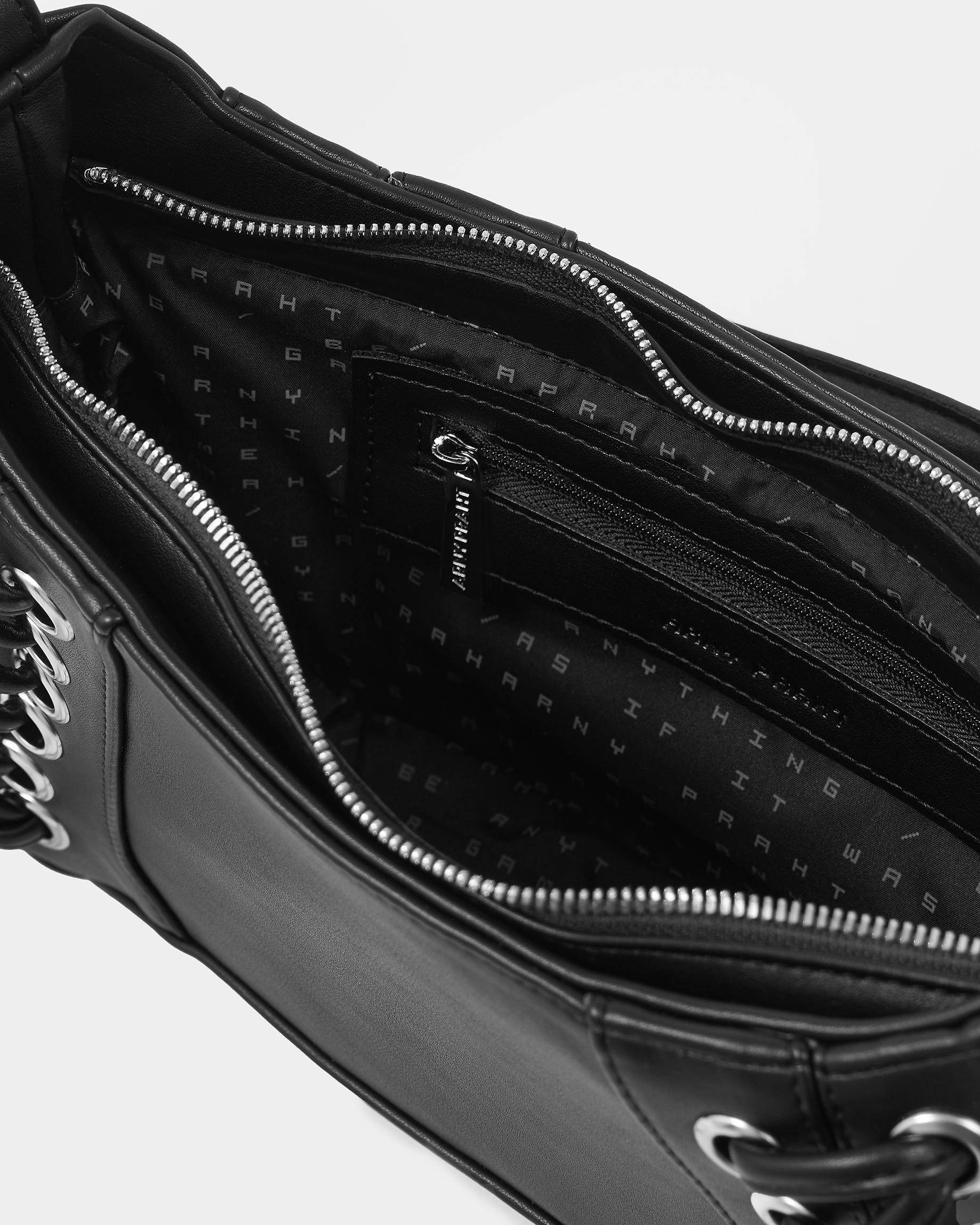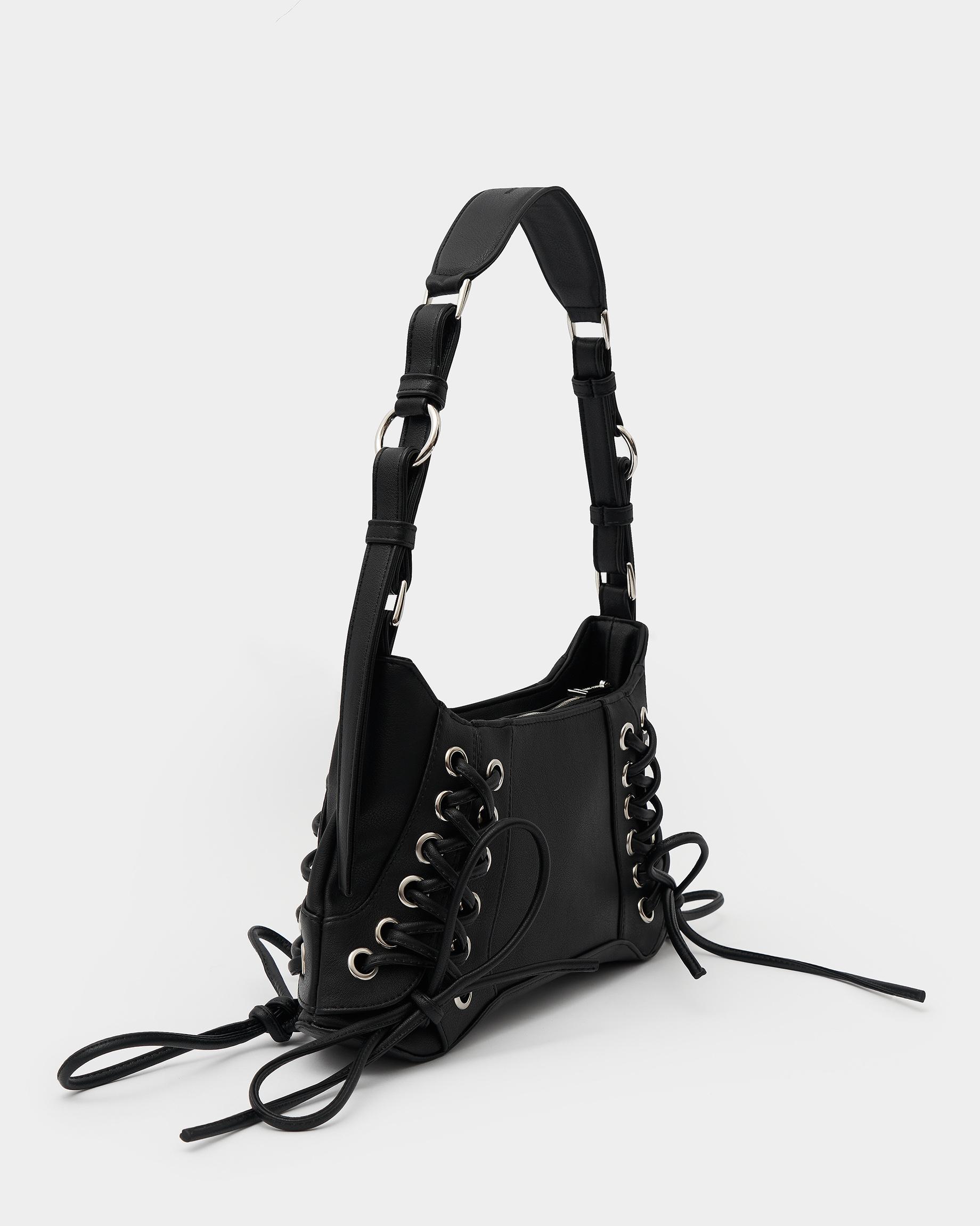 Сумка-багет черного цвета с широким ремнем и декоративной шнуровкой шнуровкой