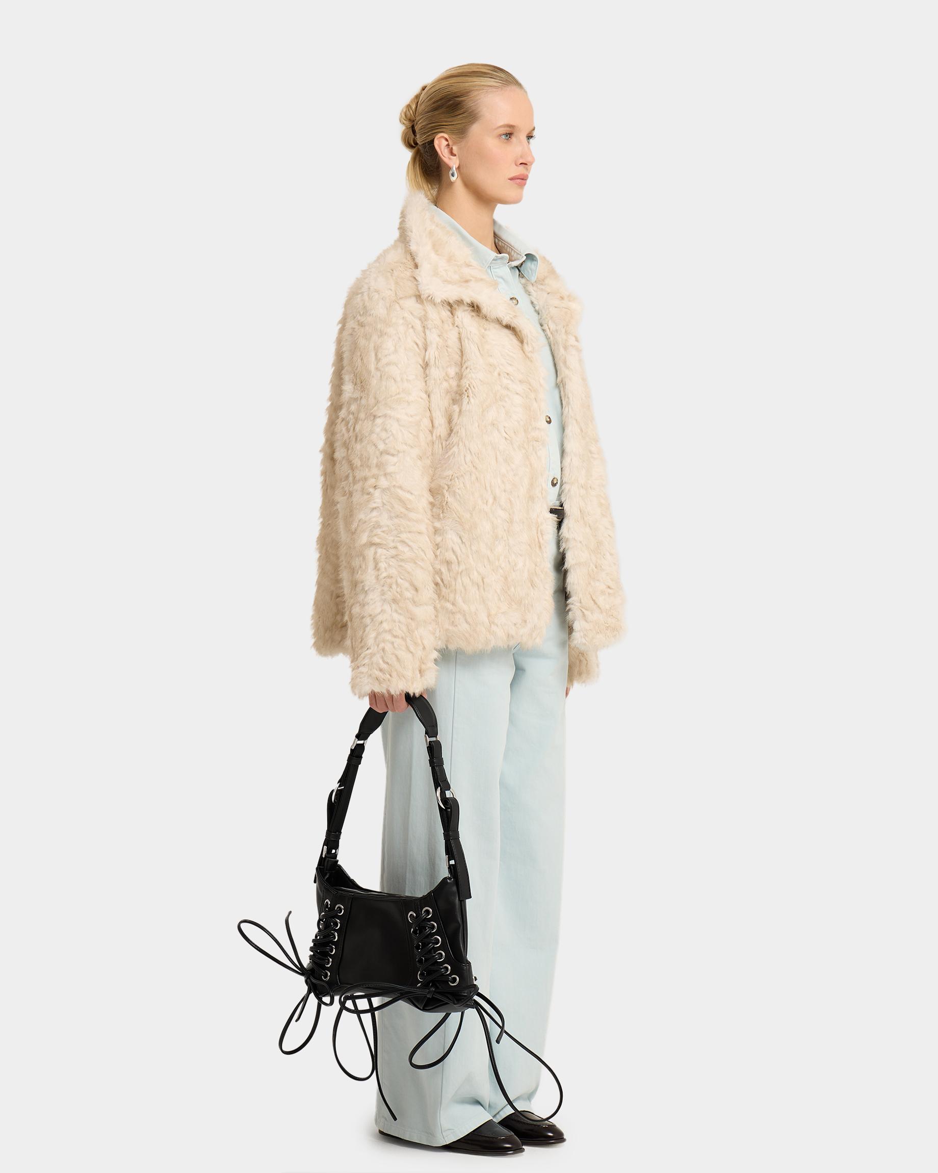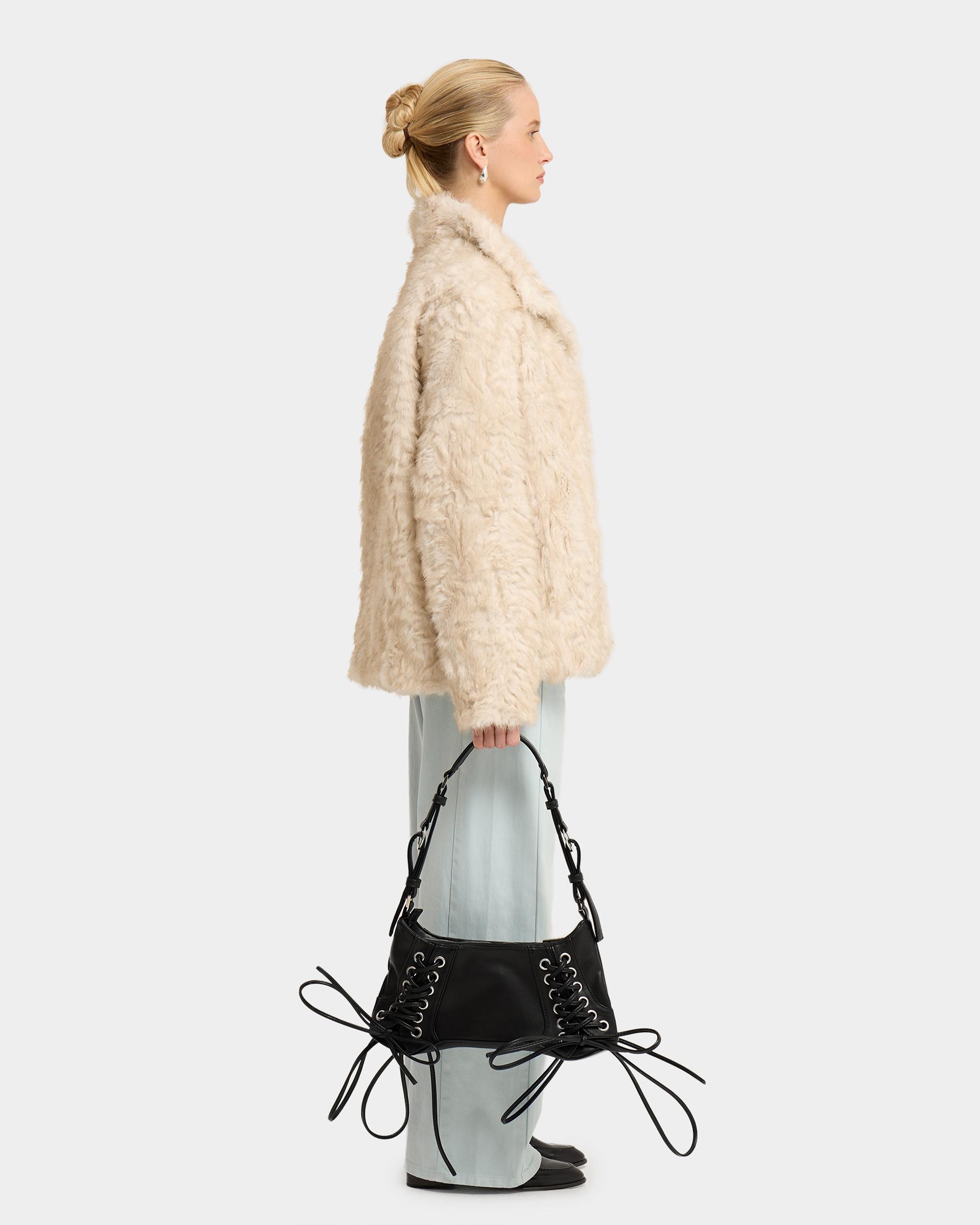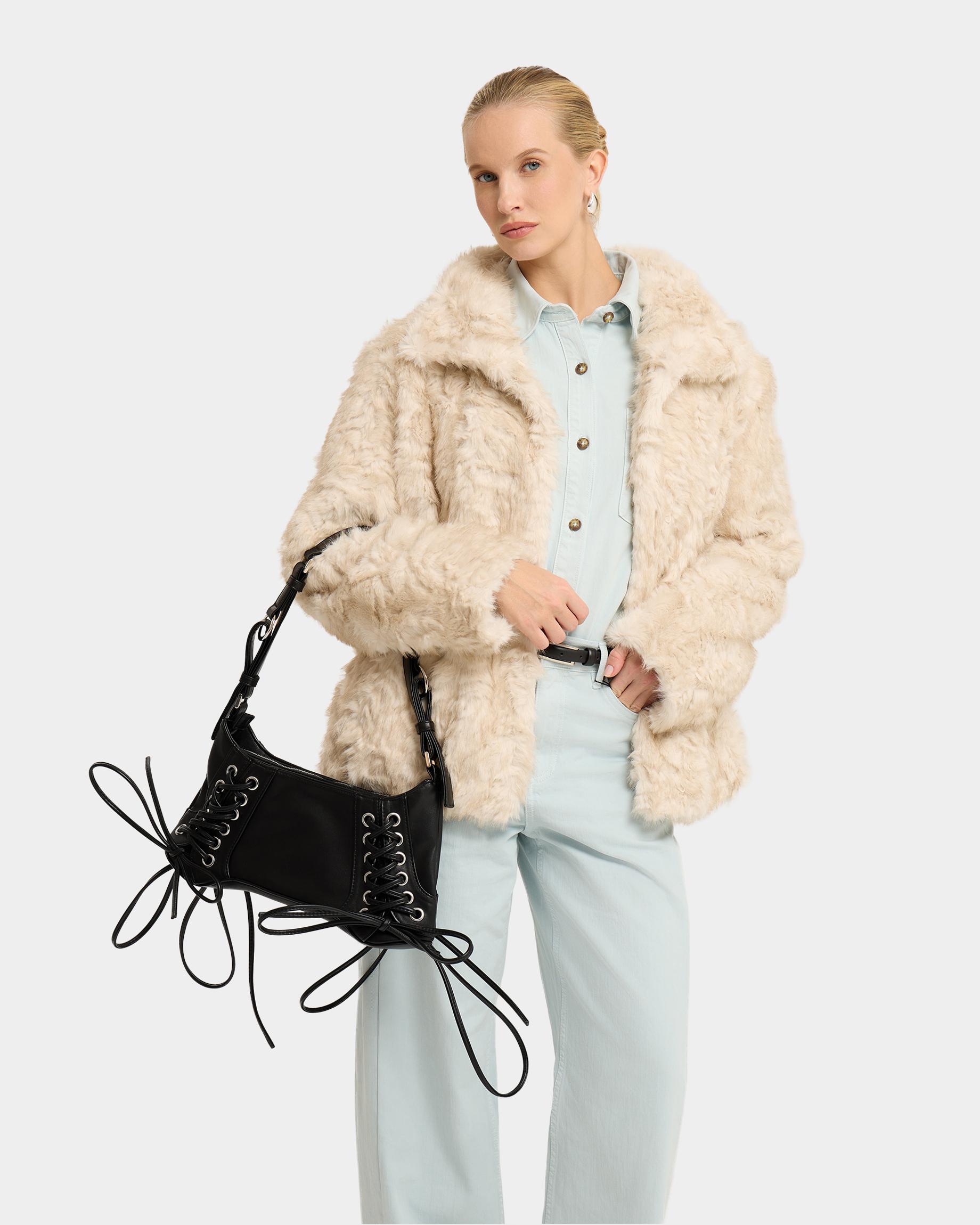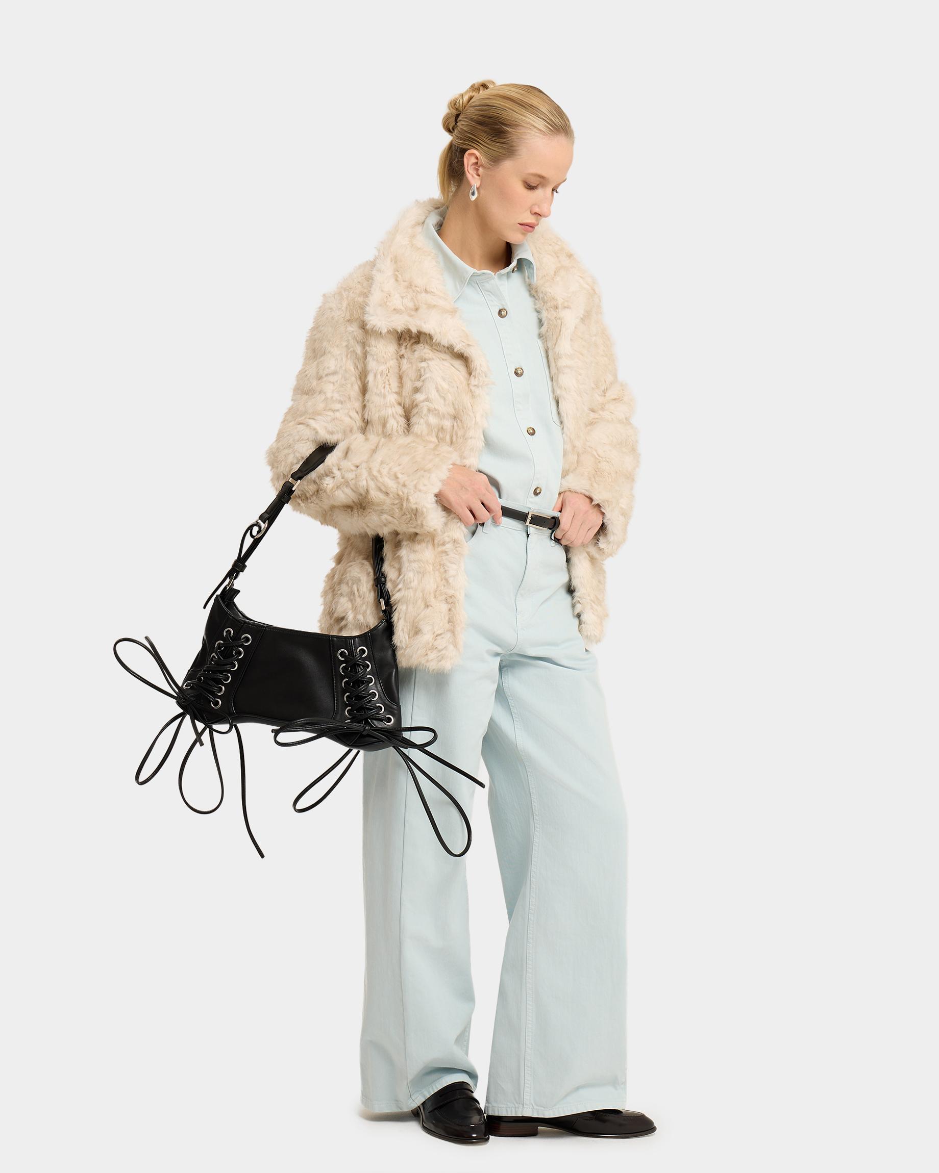 Сумка-багет черного цвета с широким ремнем и декоративной шнуровкой шнуровкой