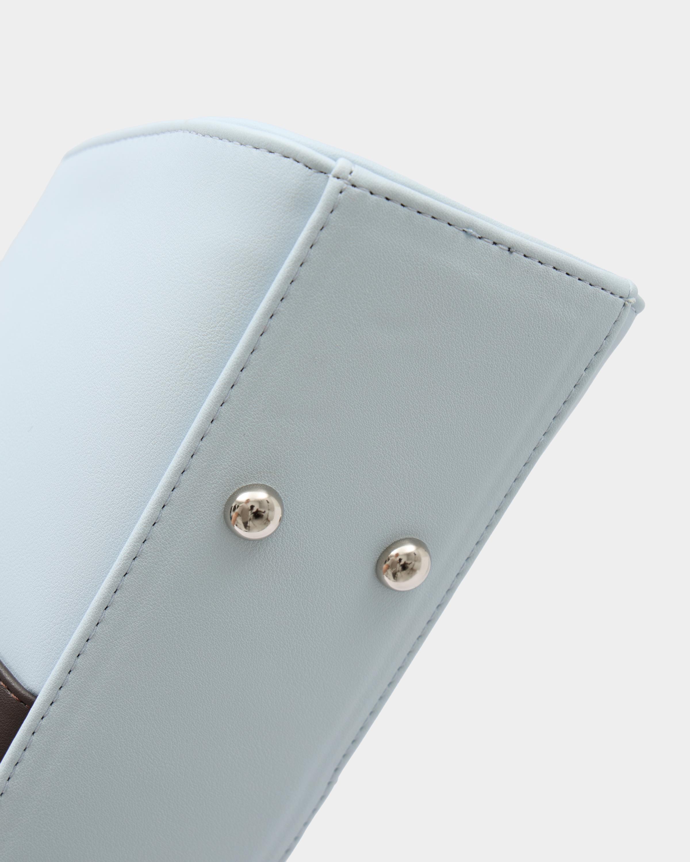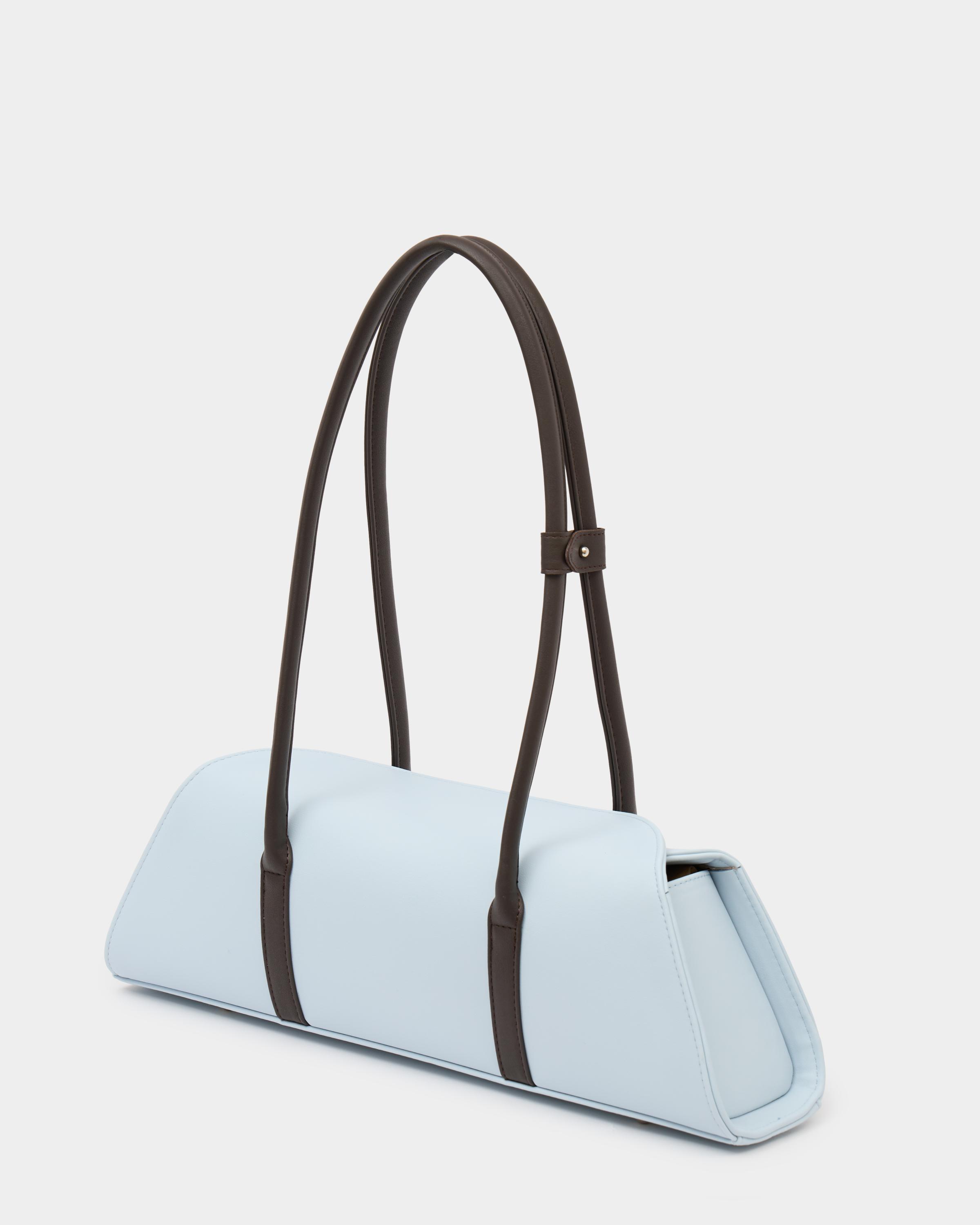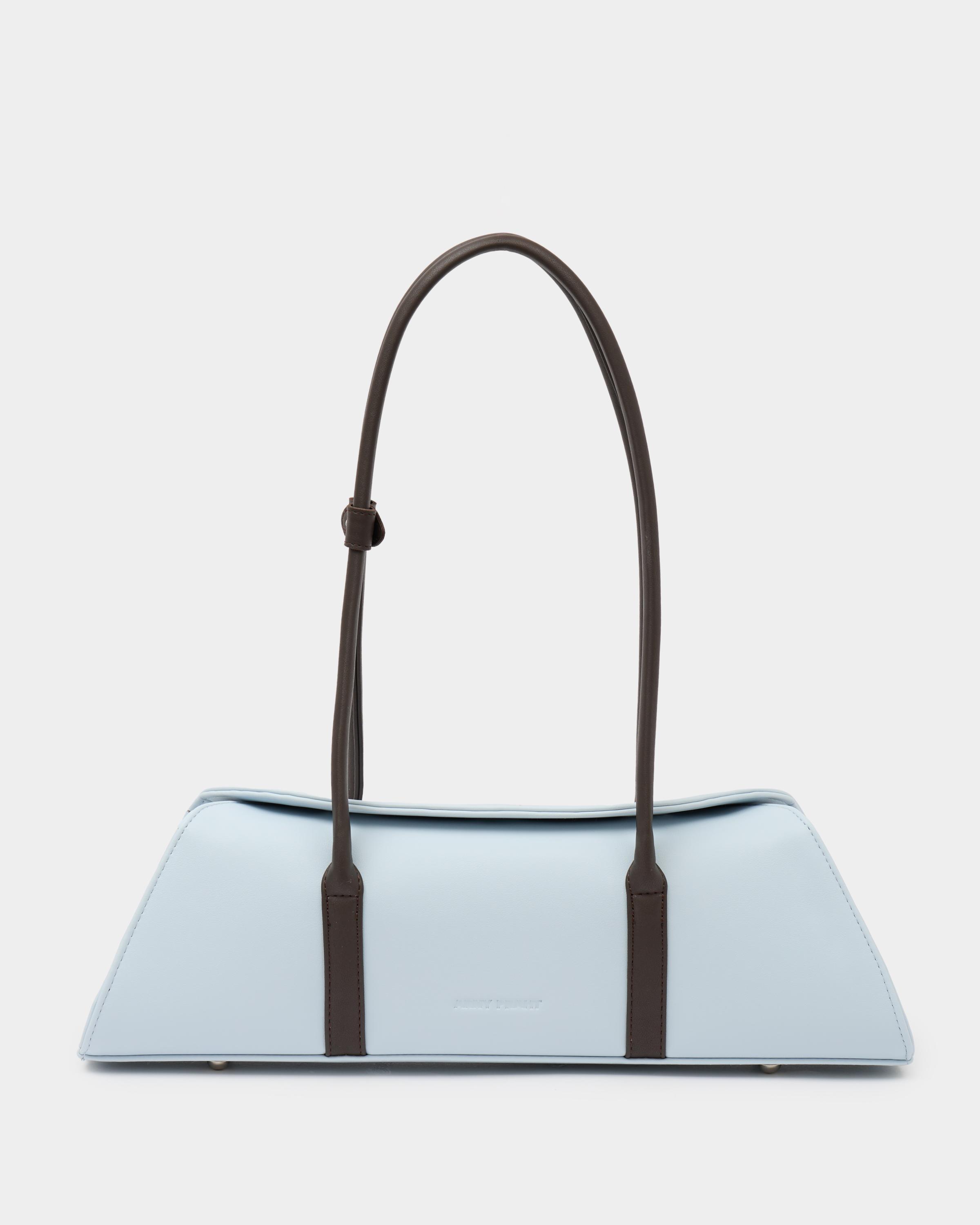 Каркасная сумка-такса с тонкими ручками из экокожи в сочетании цветов голубой и кофе