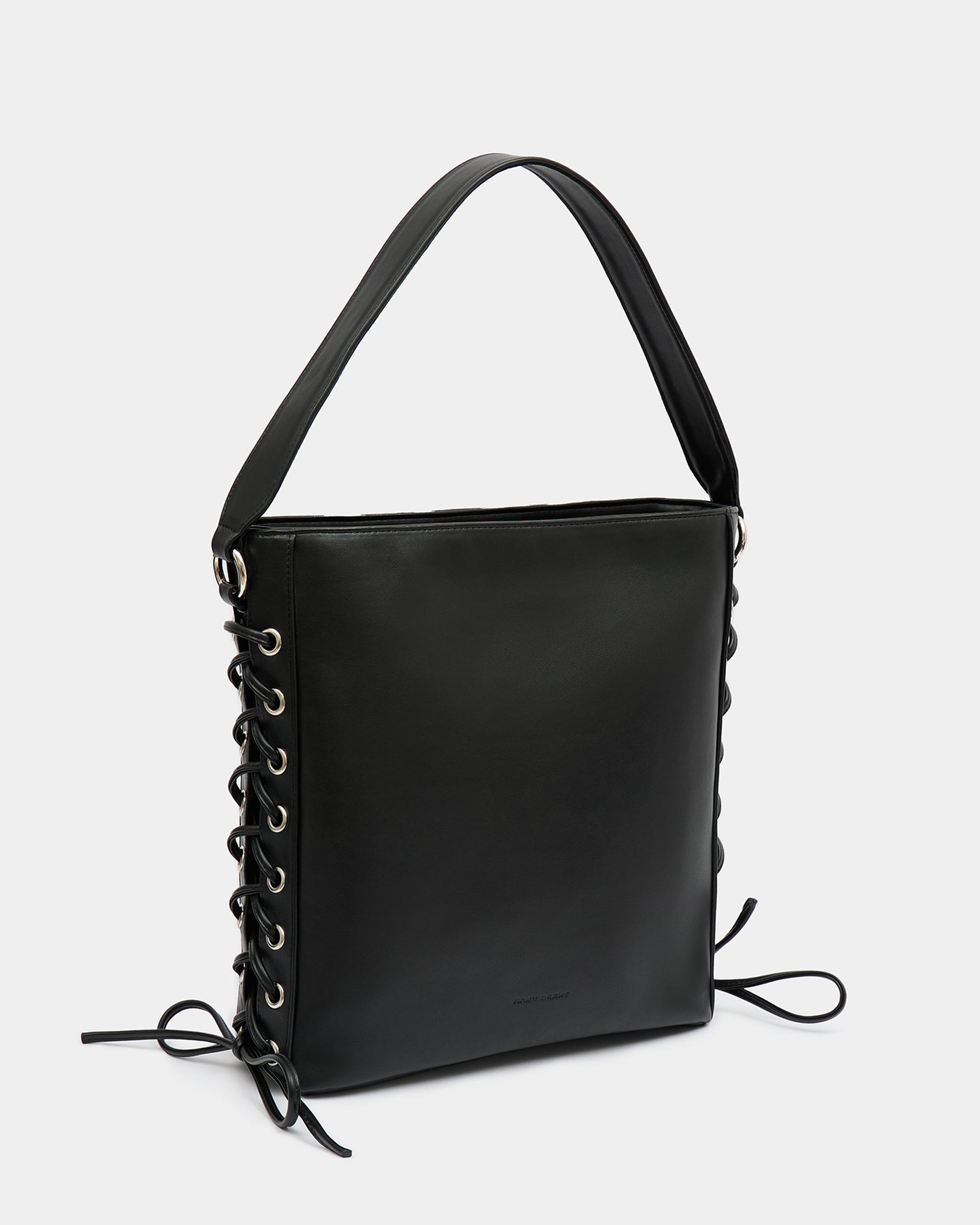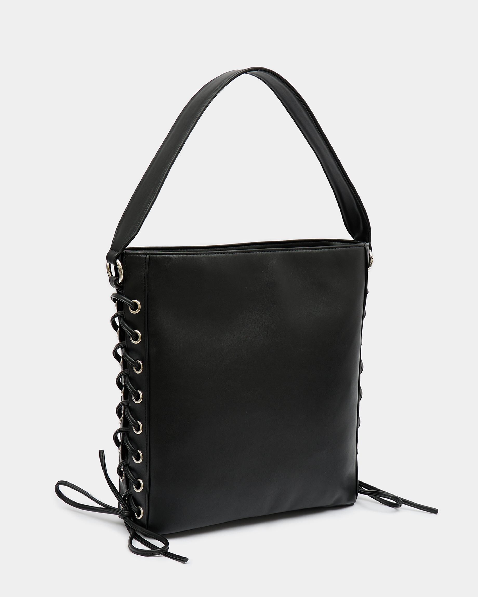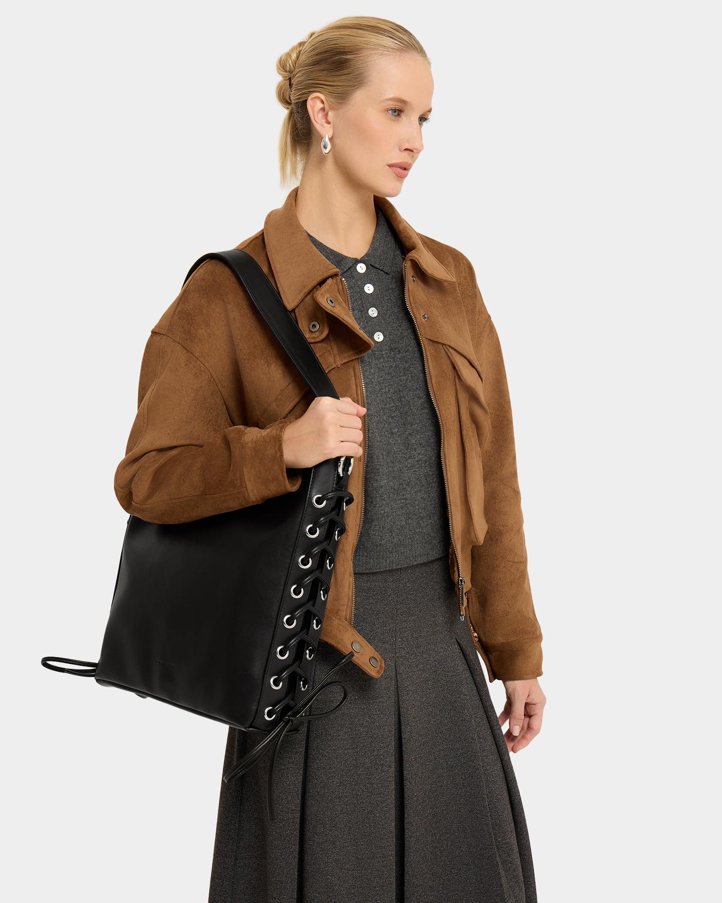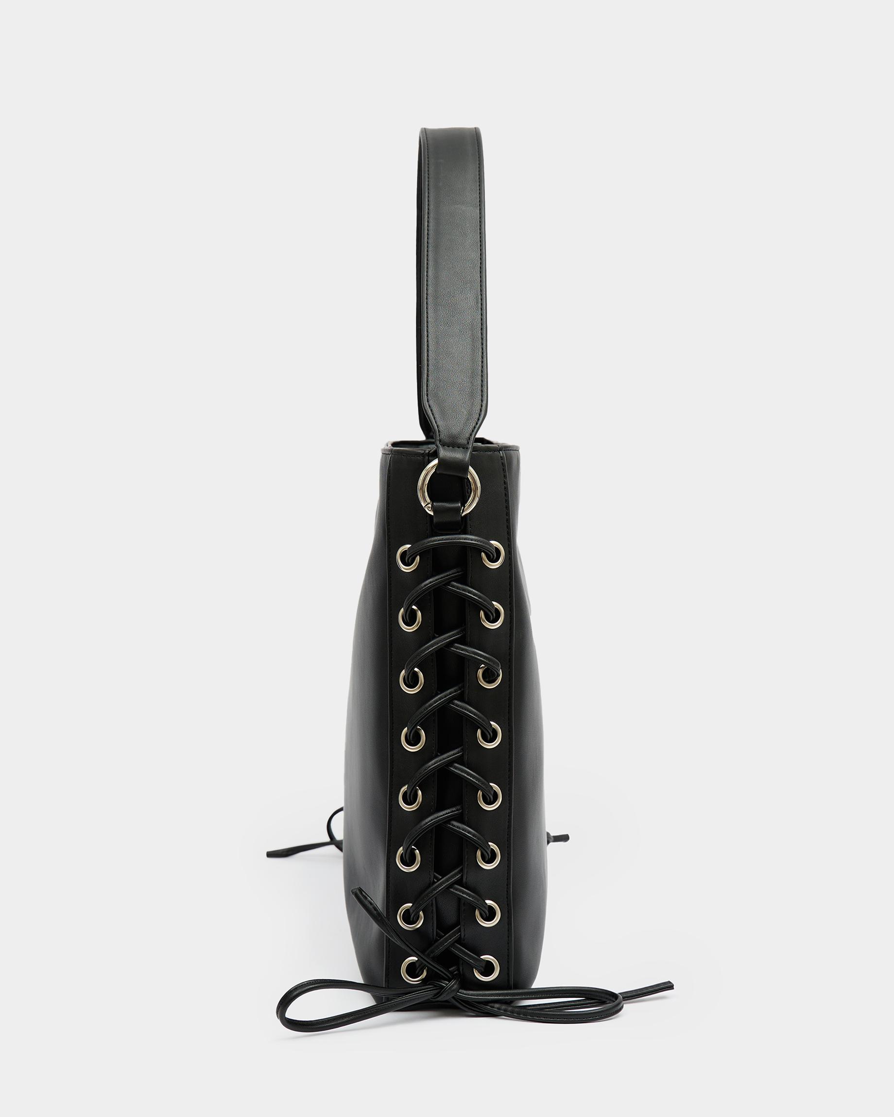 Прямоугольный шопер с декоративной шнуровкой по бокам в черном цвете