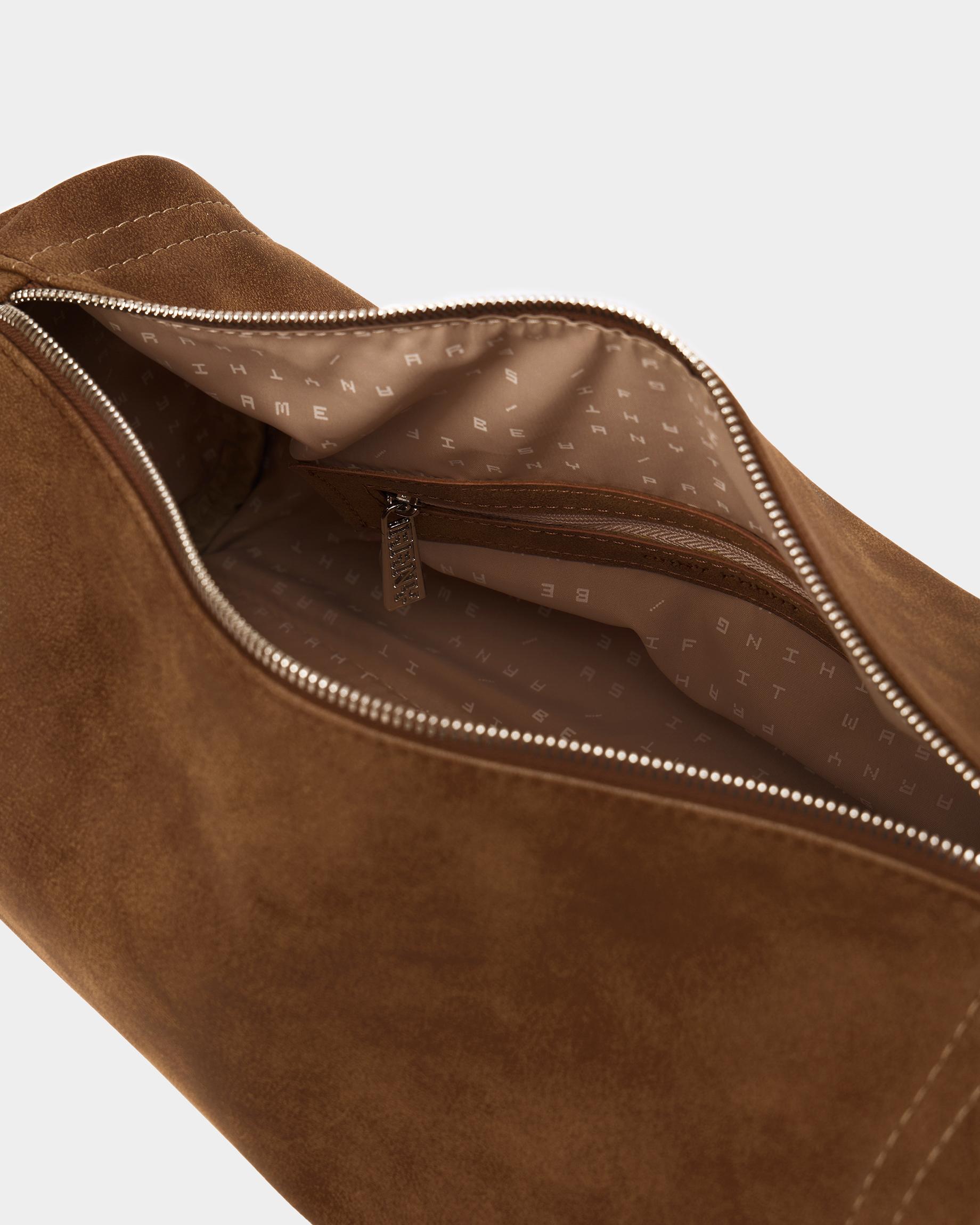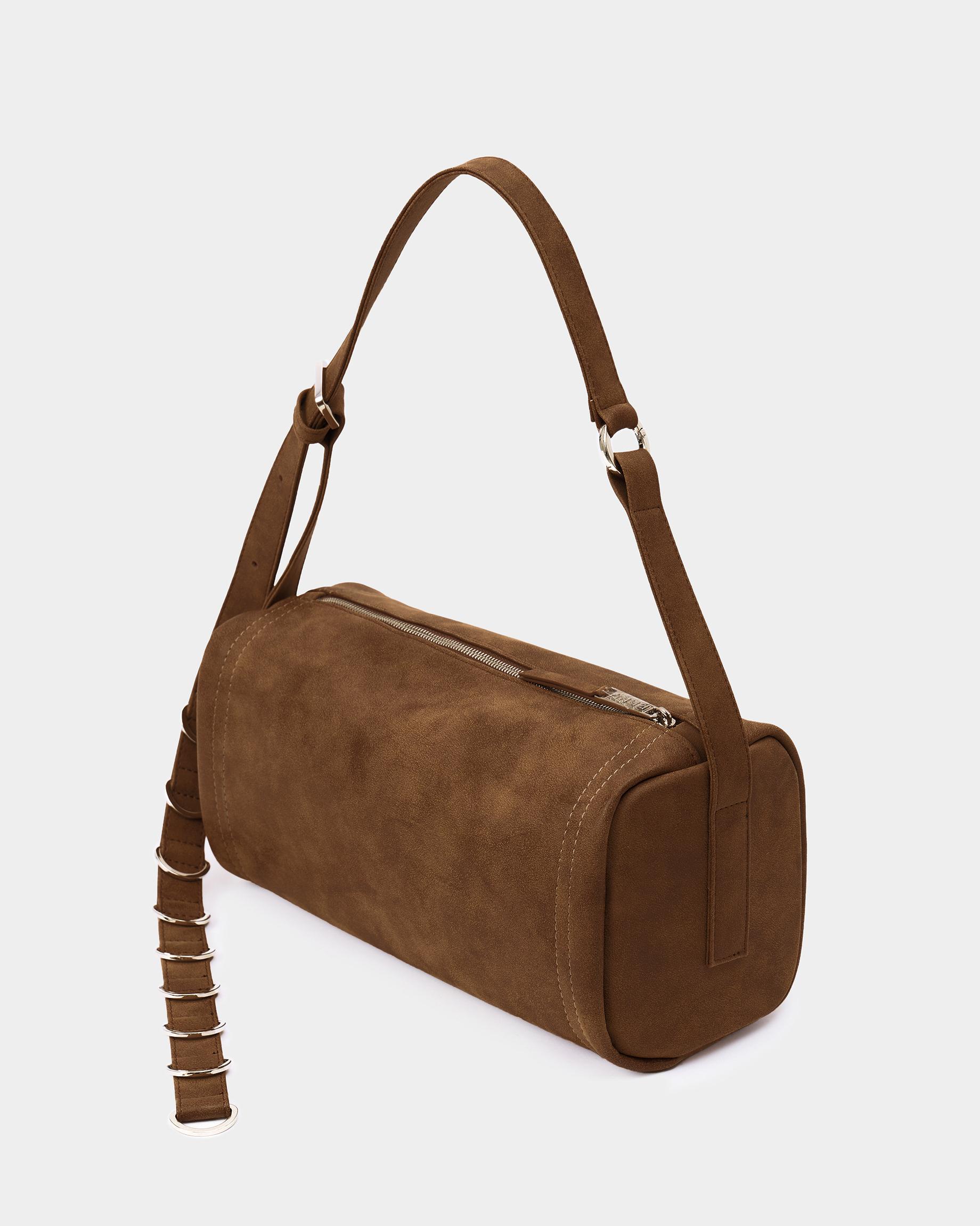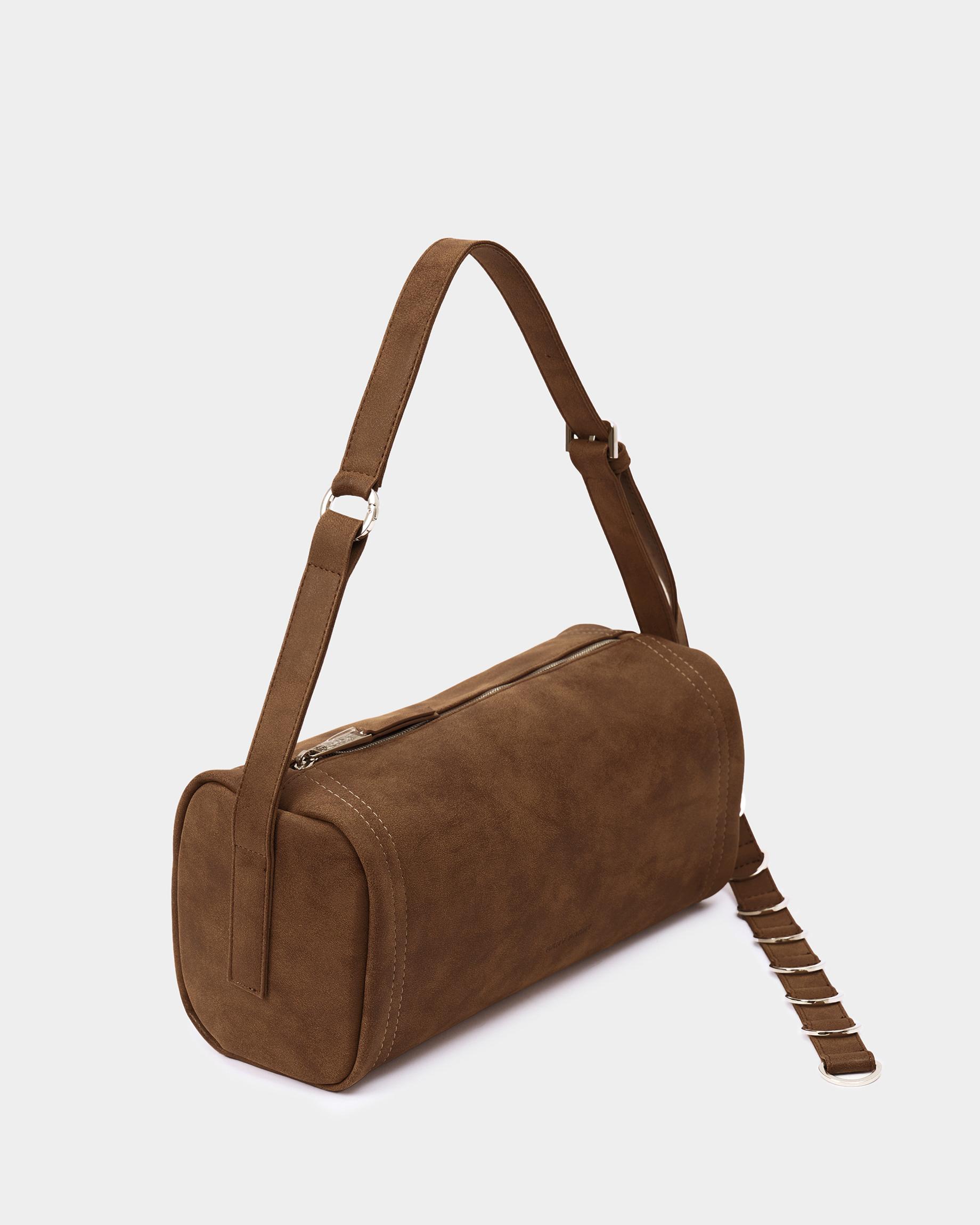 Горизонтально вытянутая мягкая прямоугольная сумка из замшевой экокожи, с акцентным ремнем с полукольцами и контрастной строчкой