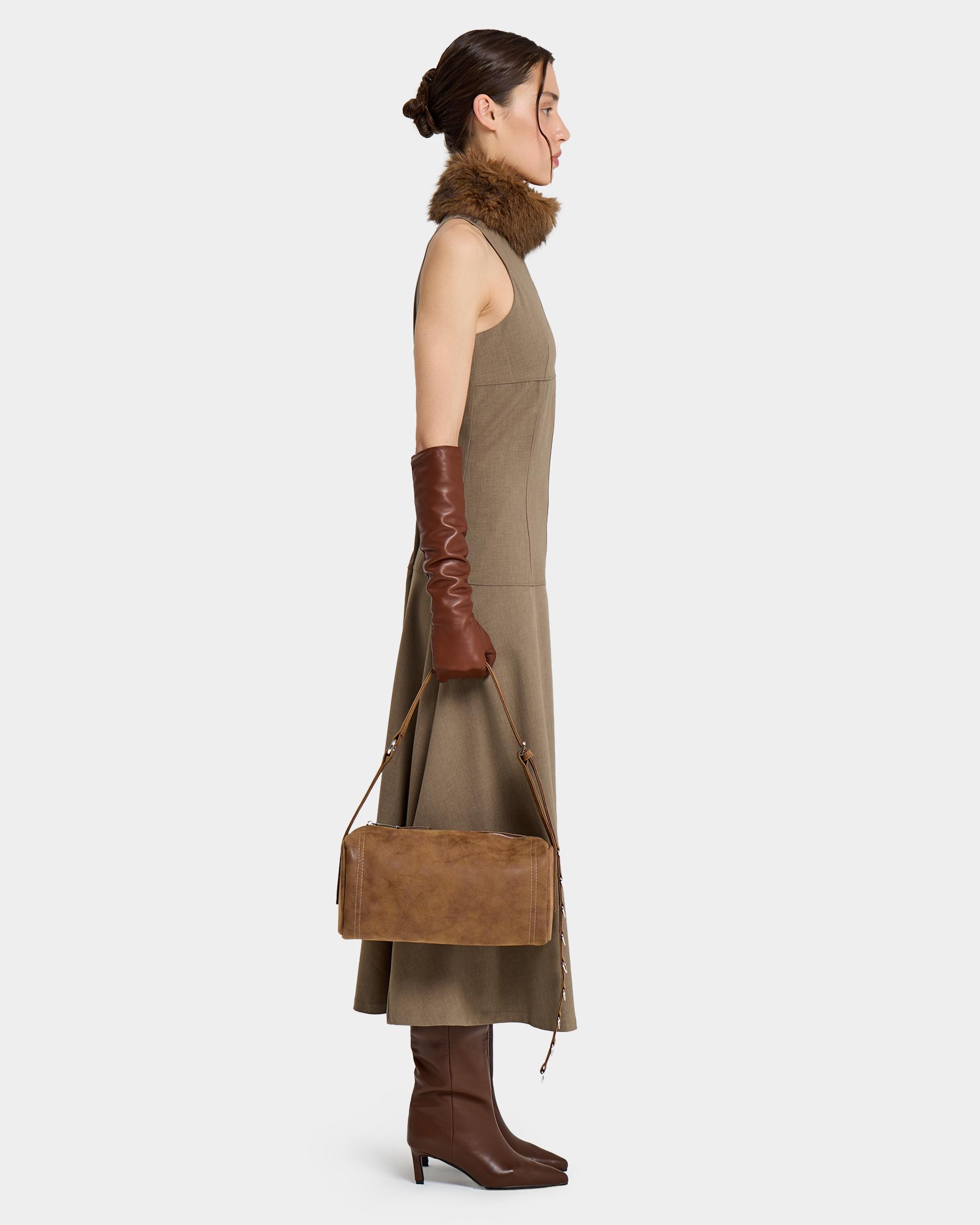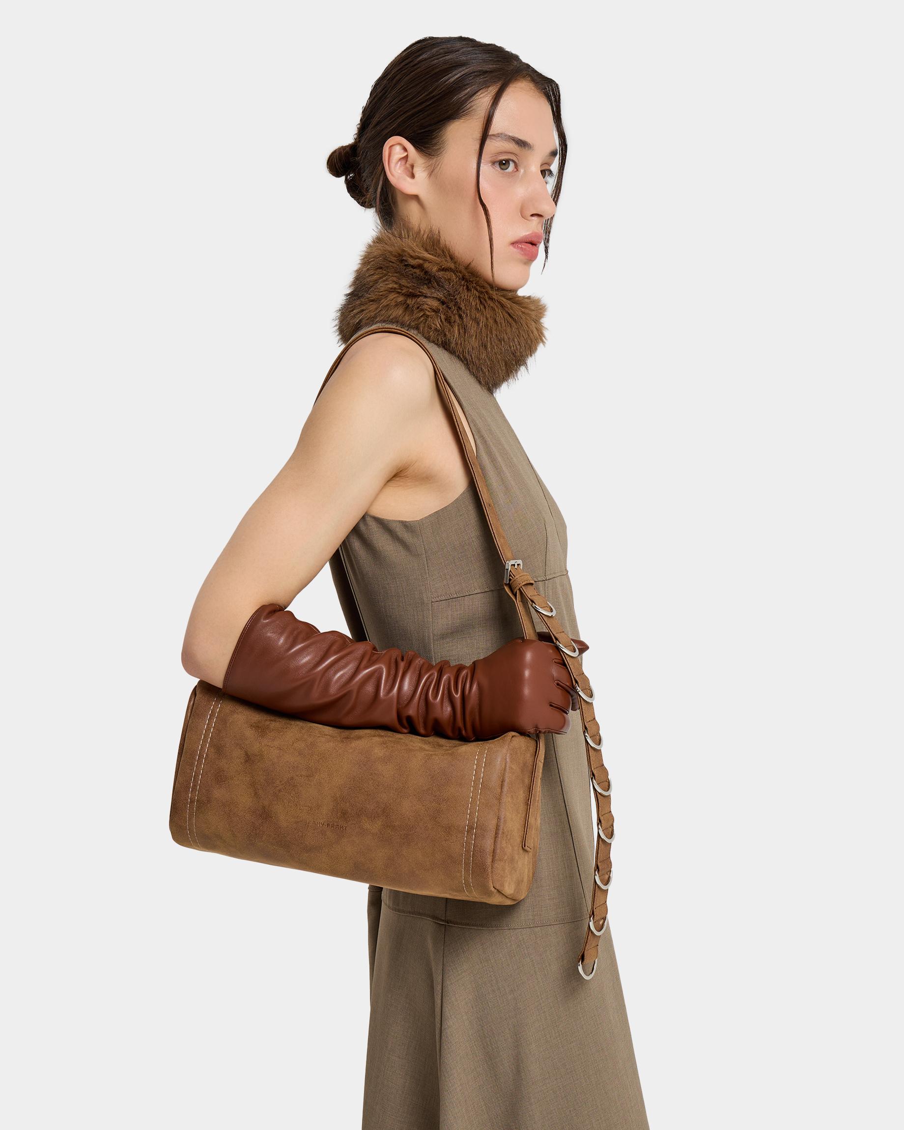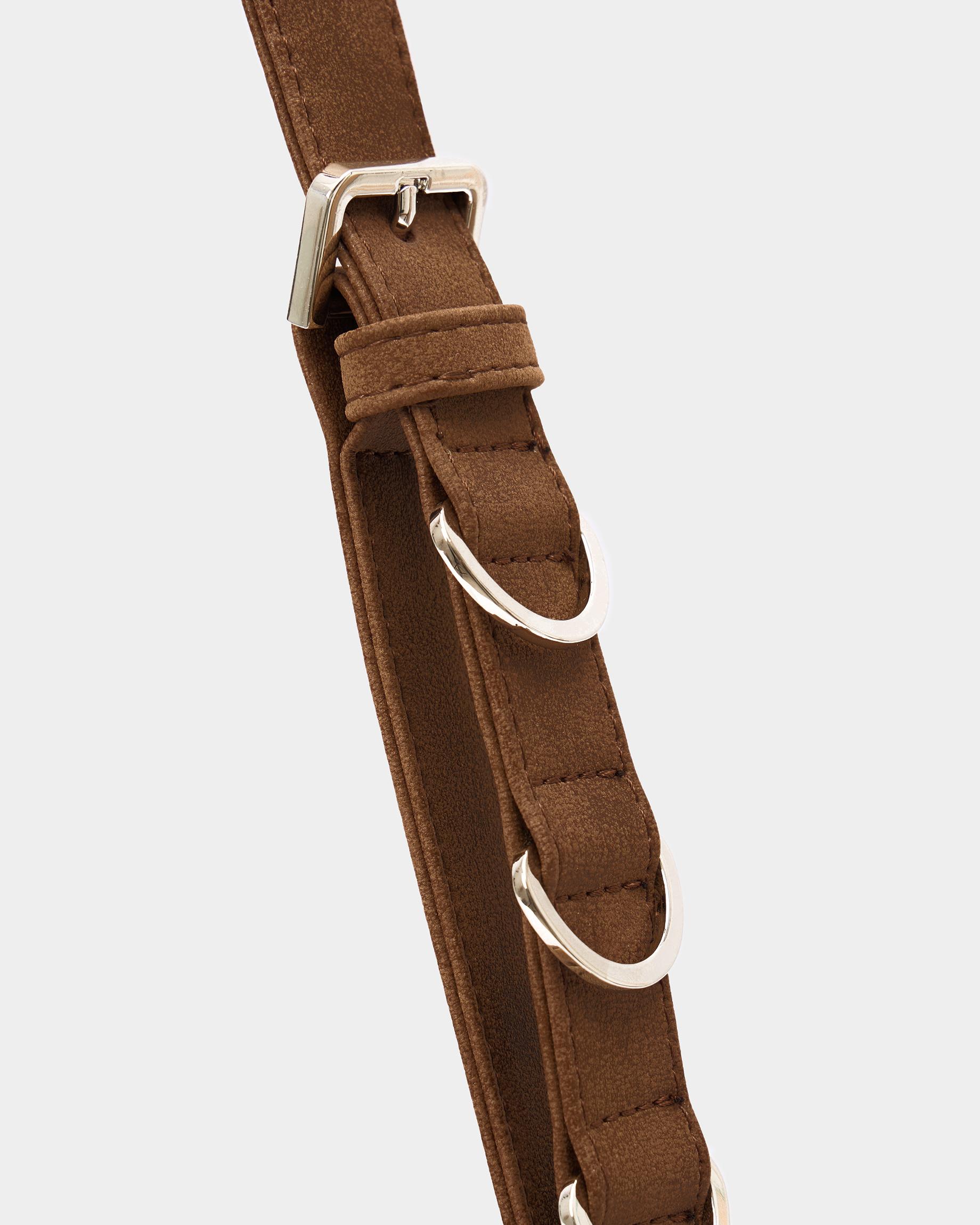 Горизонтально вытянутая мягкая прямоугольная сумка из замшевой экокожи, с акцентным ремнем с полукольцами и контрастной строчкой