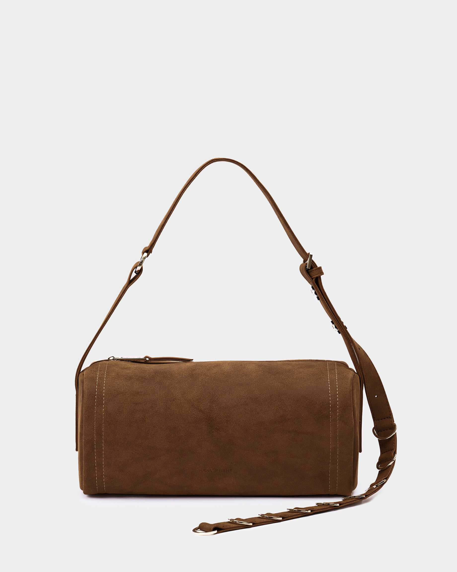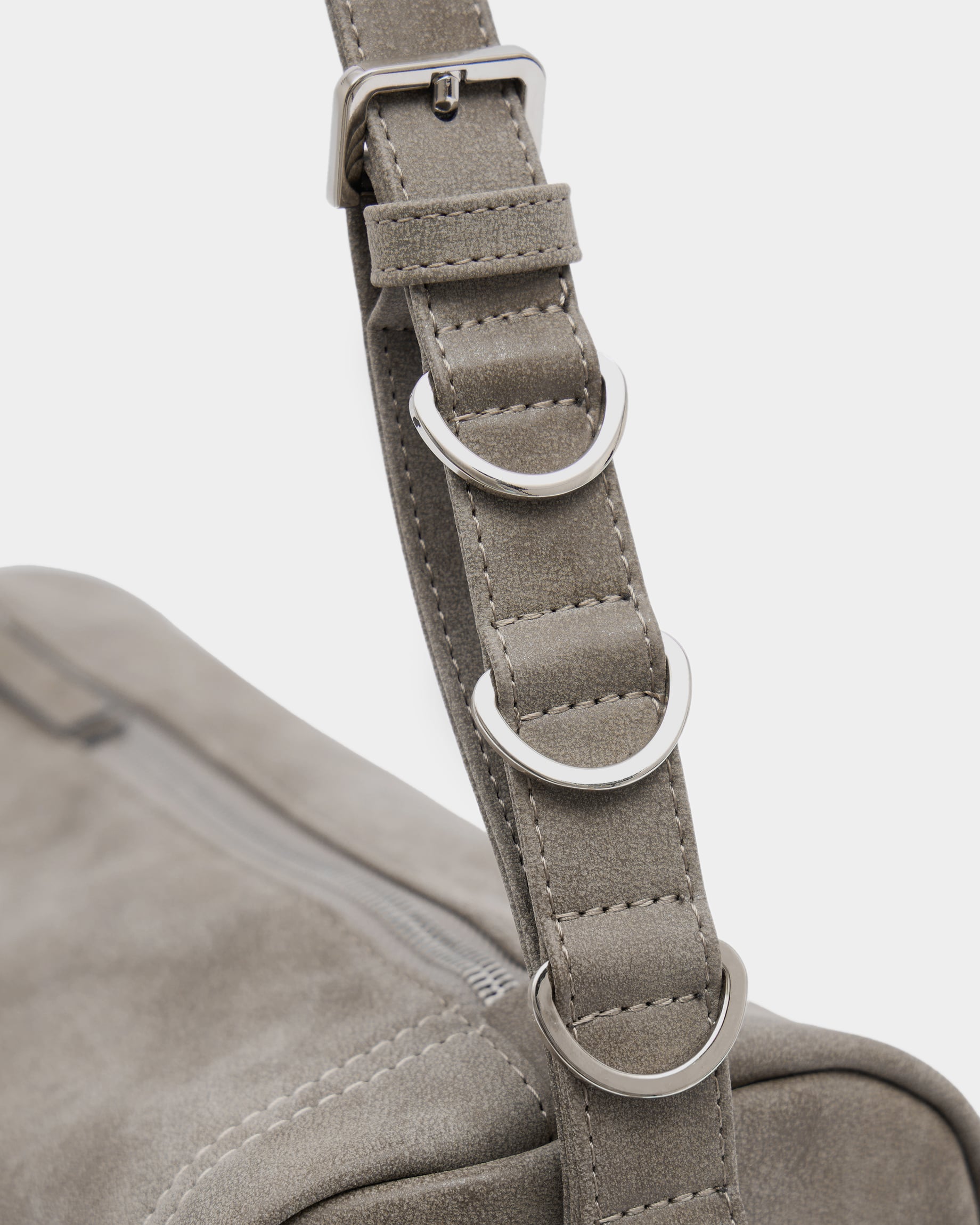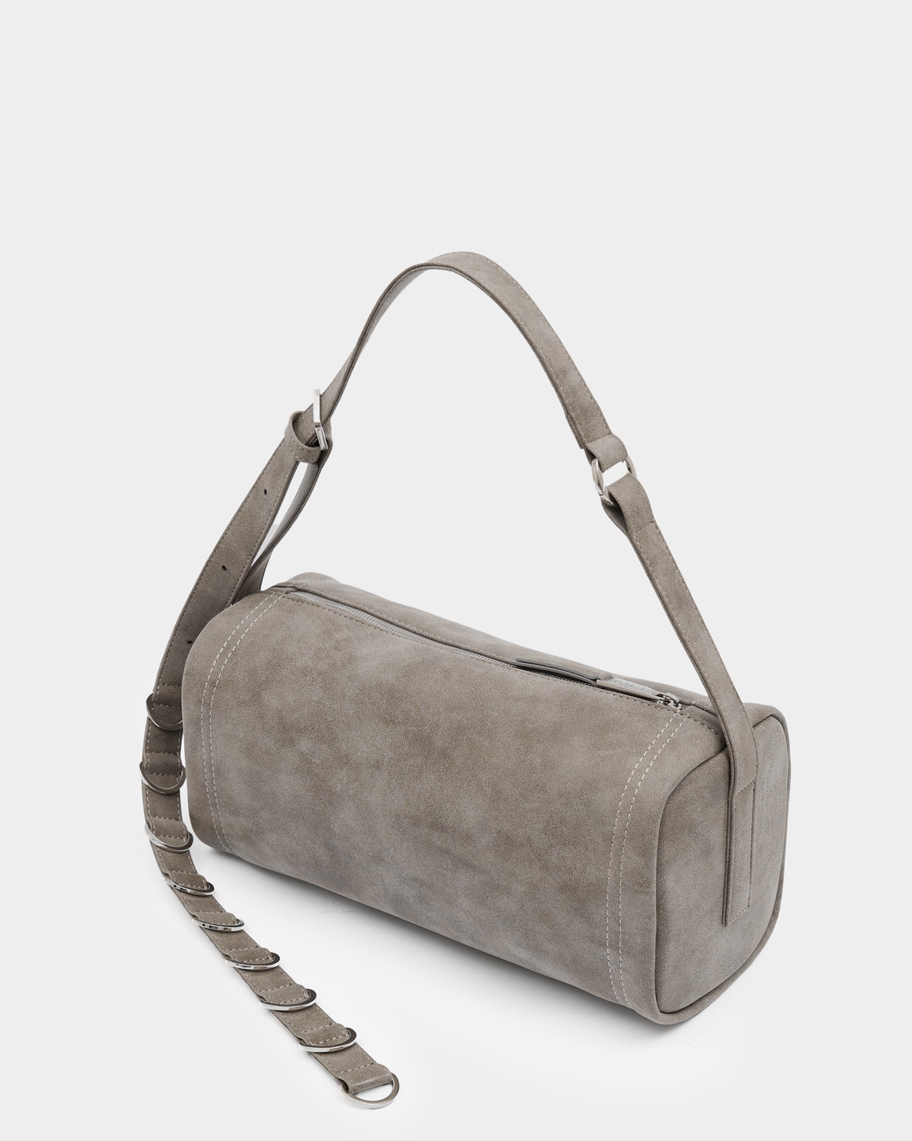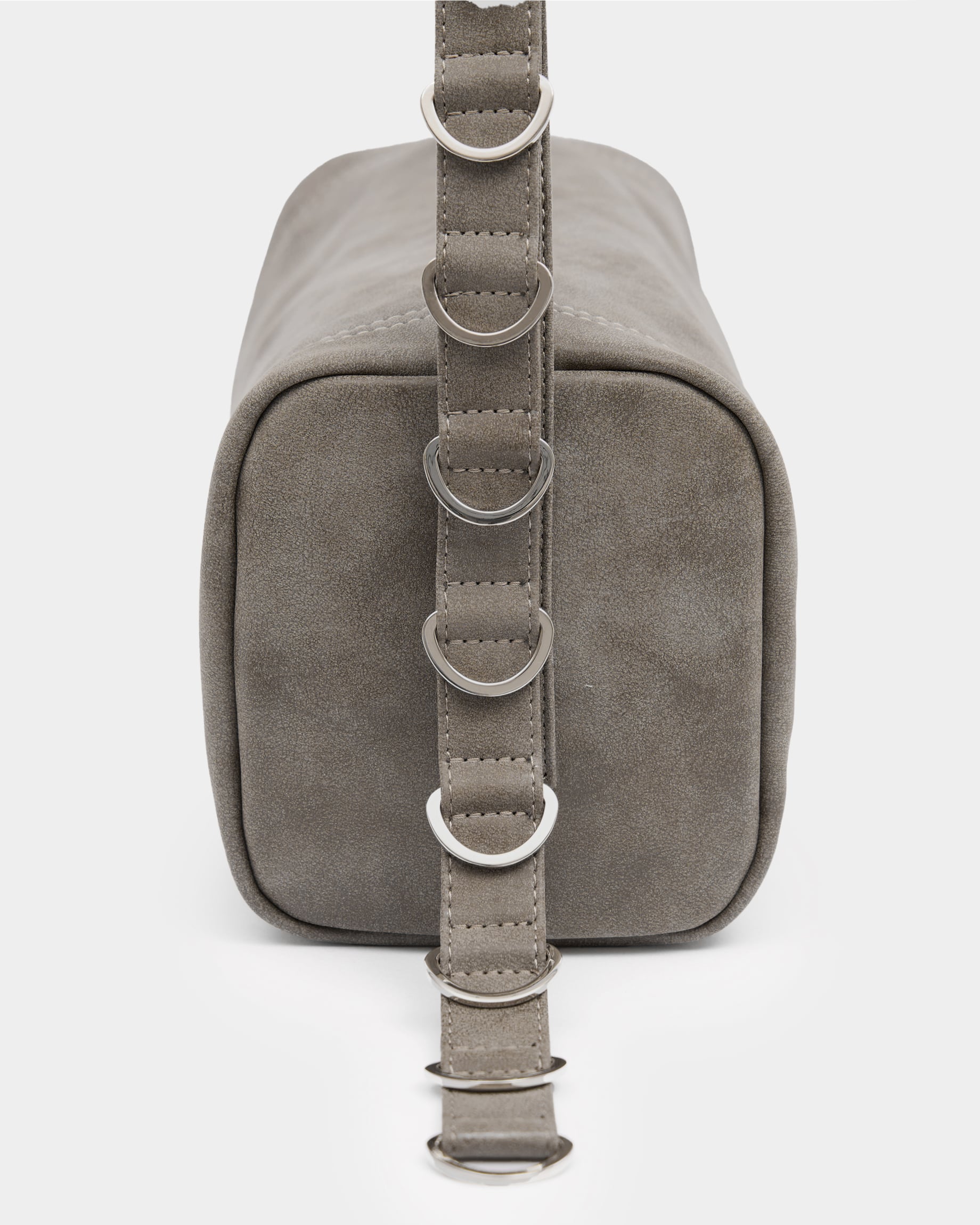 Горизонтально вытянутая мягкая прямоугольная сумка из замшевой экокожи, с акцентным ремнем с полукольцами и контрастной строчкой