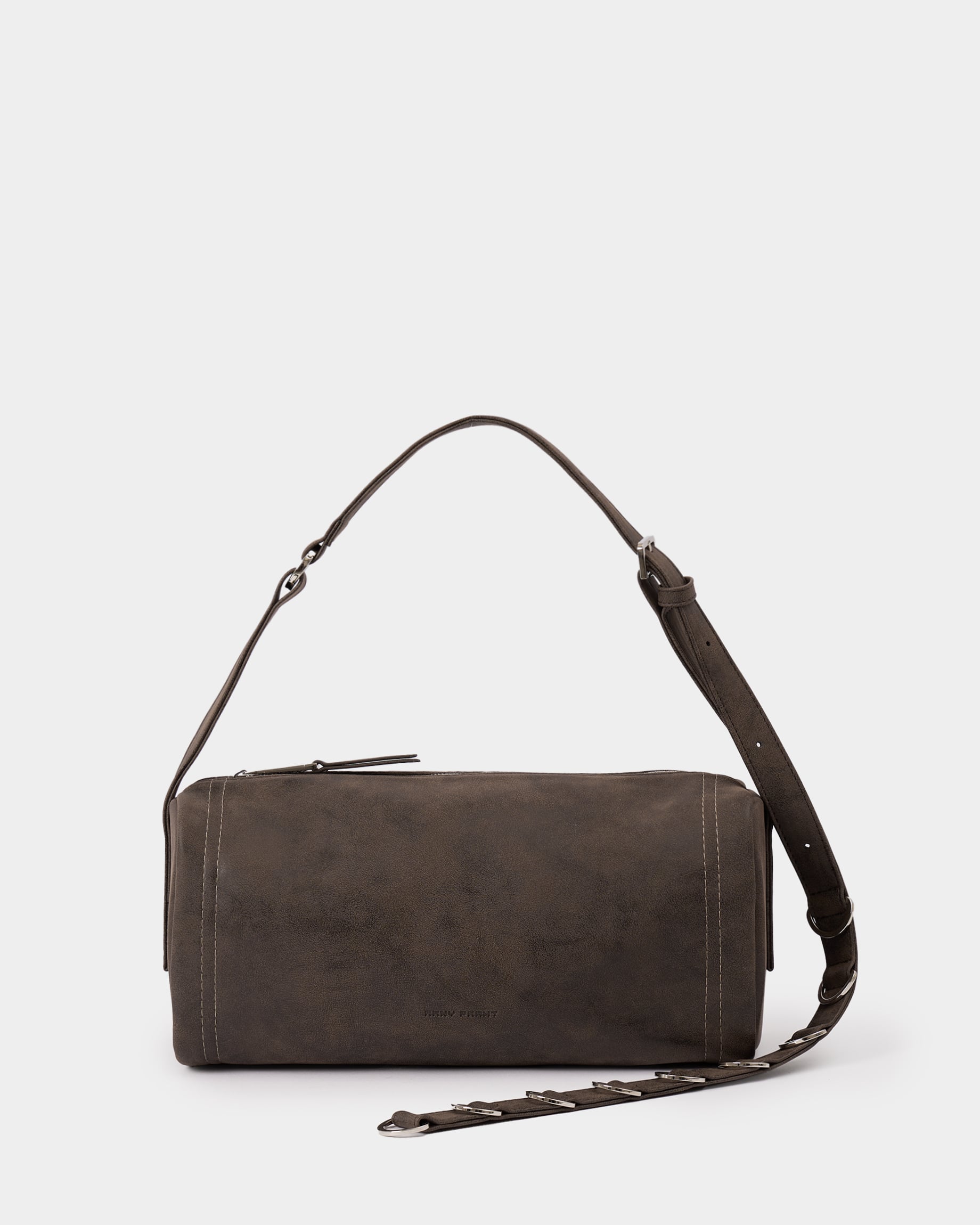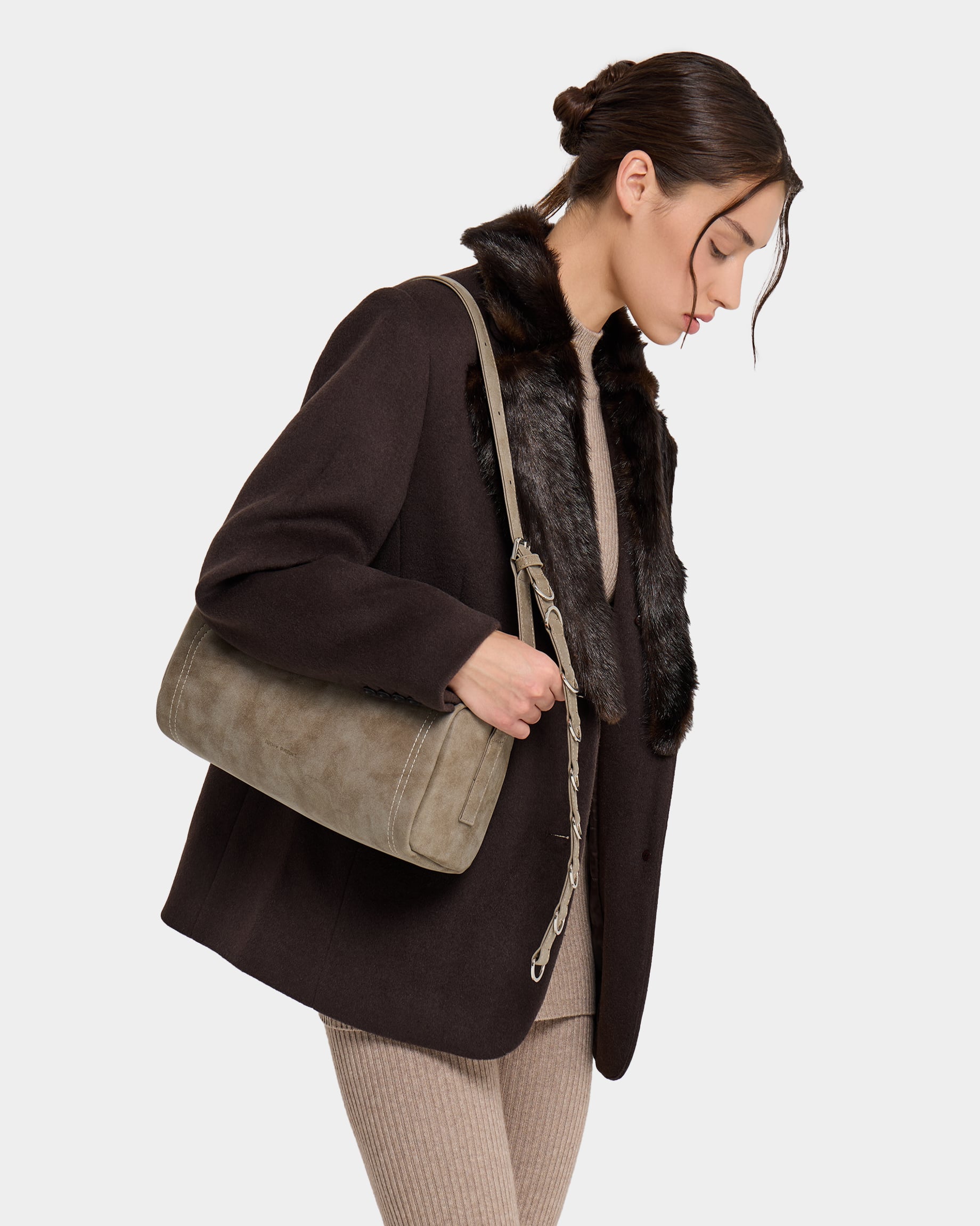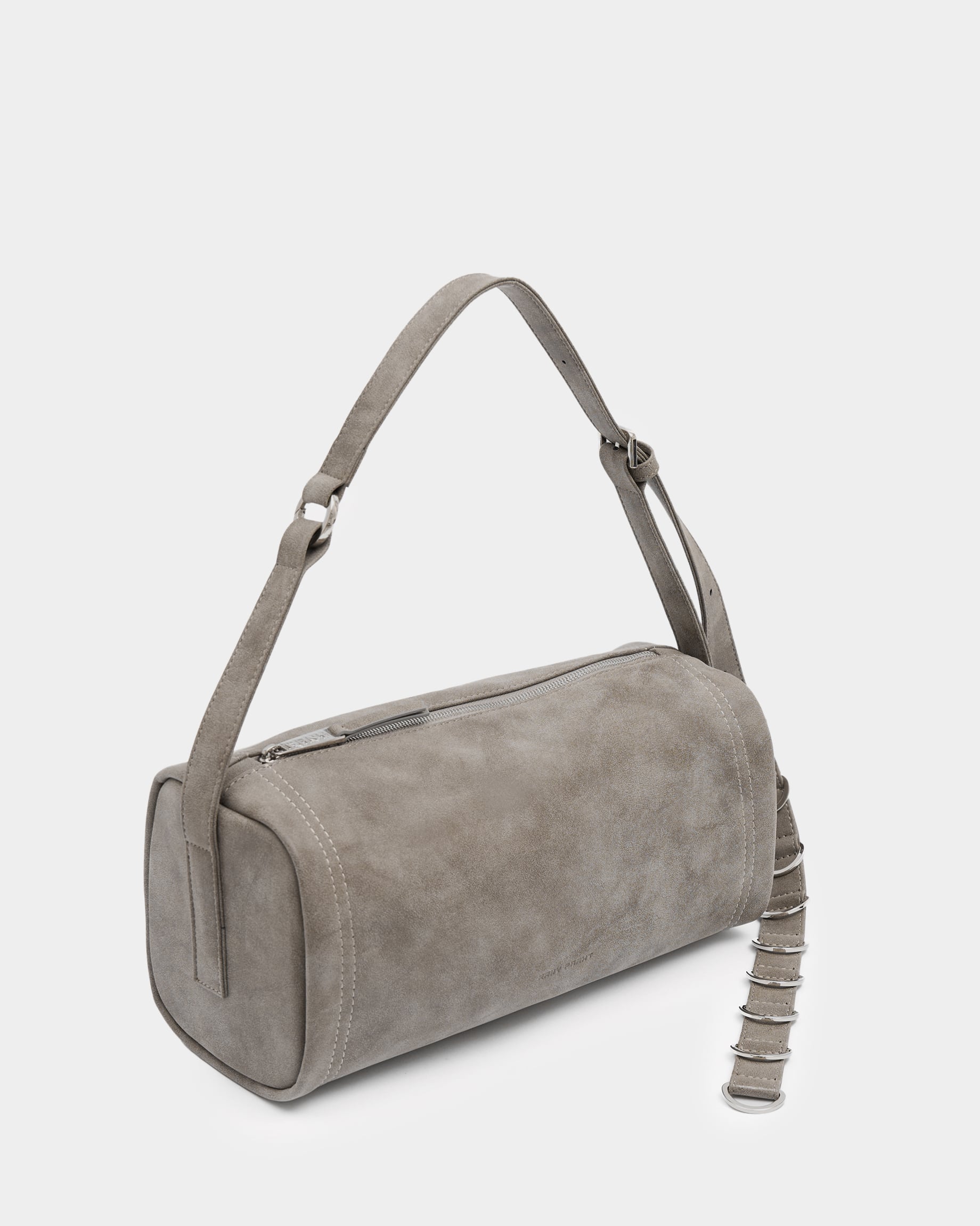 Горизонтально вытянутая мягкая прямоугольная сумка из замшевой экокожи, с акцентным ремнем с полукольцами и контрастной строчкой