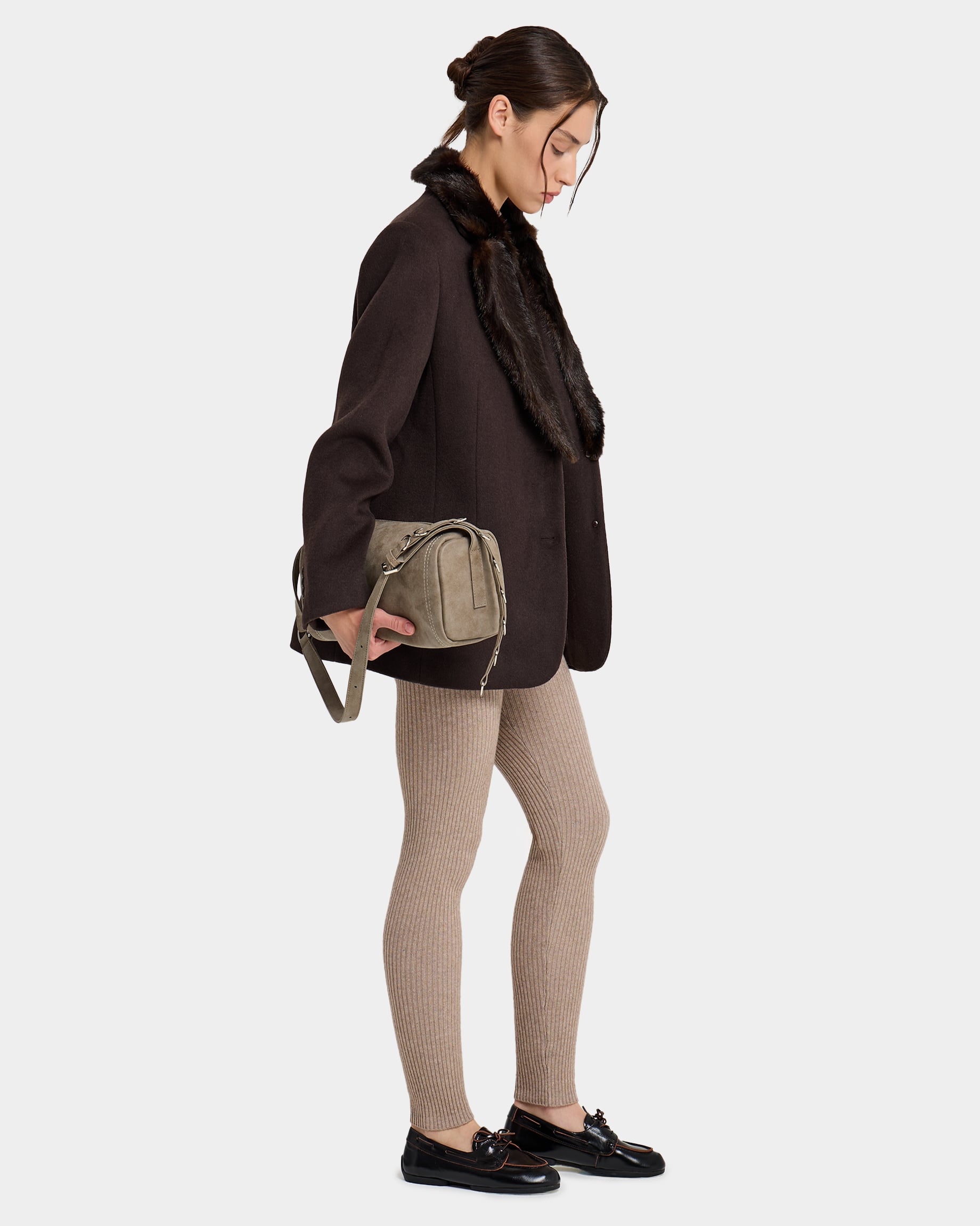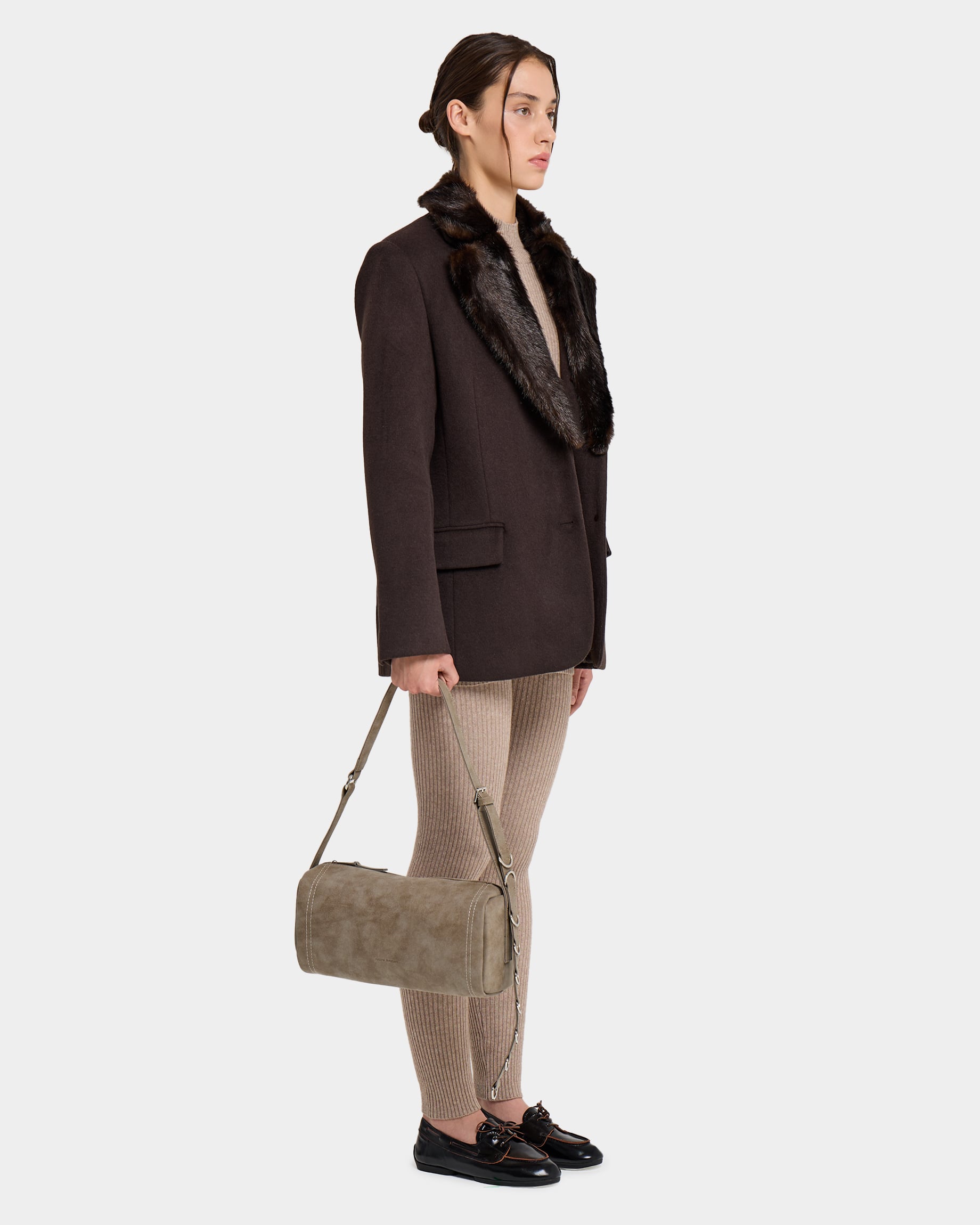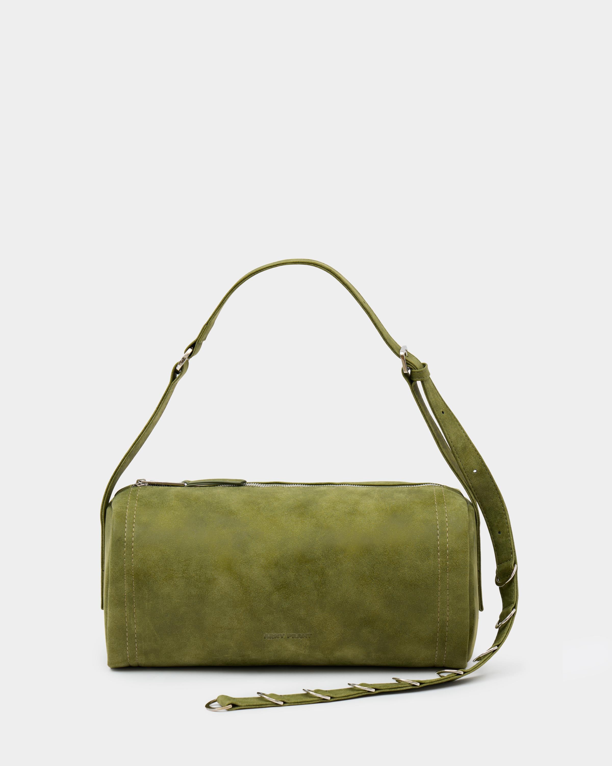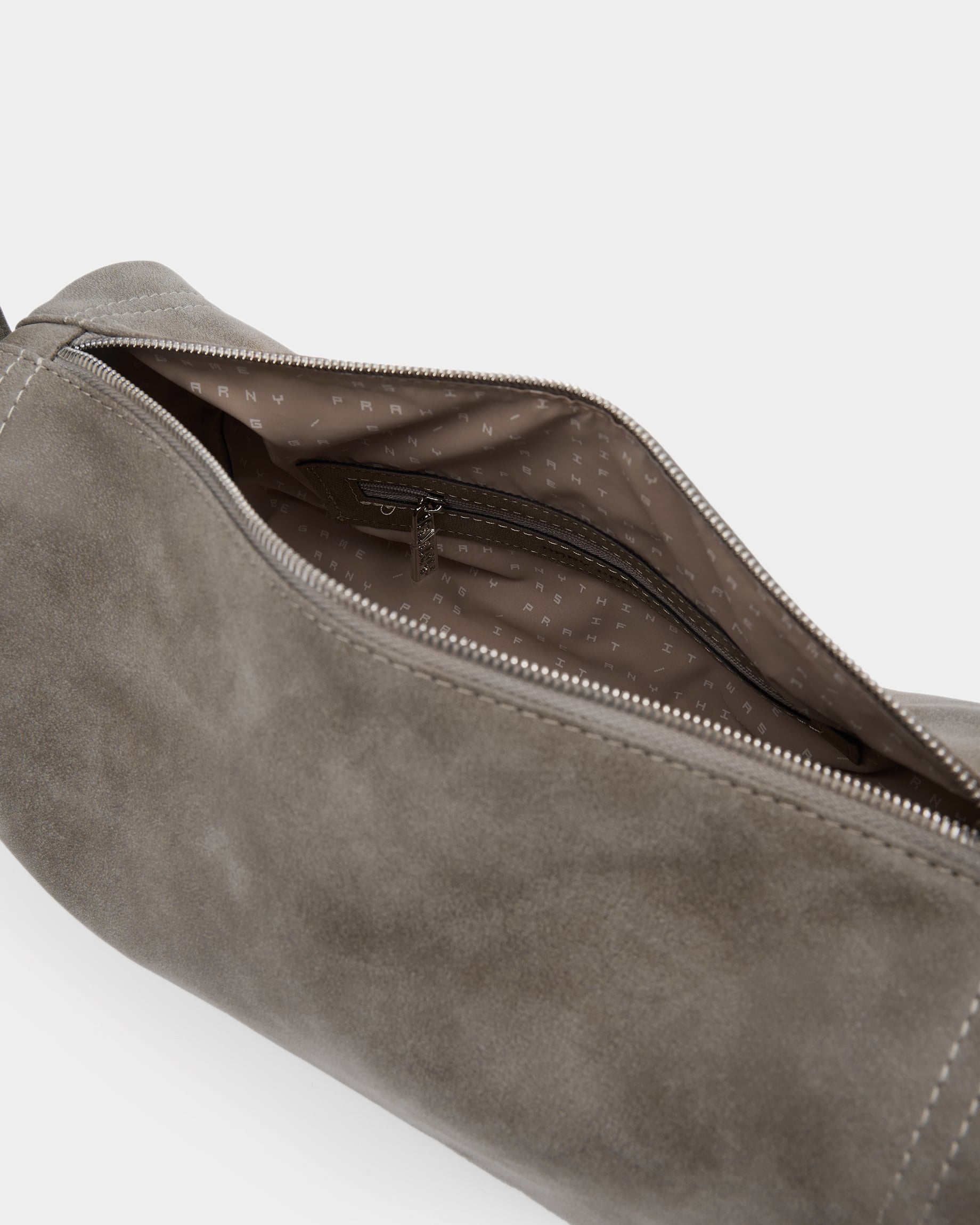 Горизонтально вытянутая мягкая прямоугольная сумка из замшевой экокожи, с акцентным ремнем с полукольцами и контрастной строчкой