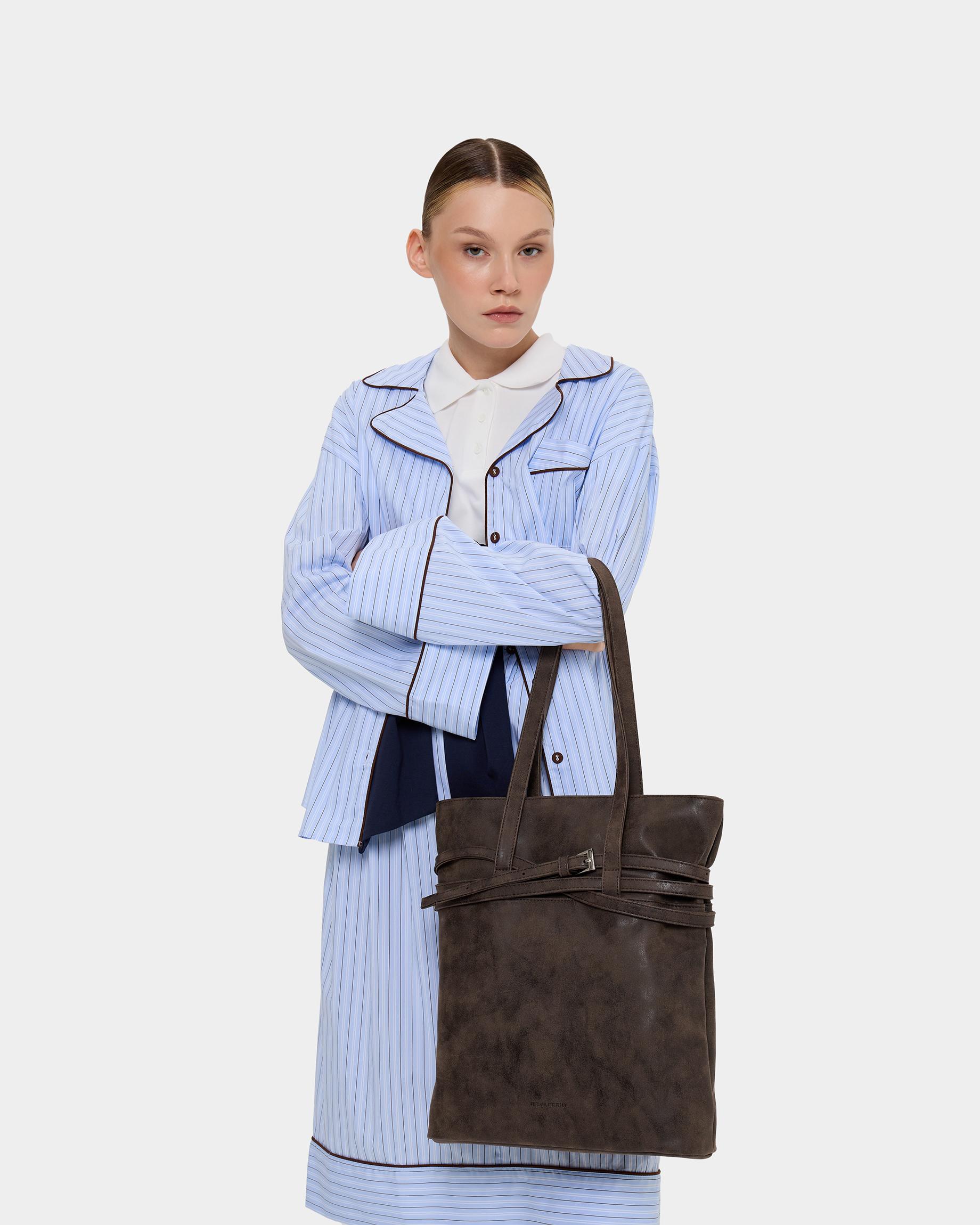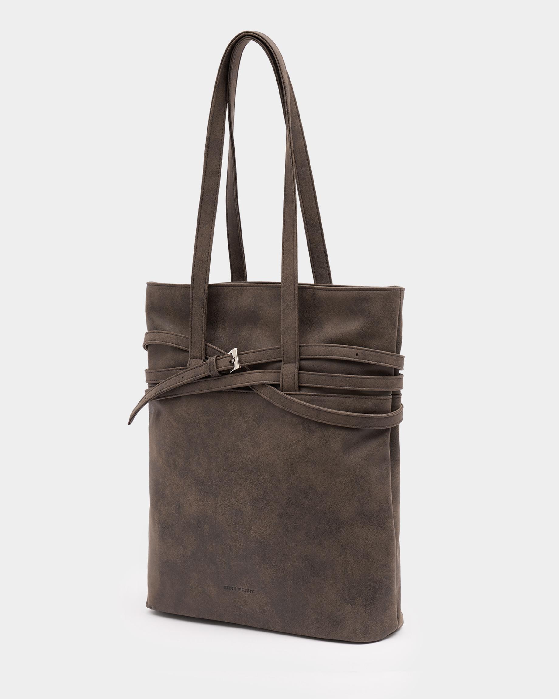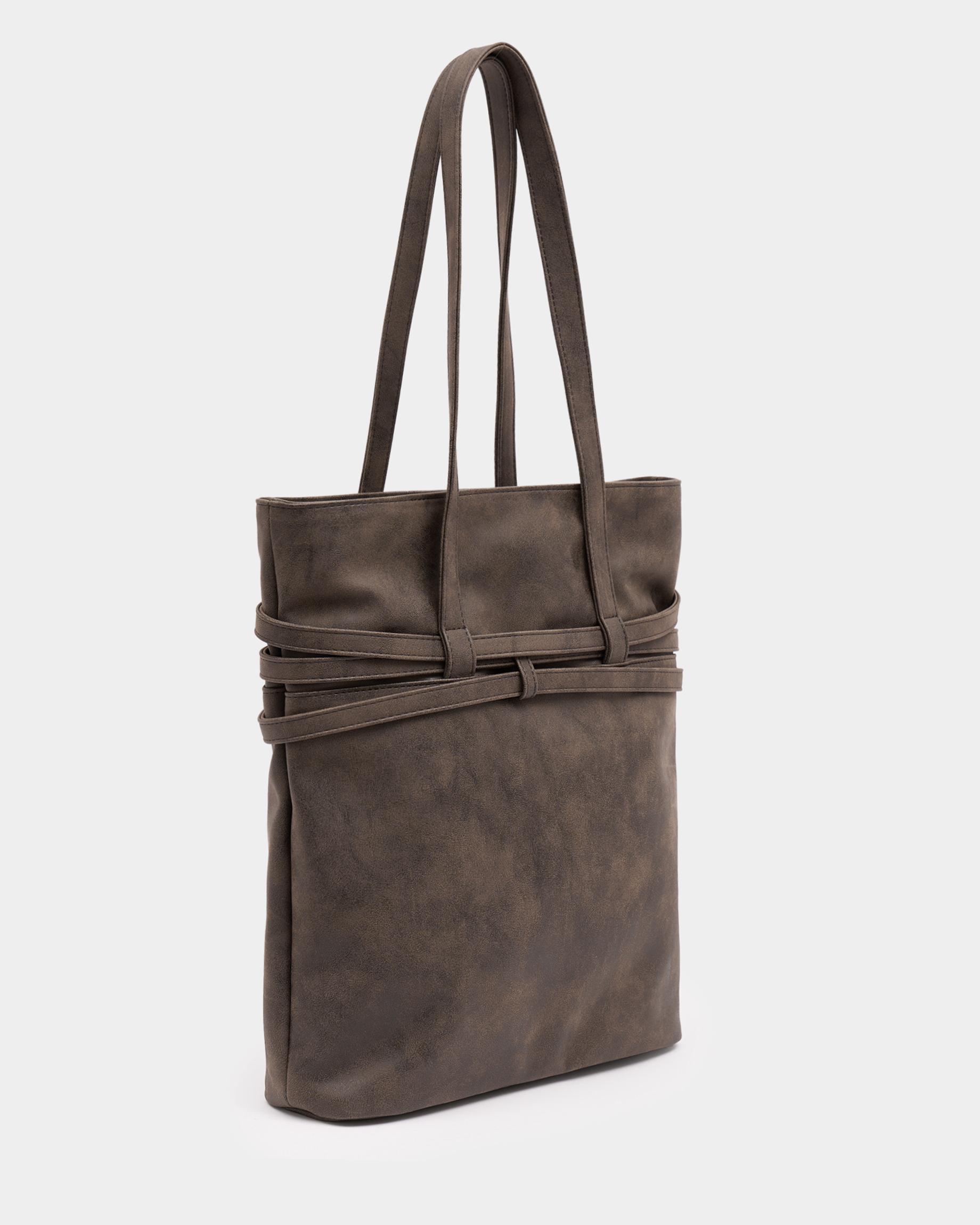 Классическая повседневная сумка-шоппер с широким дном и декоративными ремнями в цвете брауни