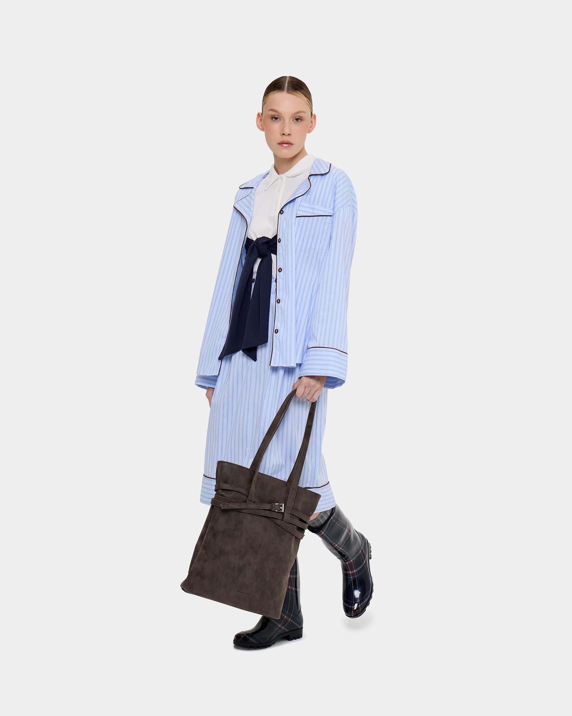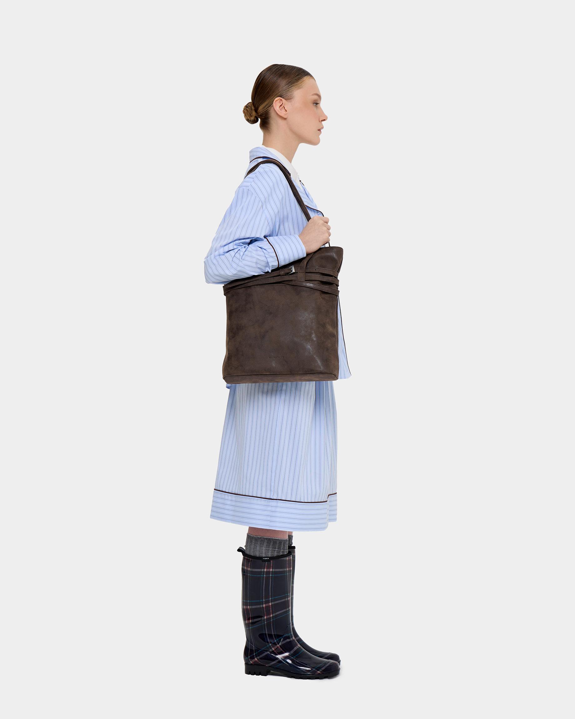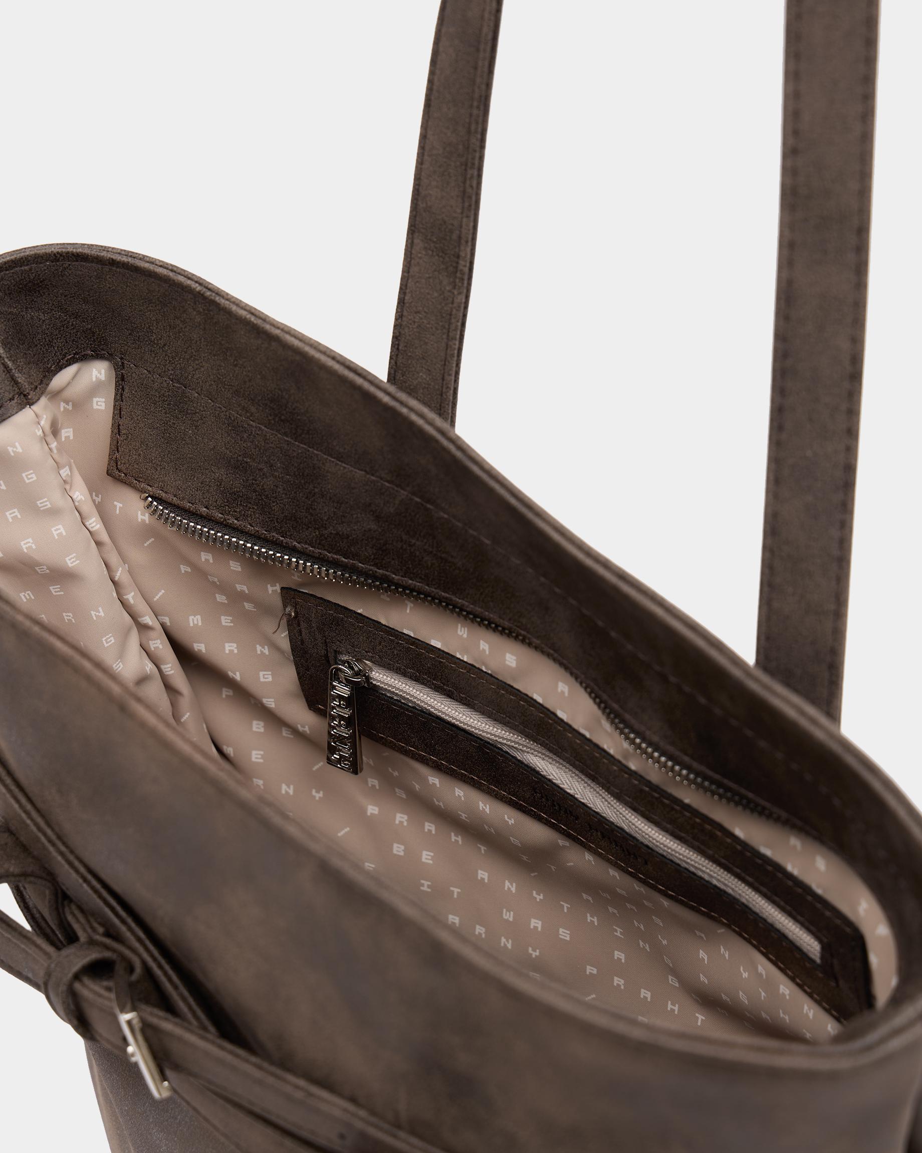 Классическая повседневная сумка-шоппер с широким дном и декоративными ремнями в цвете брауни