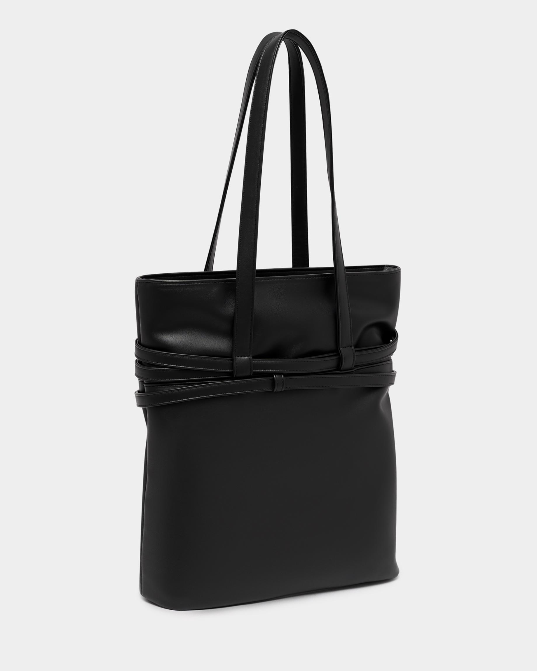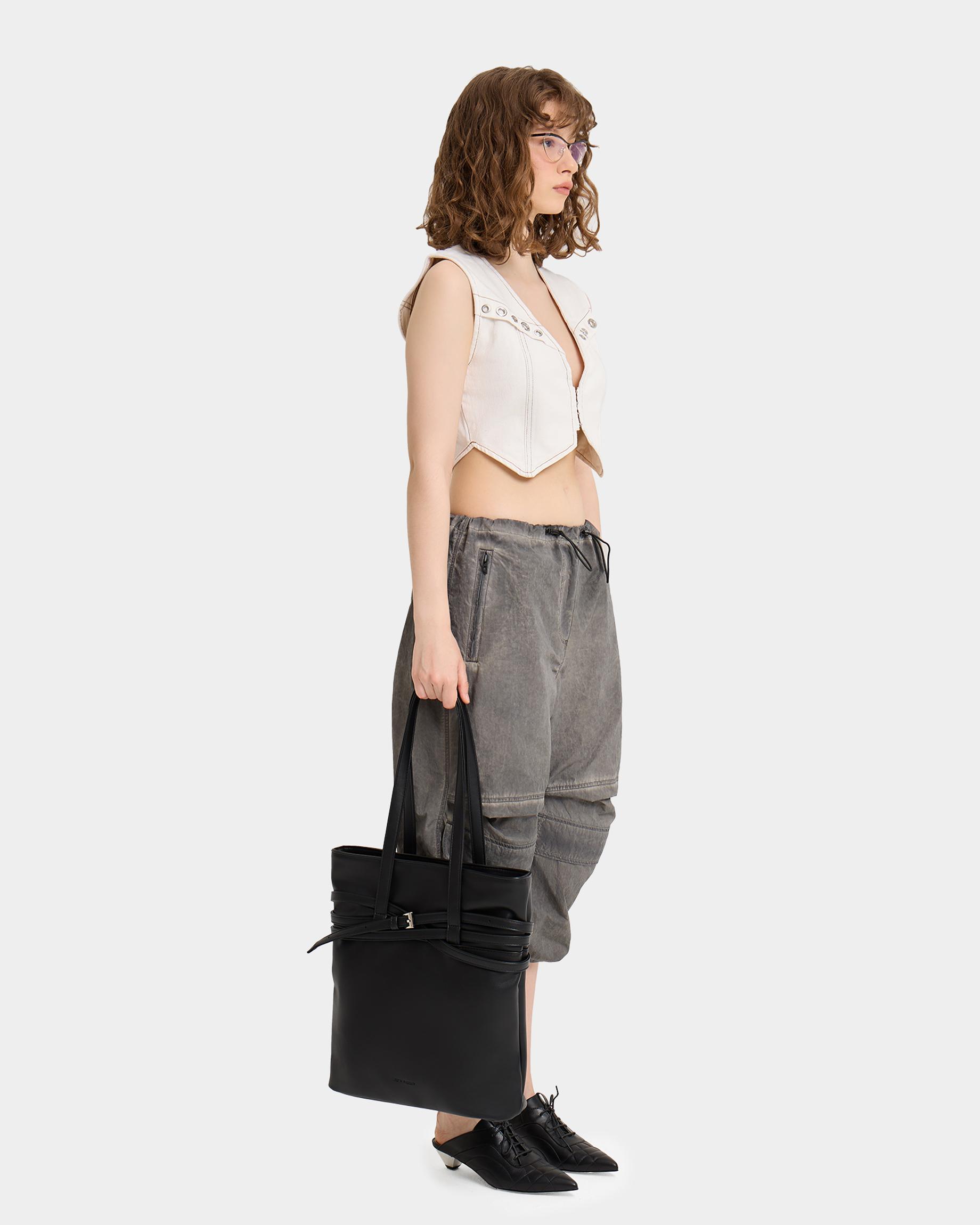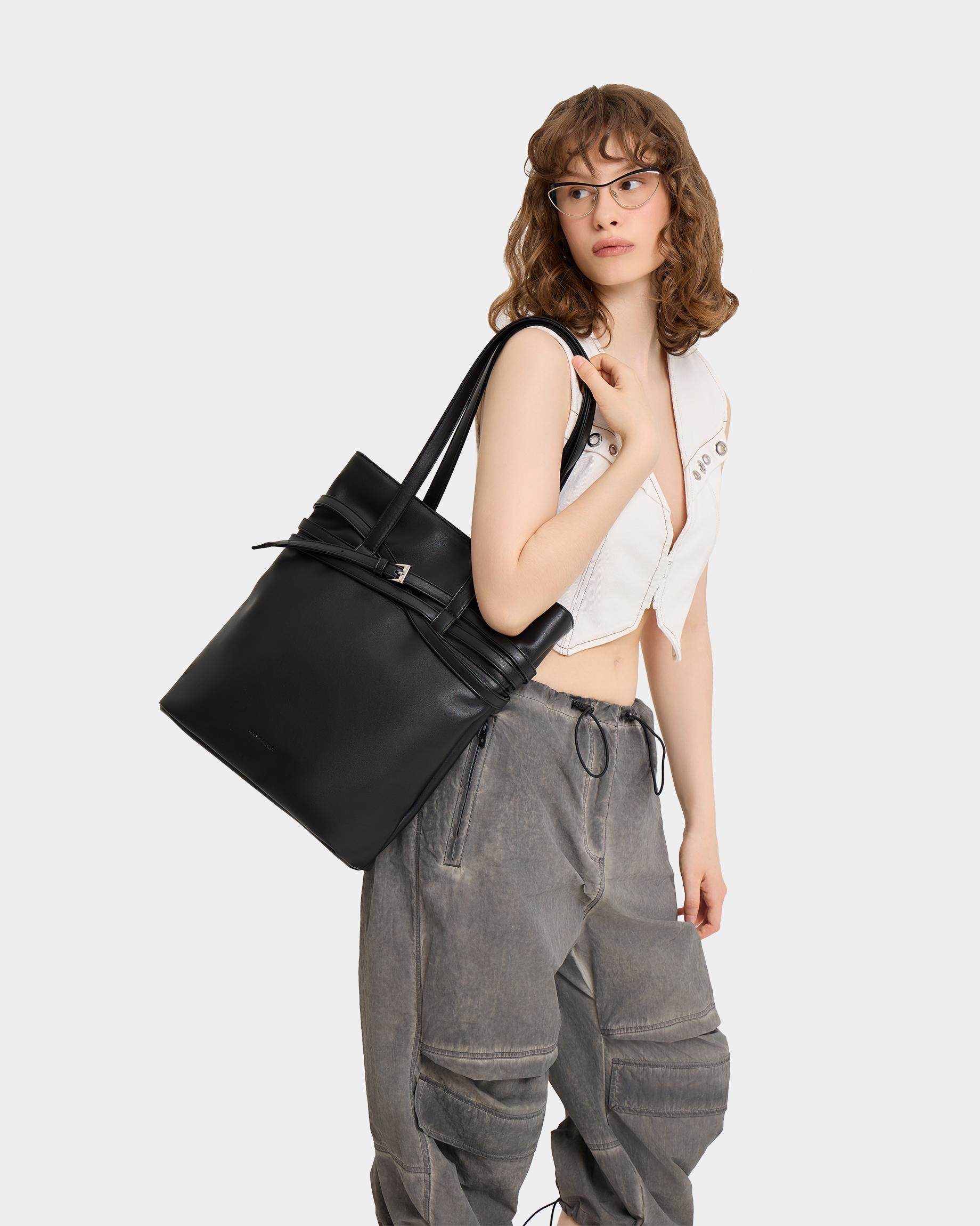 Классическая повседневная сумка-шоппер с широким дном и декоративными ремнями в черном цвете