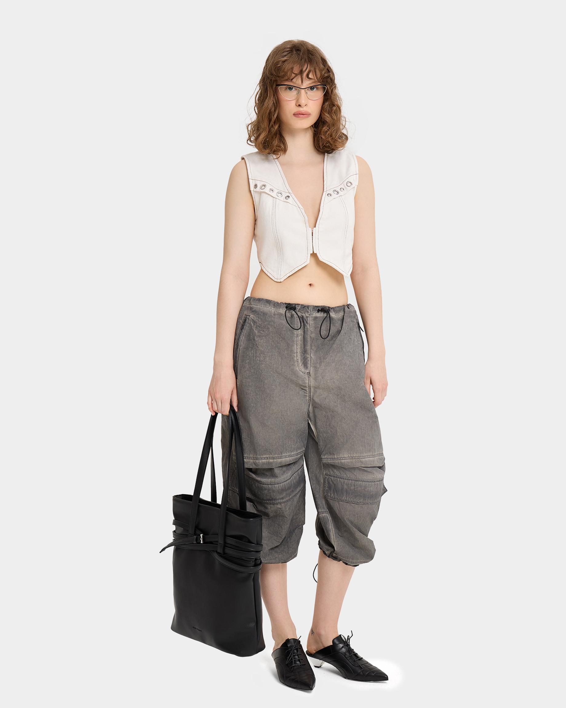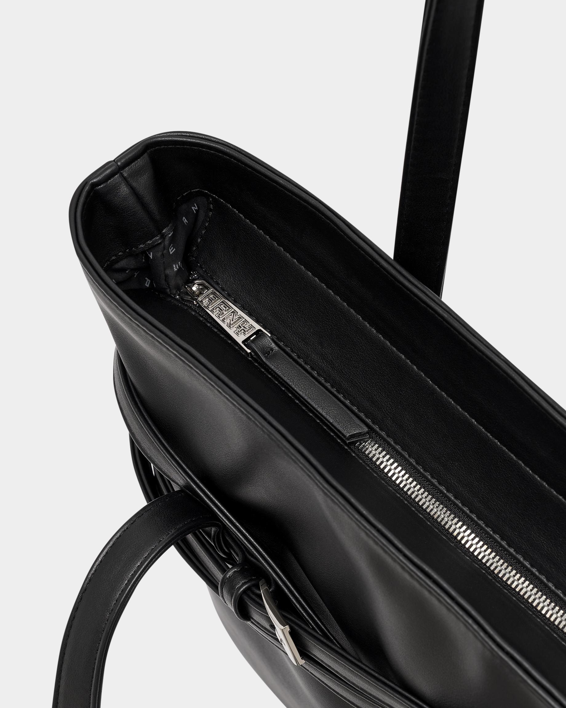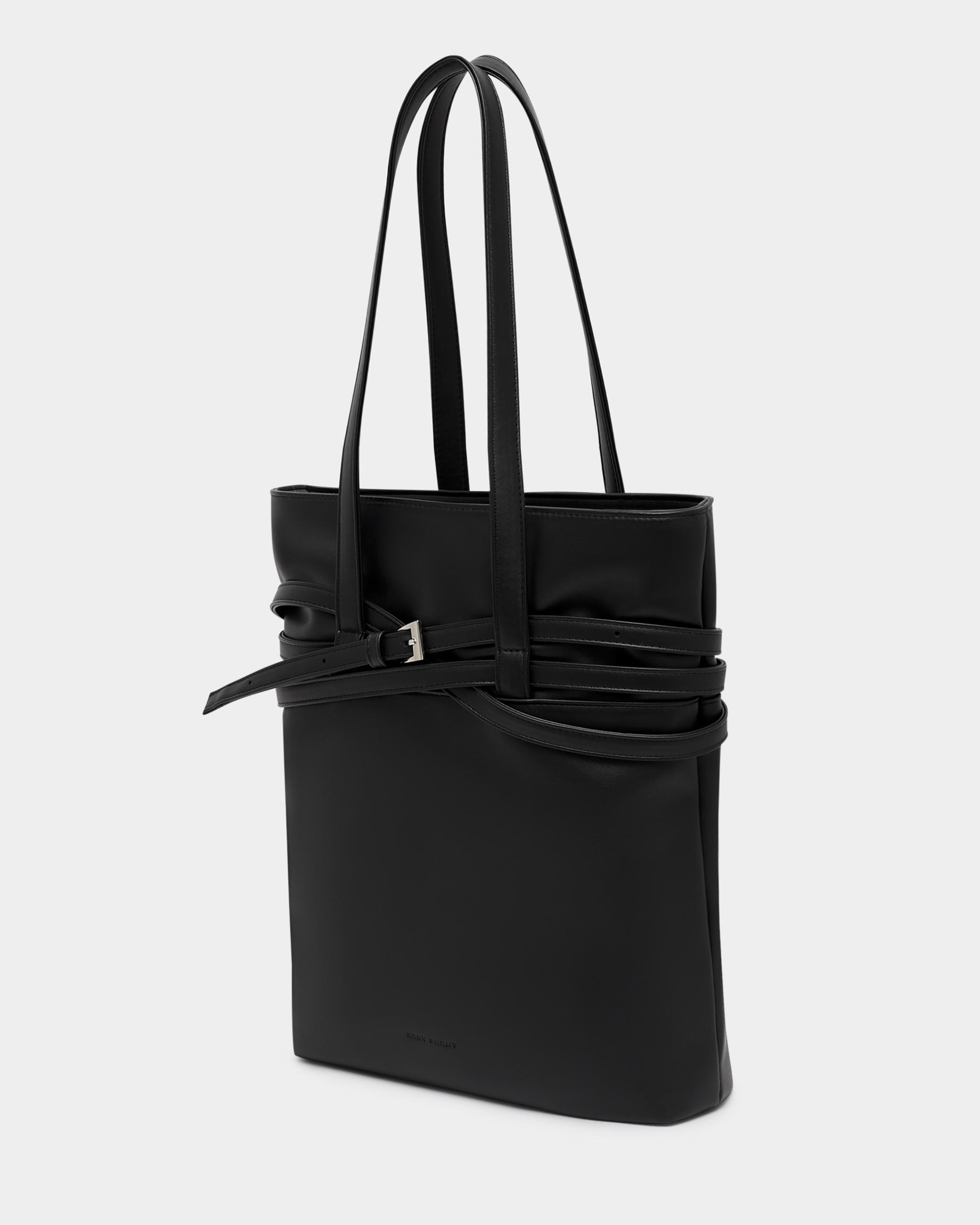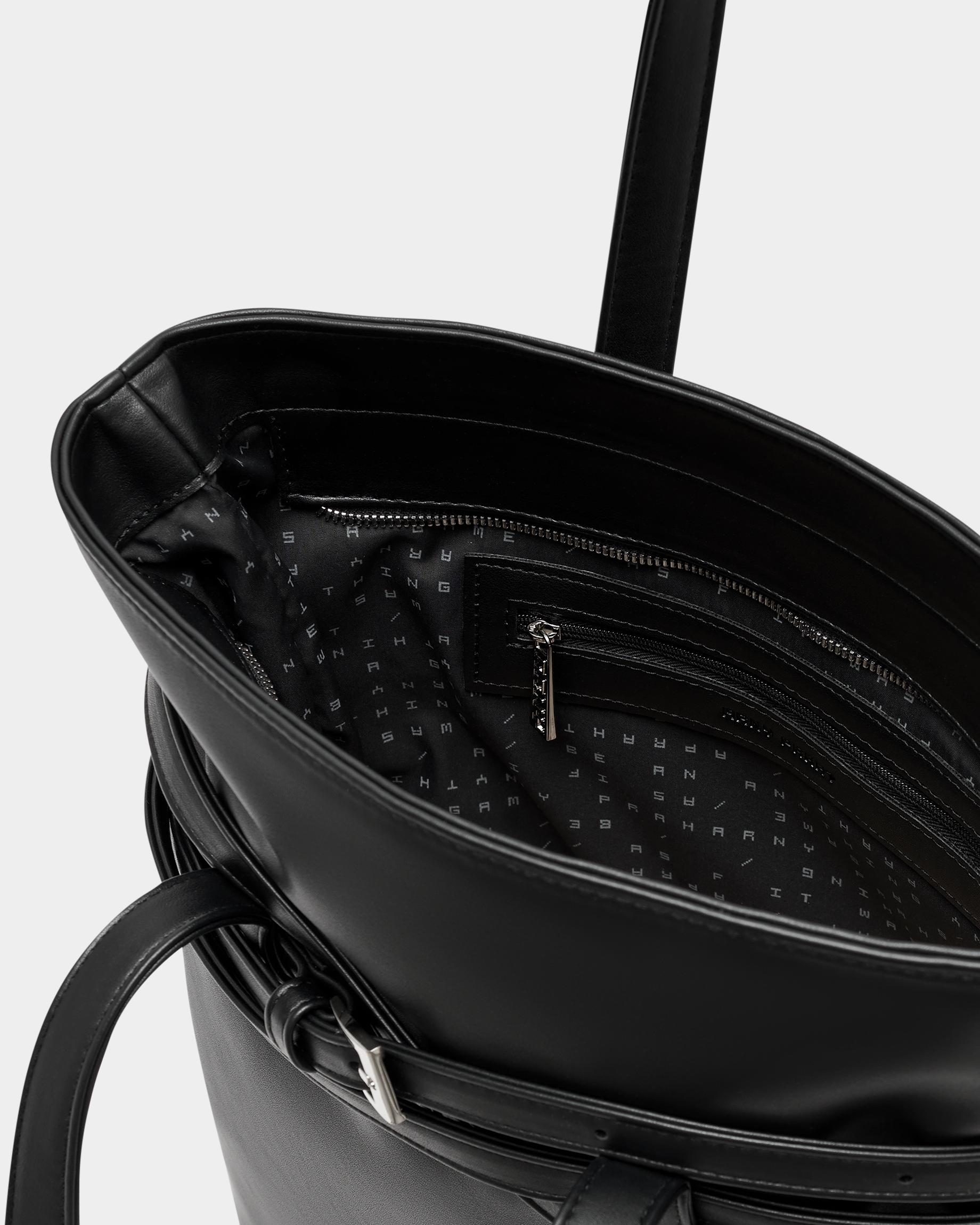 Классическая повседневная сумка-шоппер с широким дном и декоративными ремнями в черном цвете