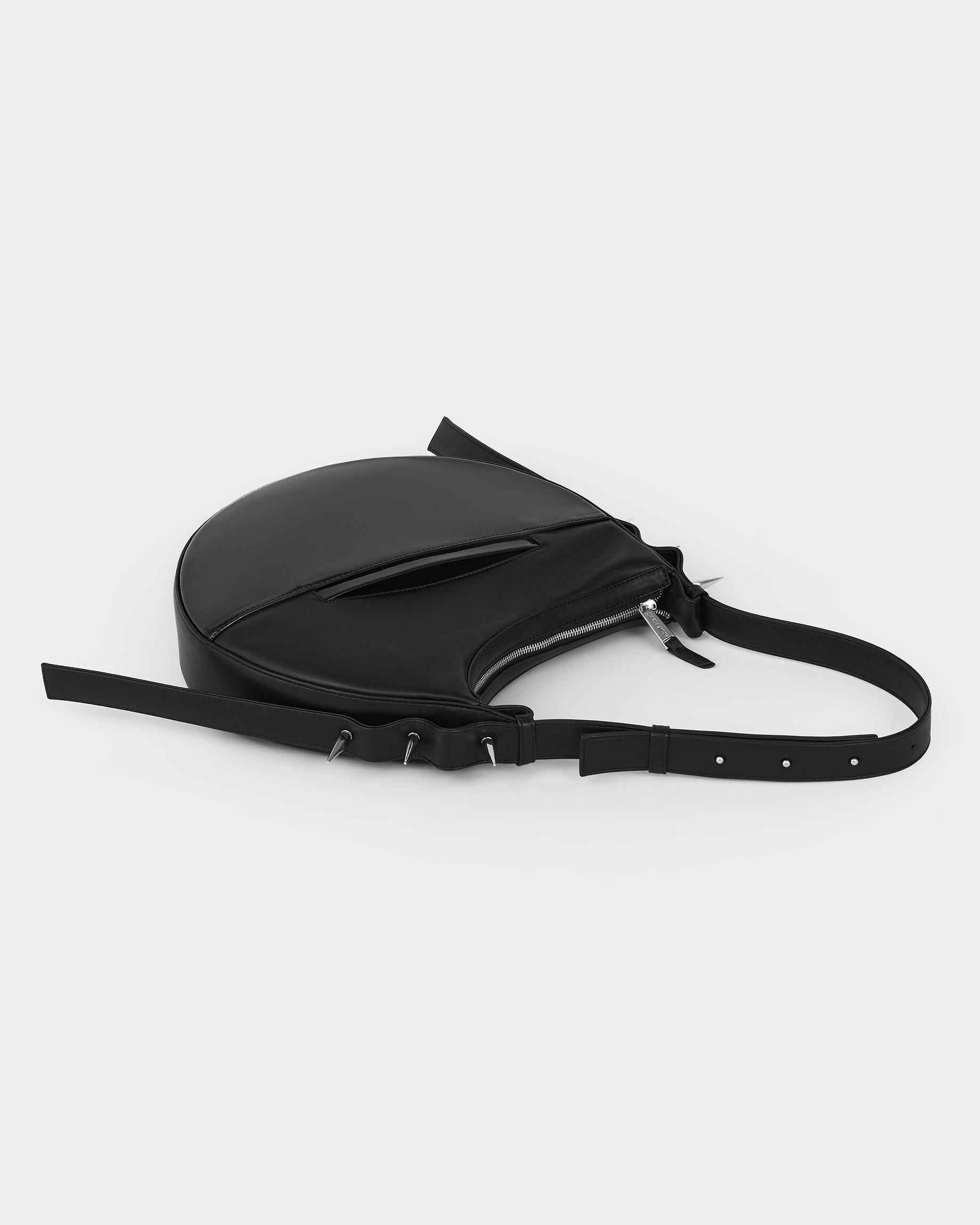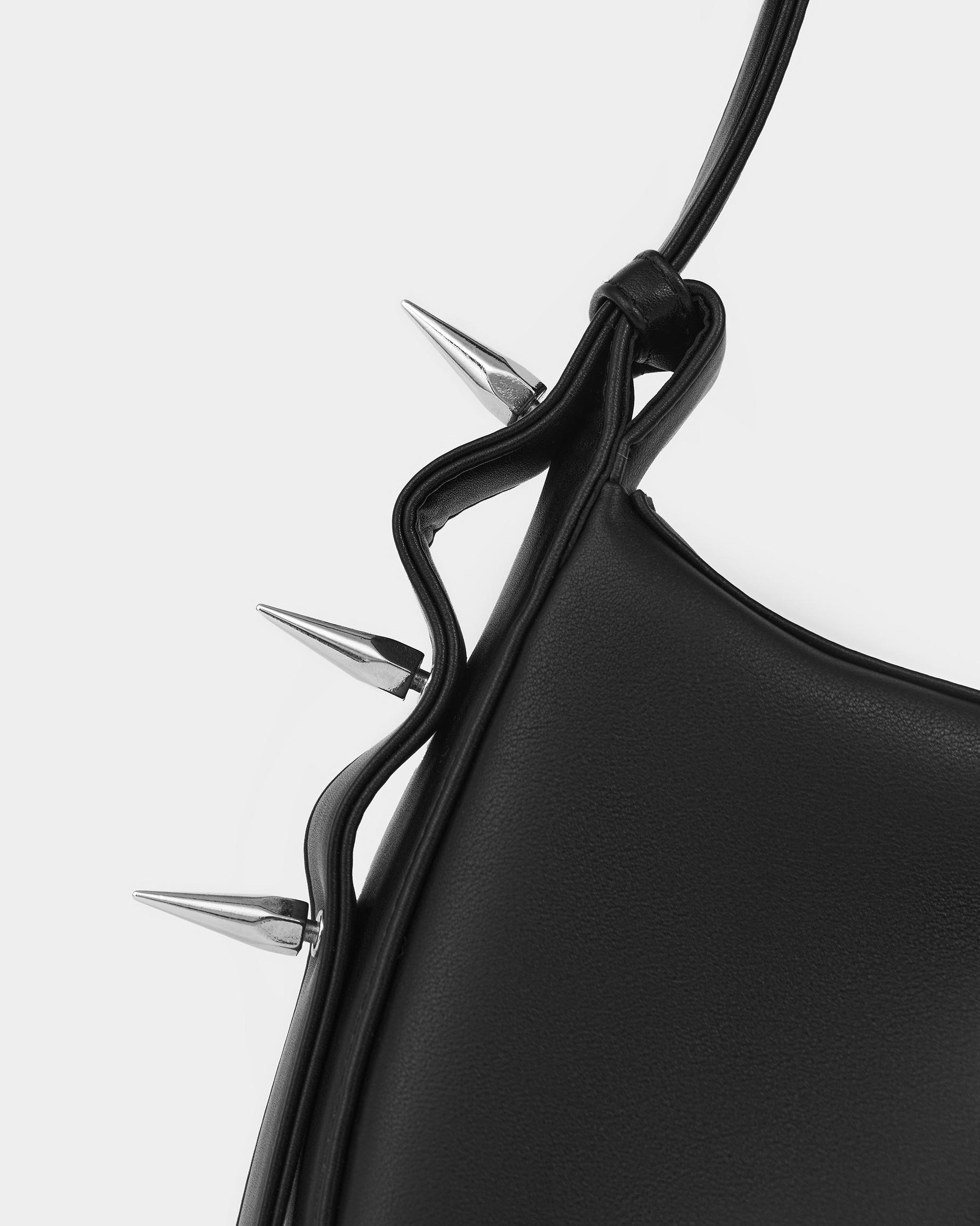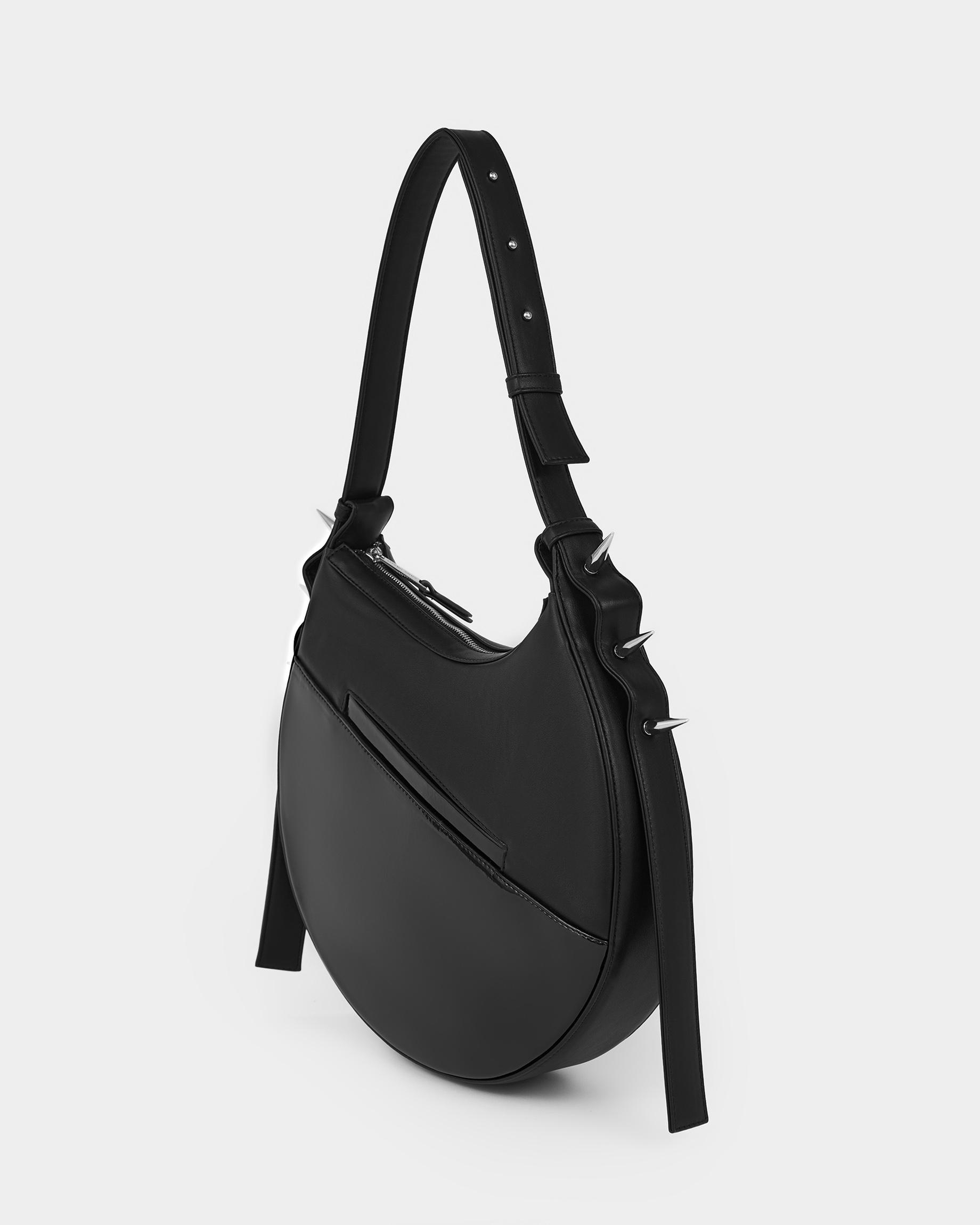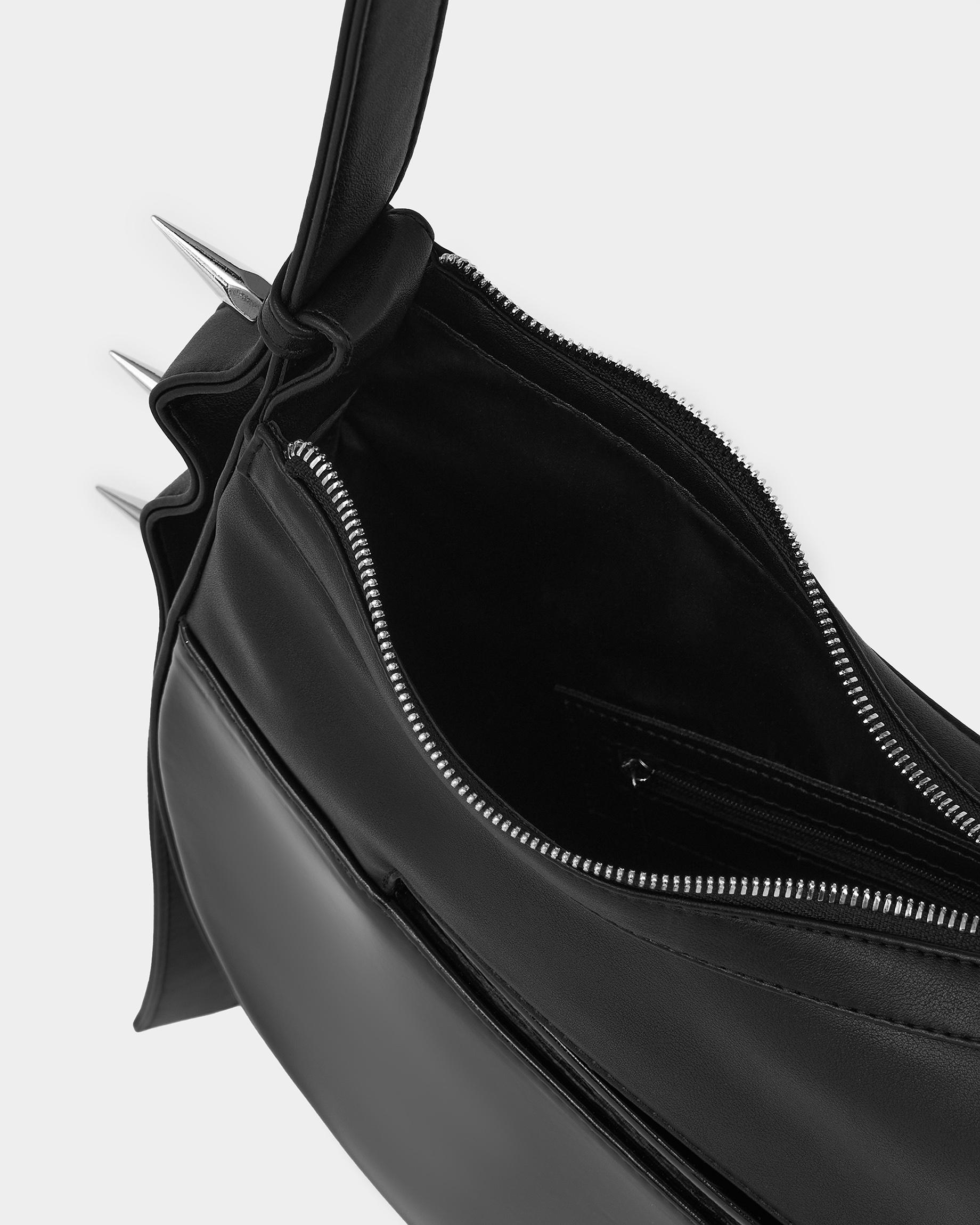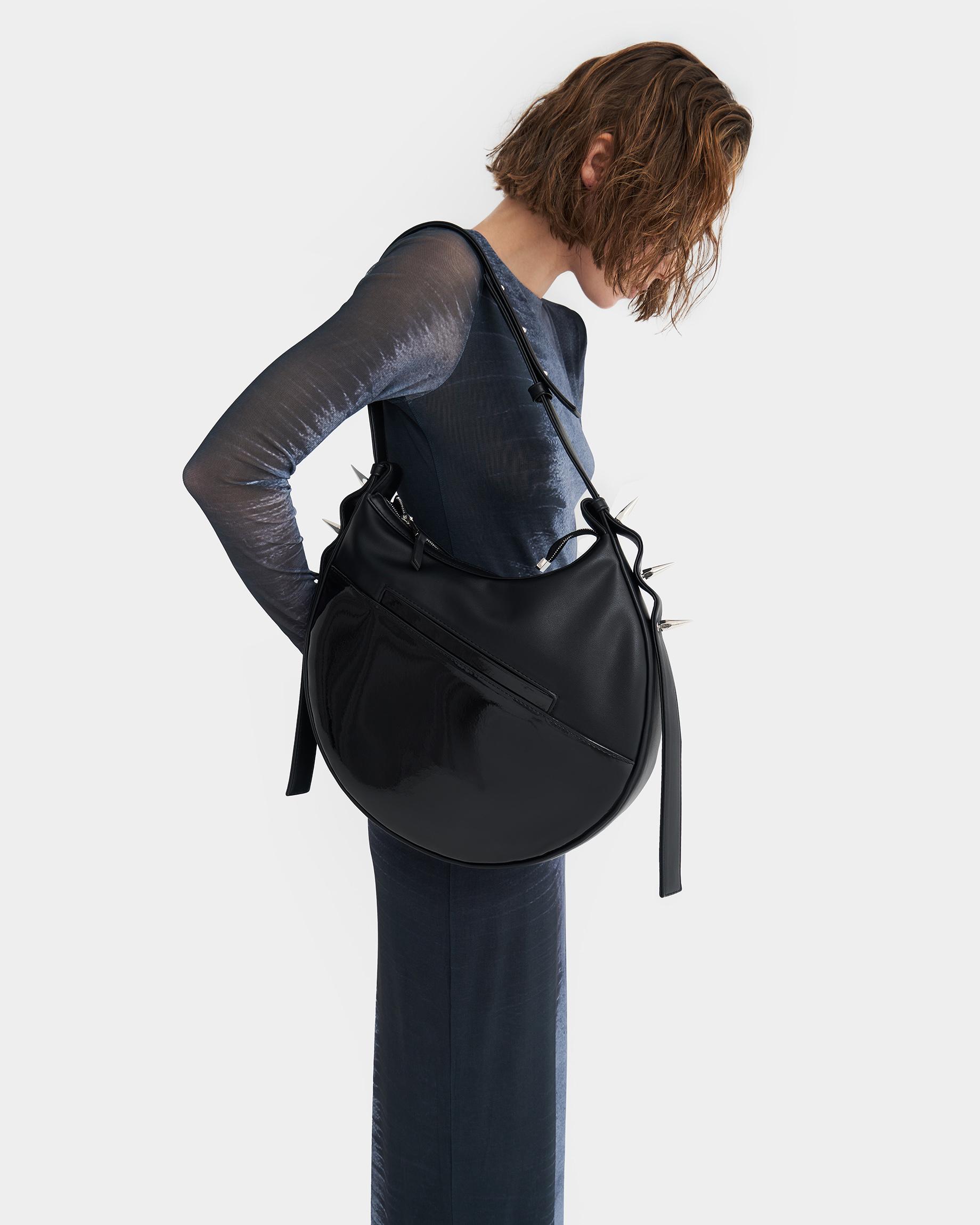 Черная сумка круглой формы из комбинированной матовой и лаковой экокожи, с шипами на ремне