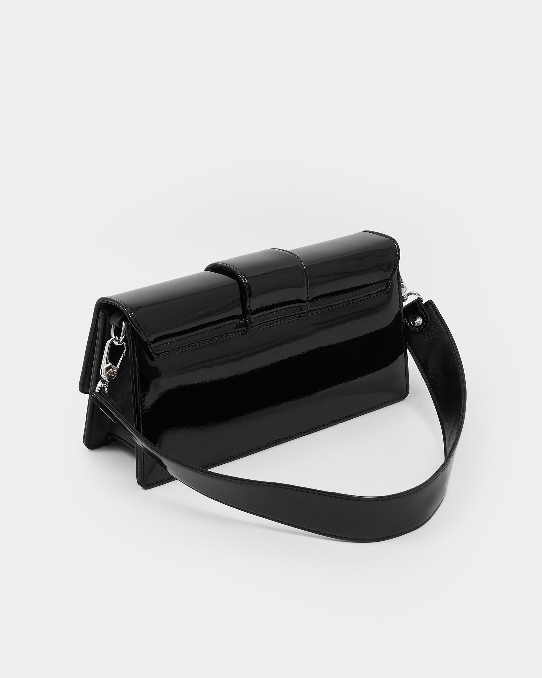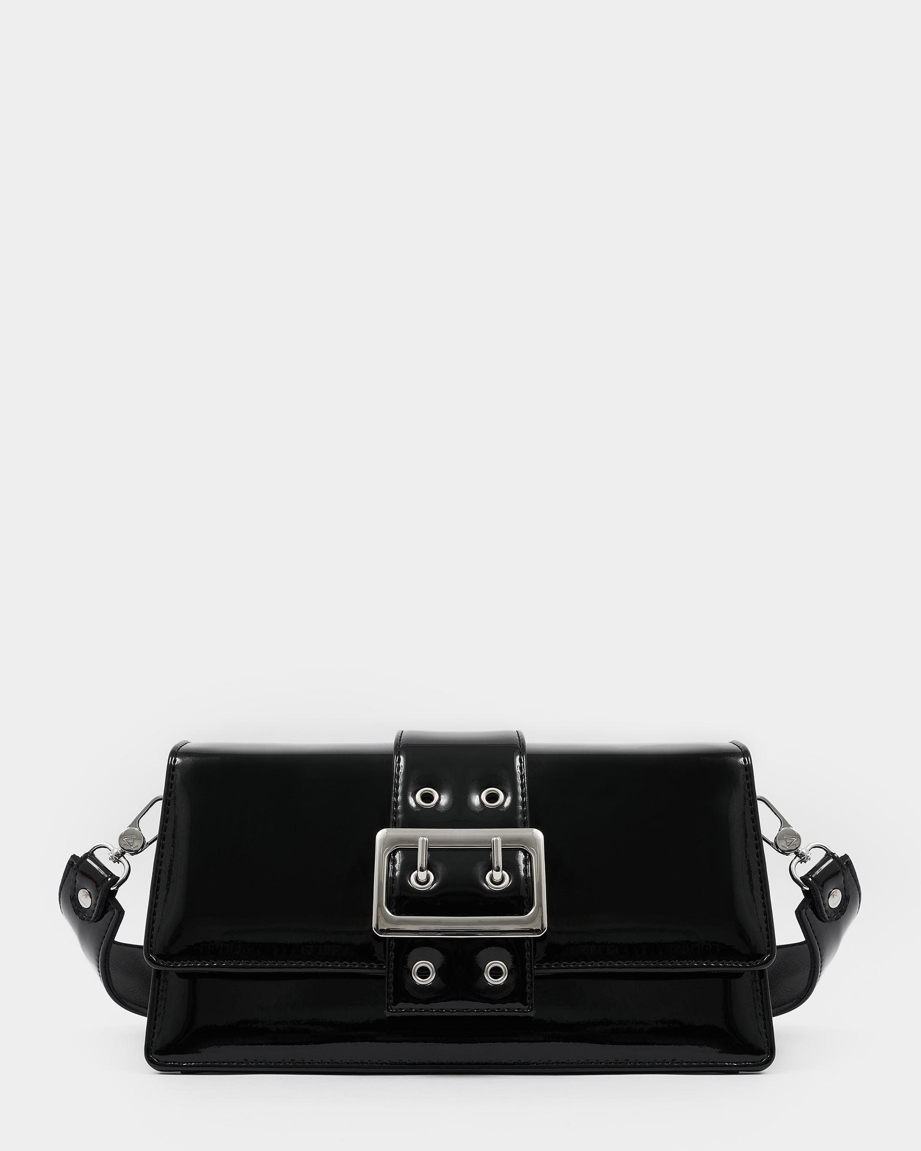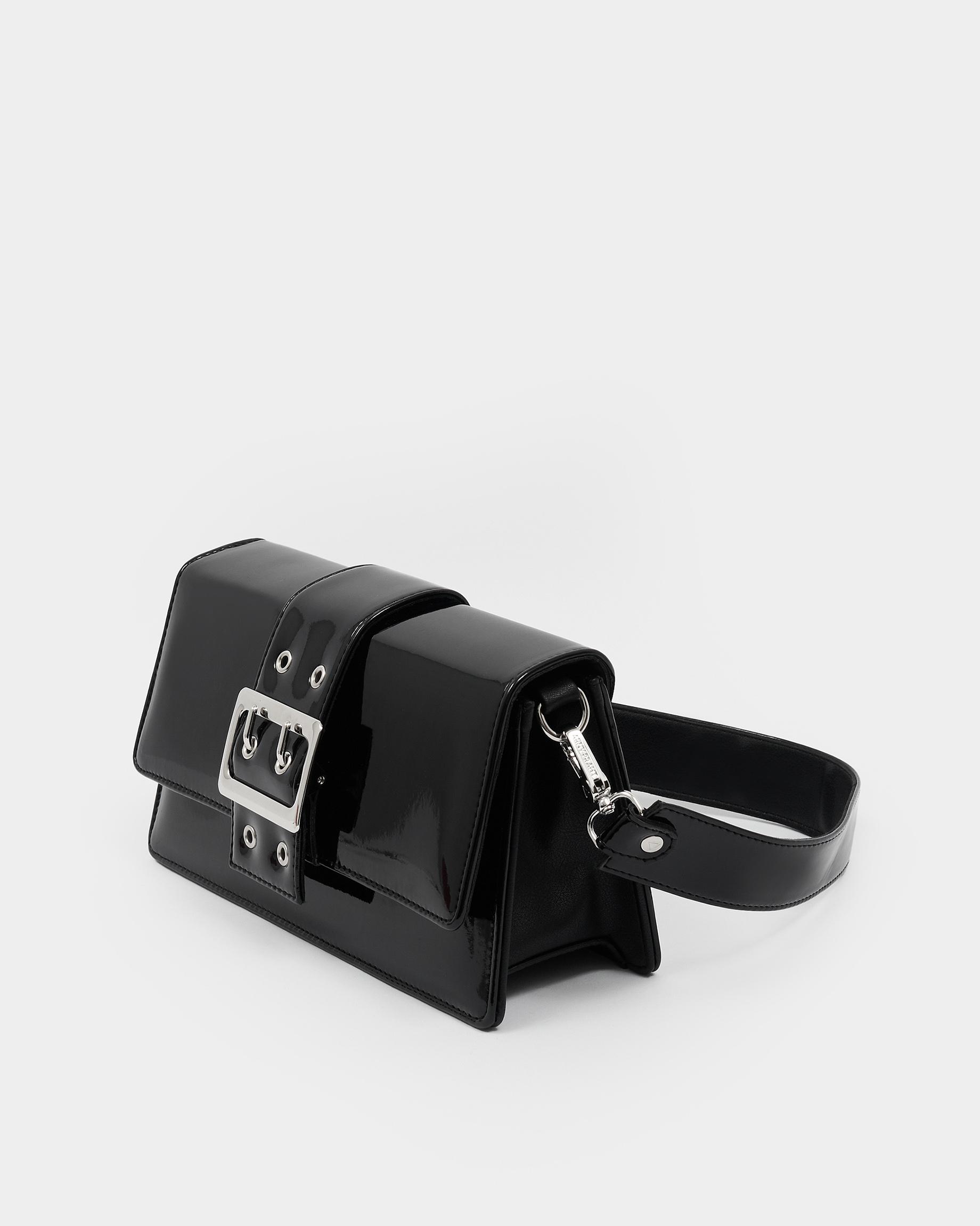 Лаковая сумка-клатч черного цвета с широким ремнем