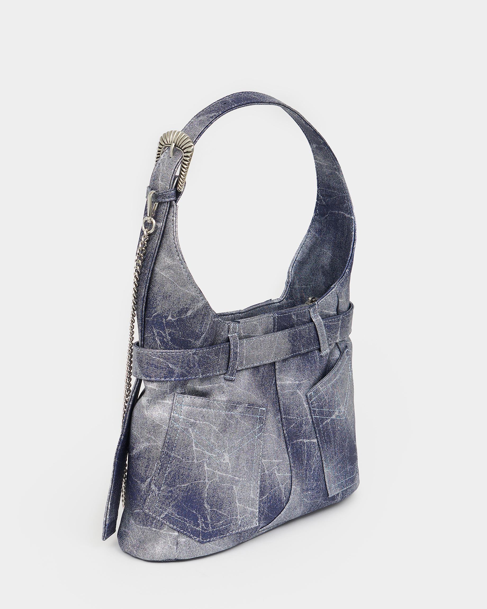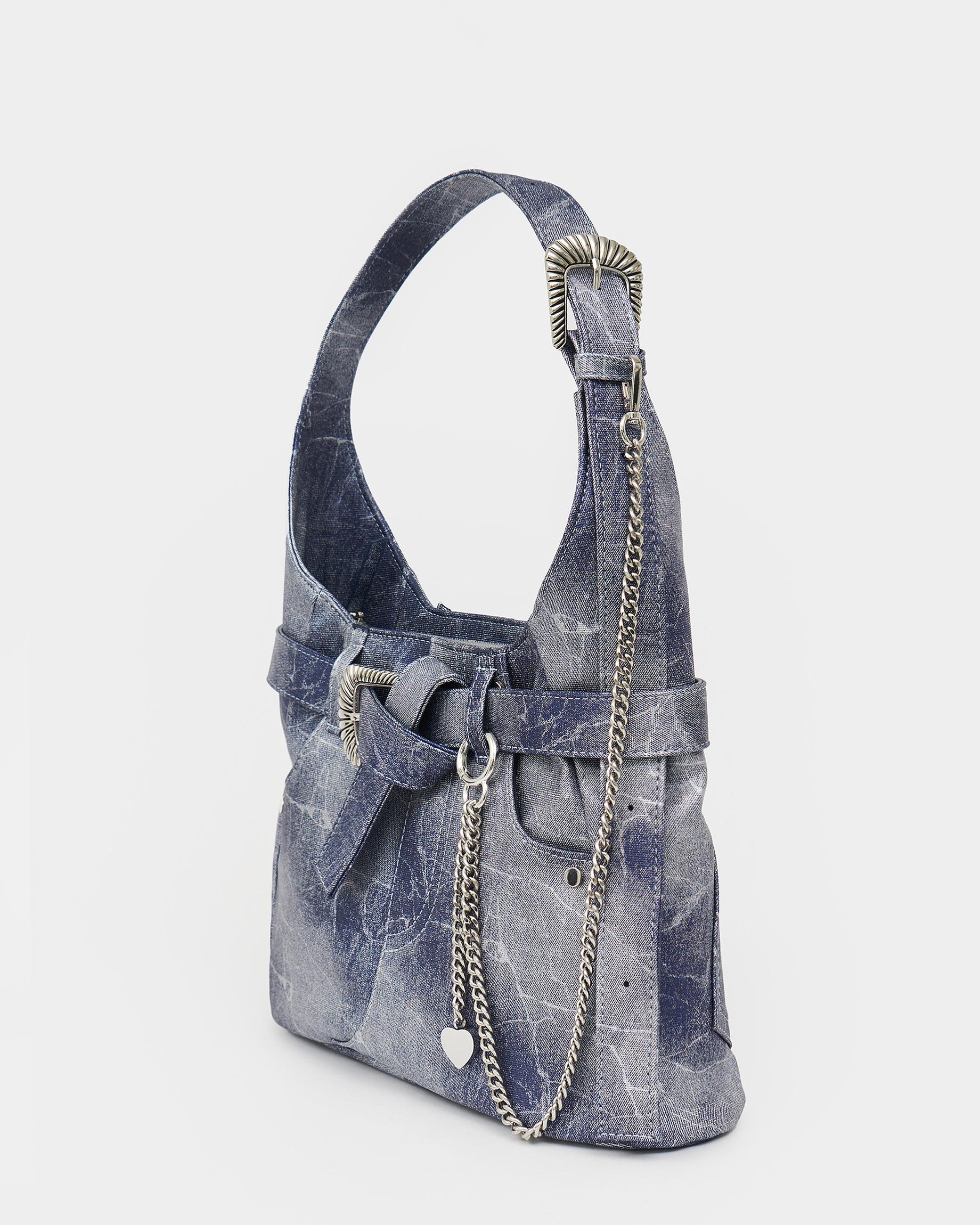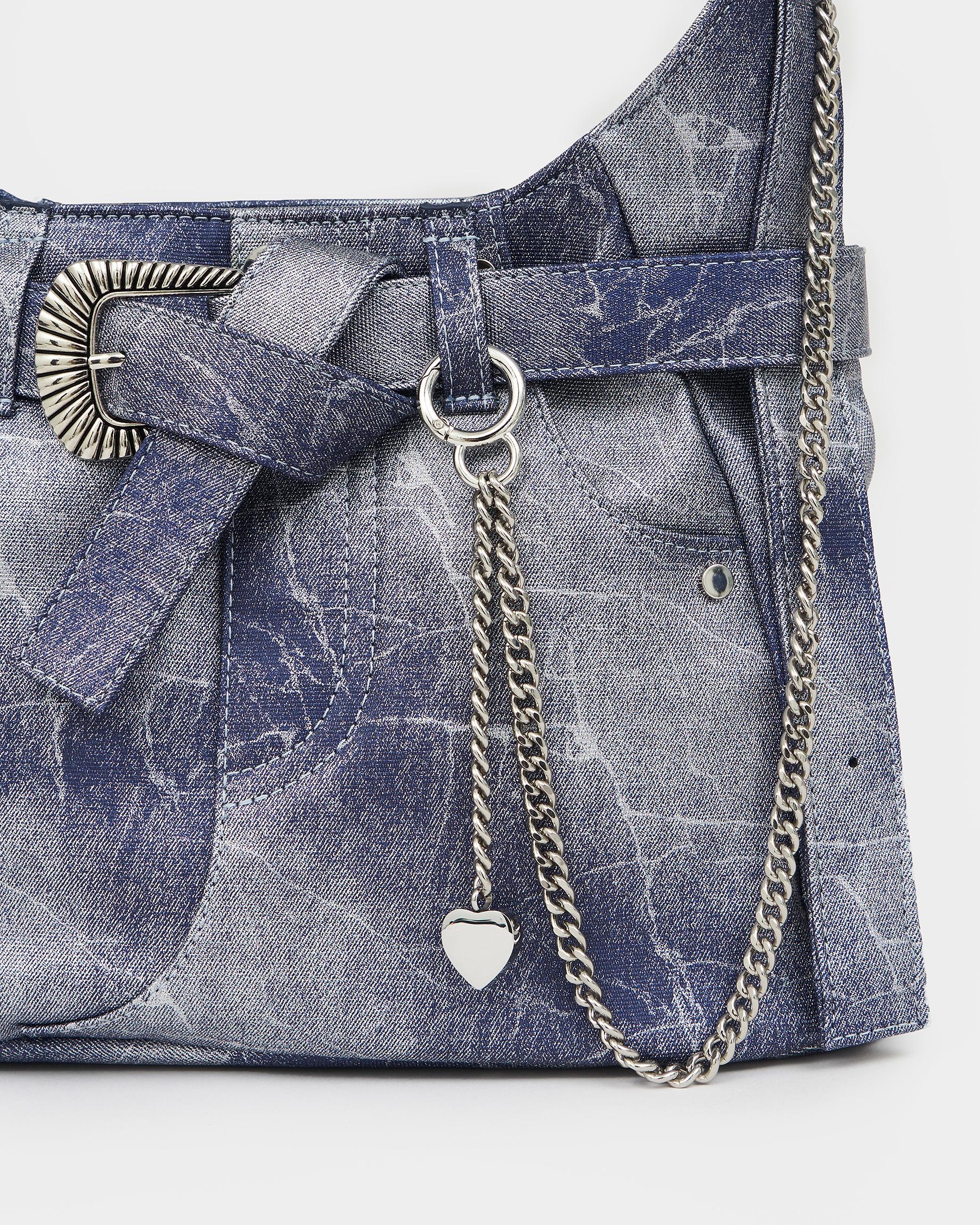 Сумка с карманами и декоративным ремнем и цепочкой в цвете потертый деним молния