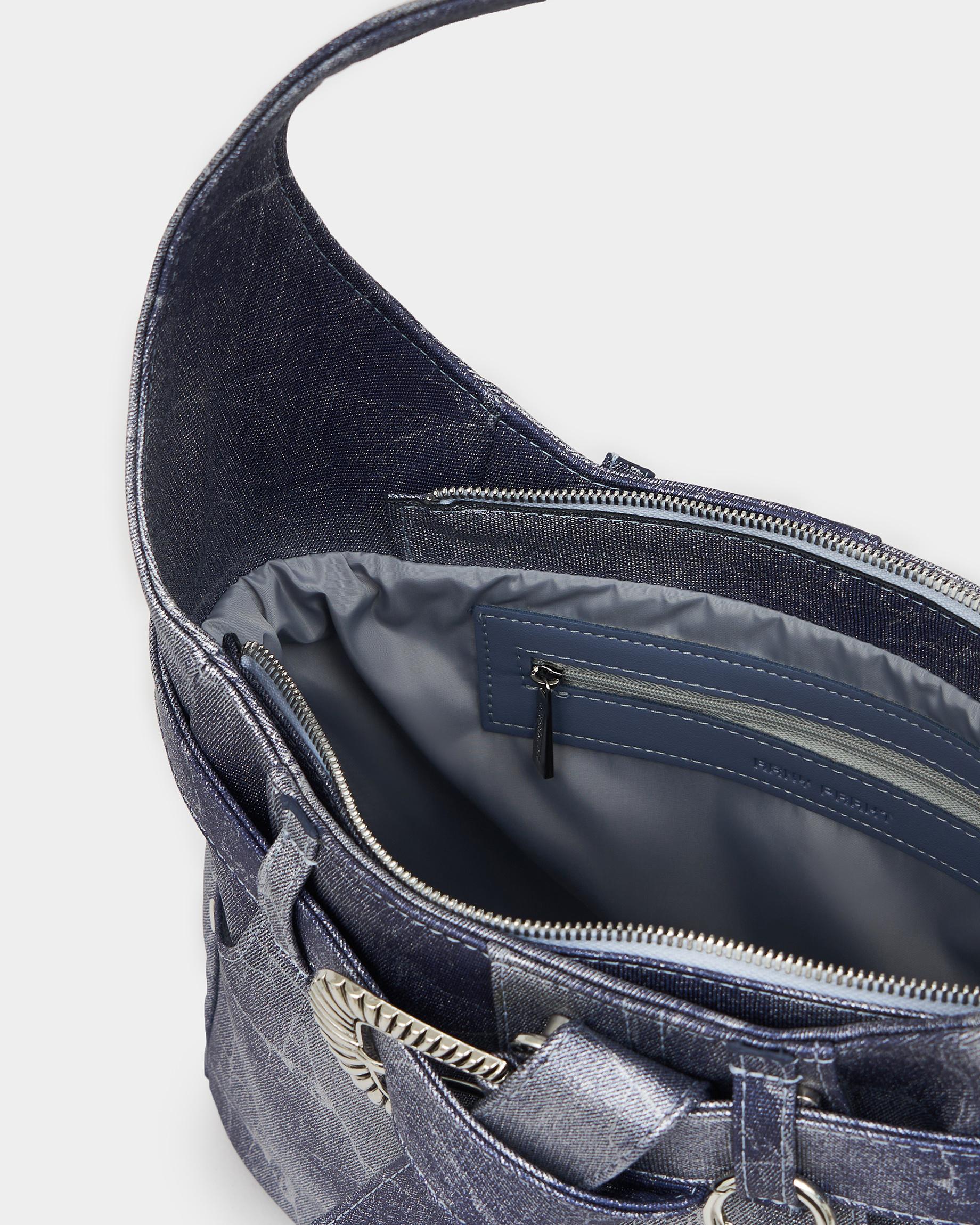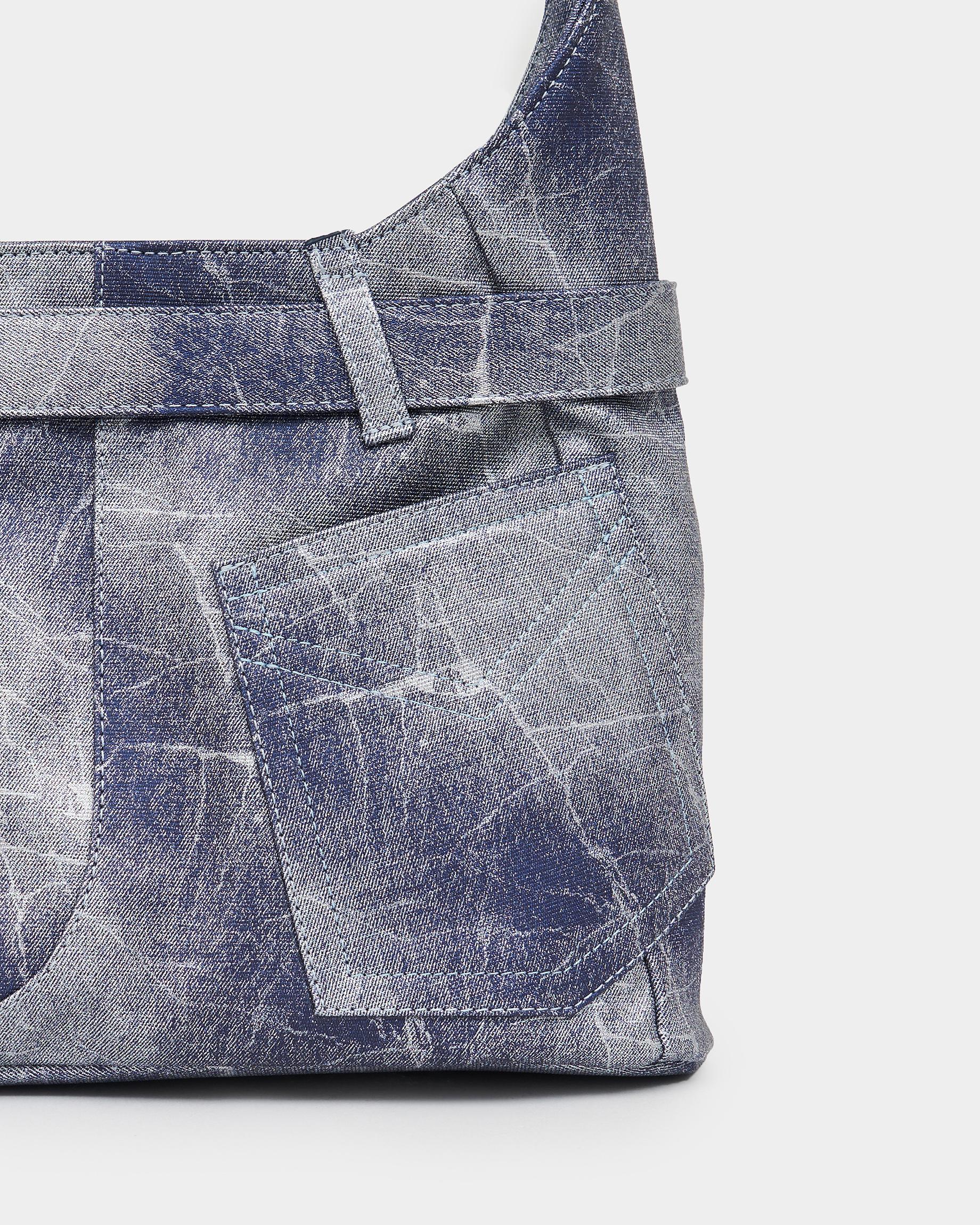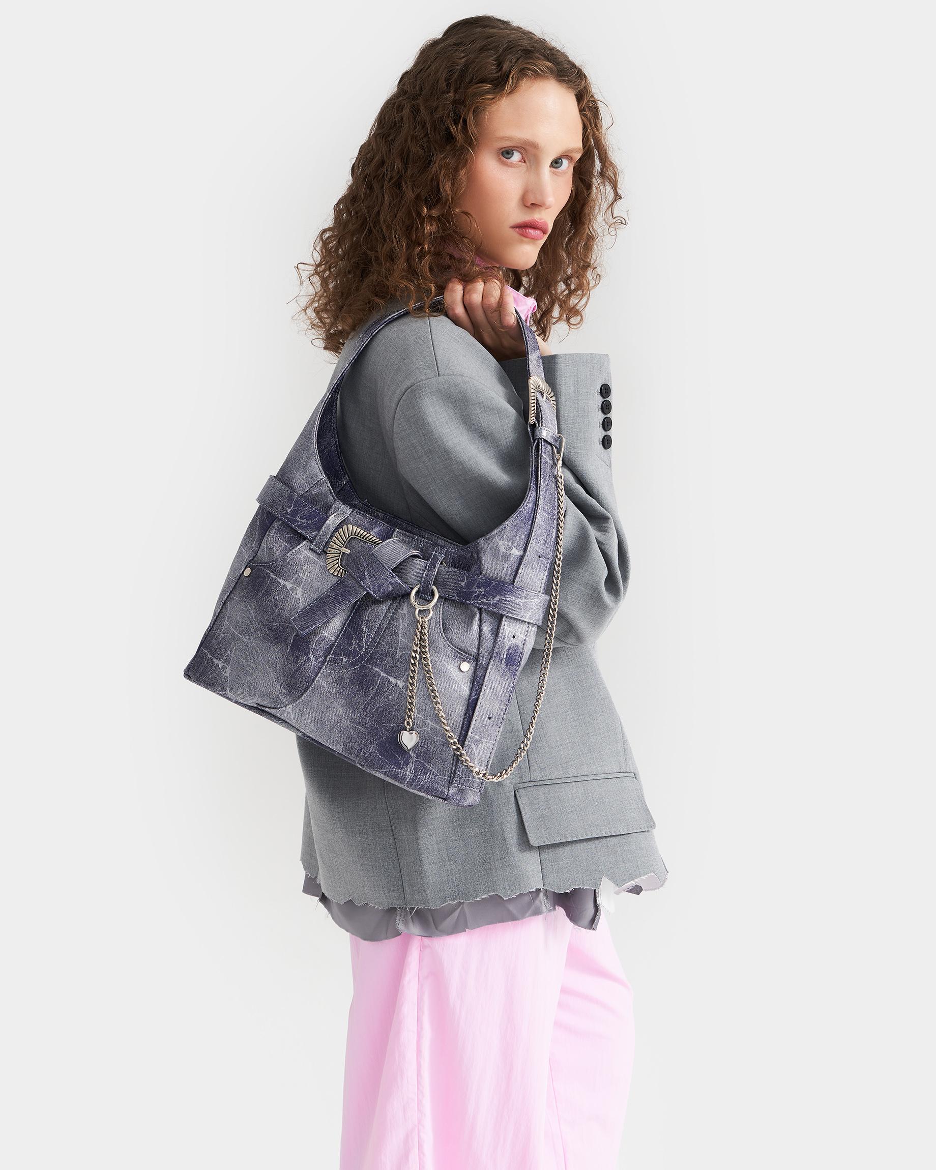 Сумка с карманами и декоративным ремнем и цепочкой в цвете потертый деним молния