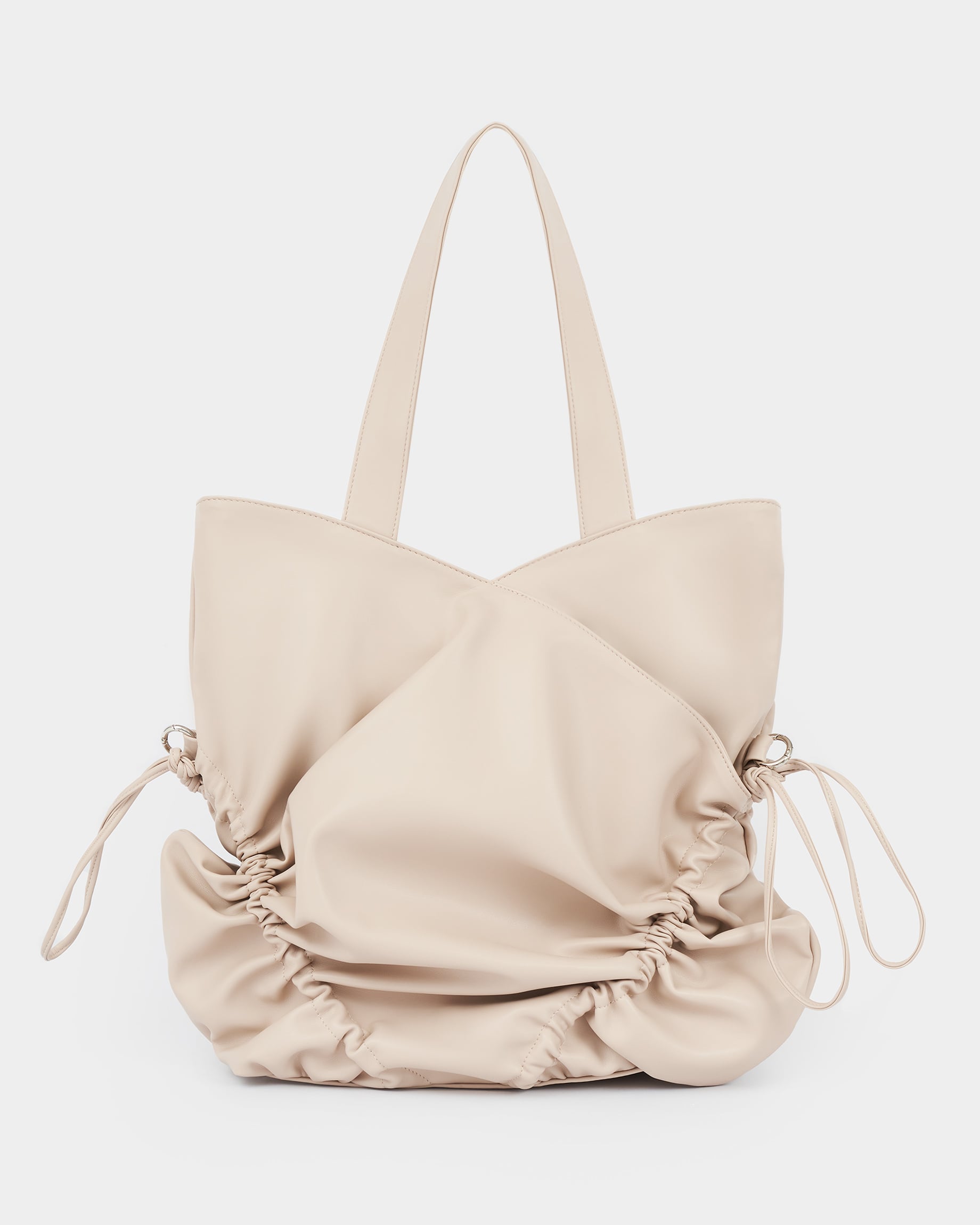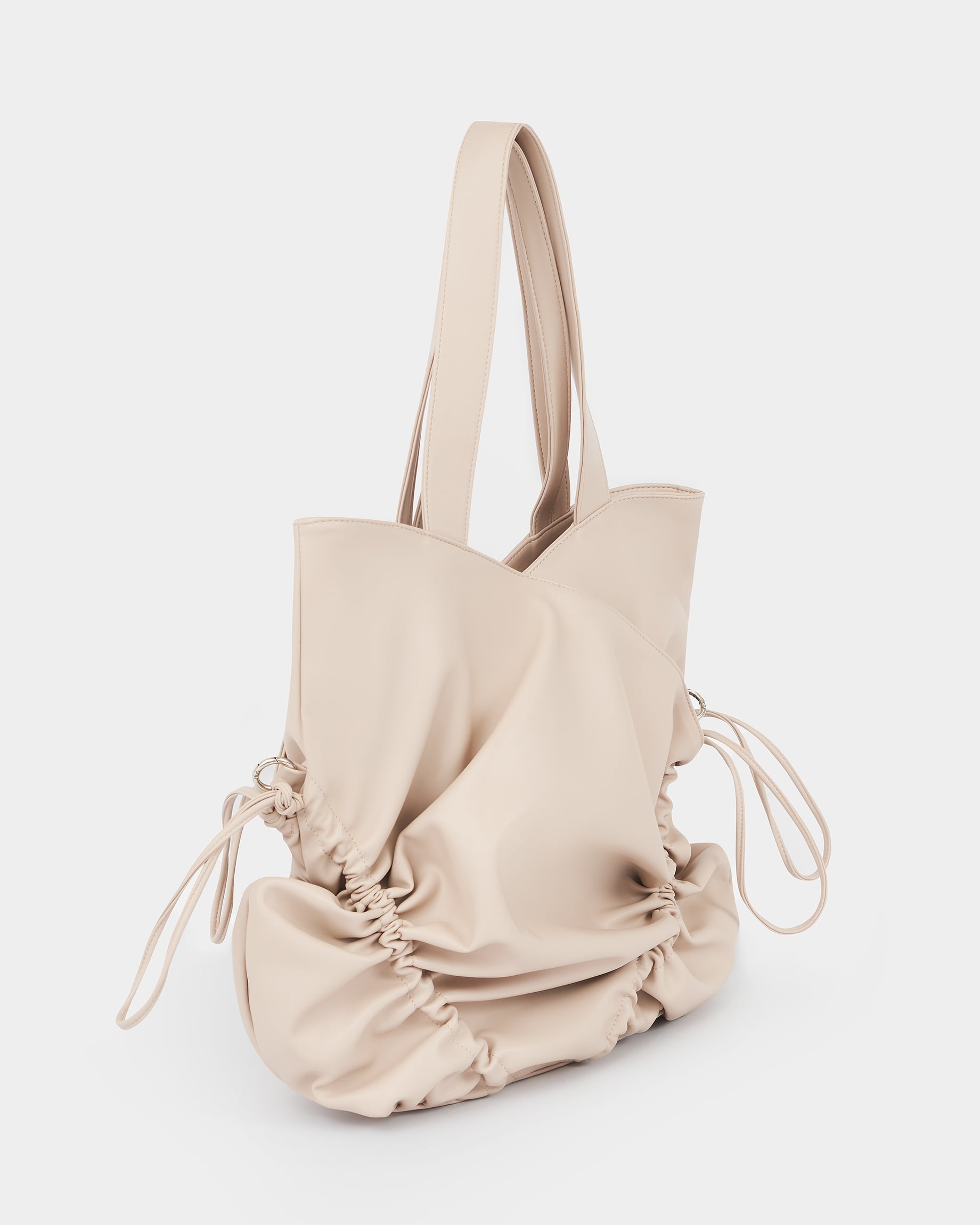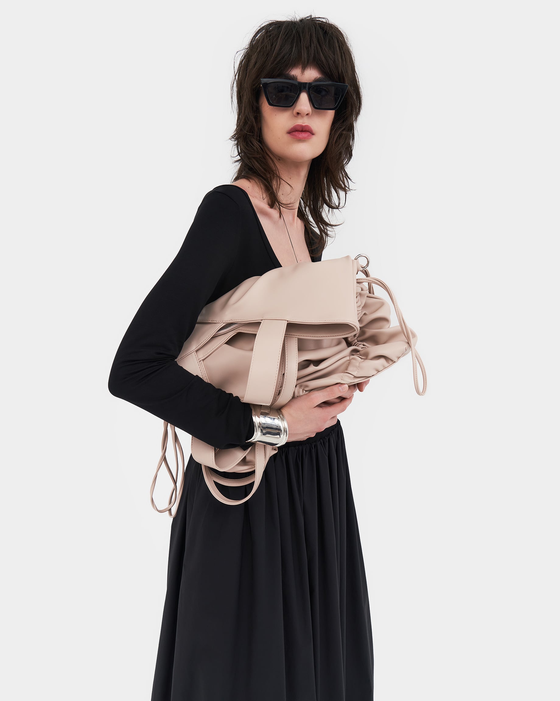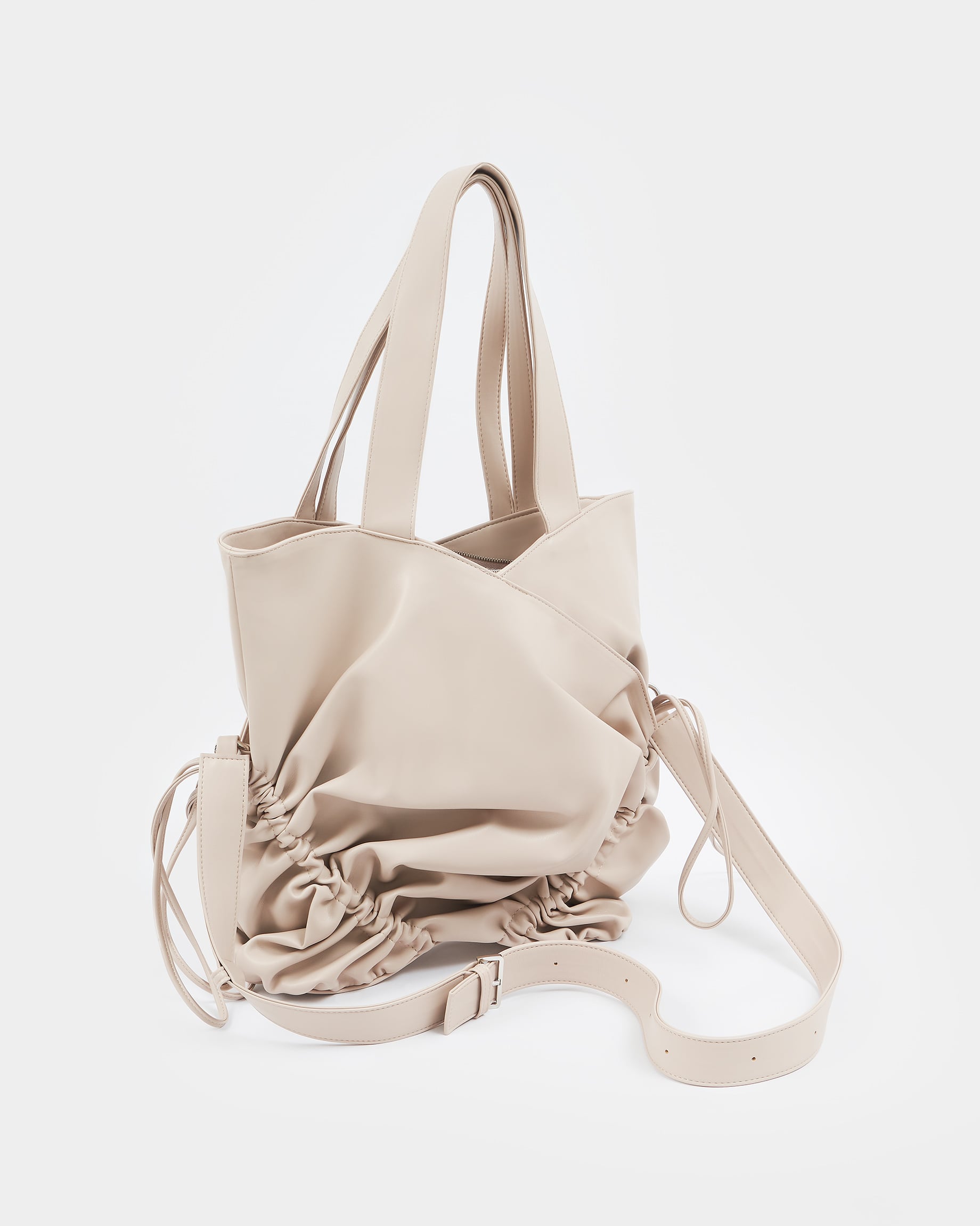 Объёмная сумка-трансформер мягкой формы со сборками в бежевом цвете