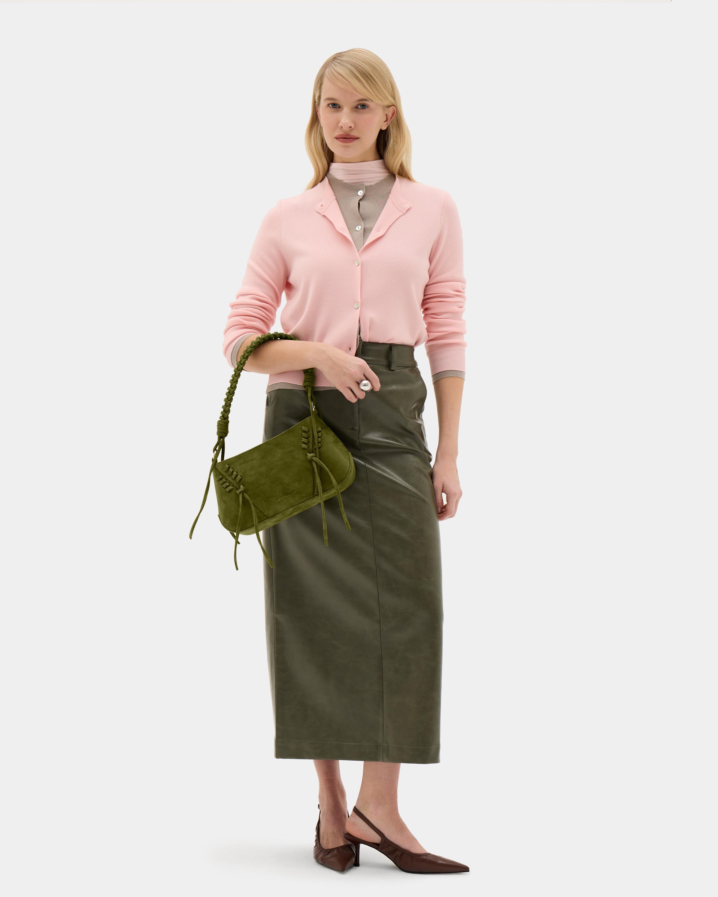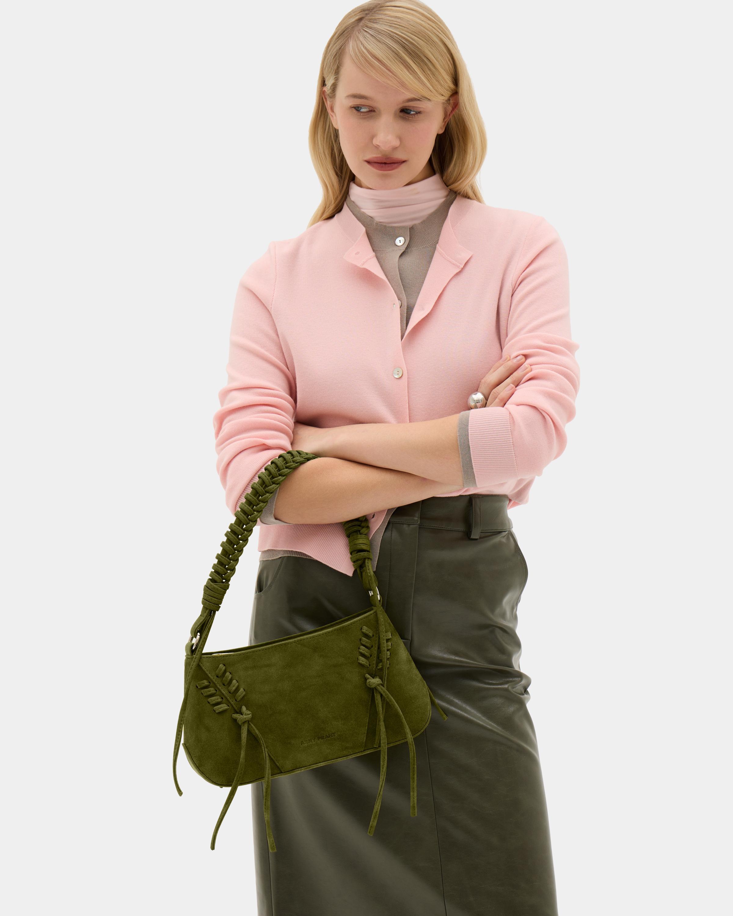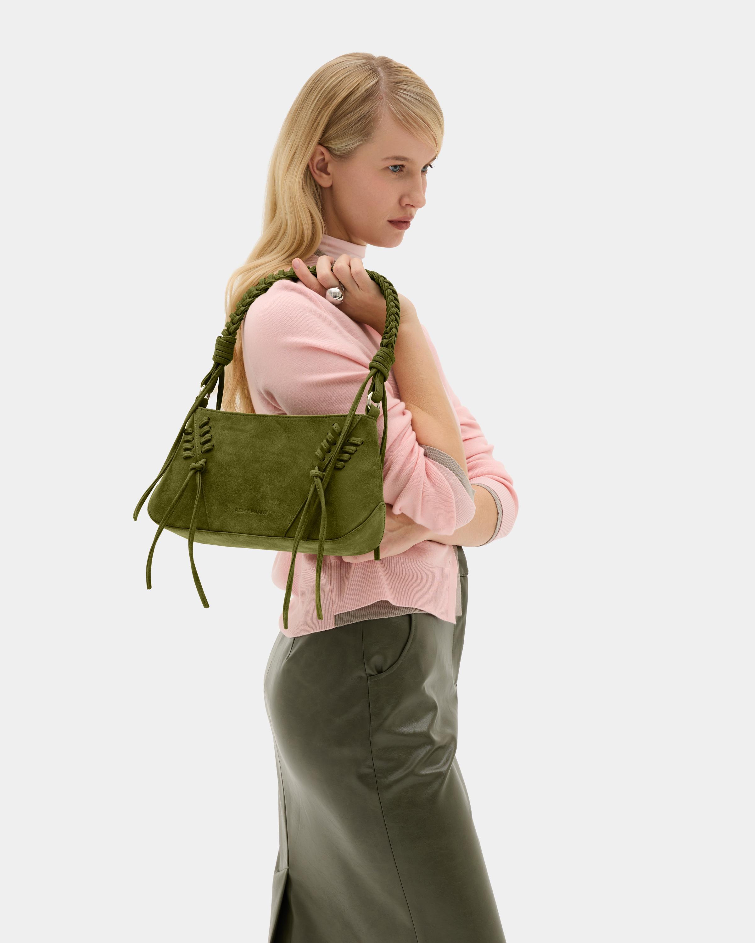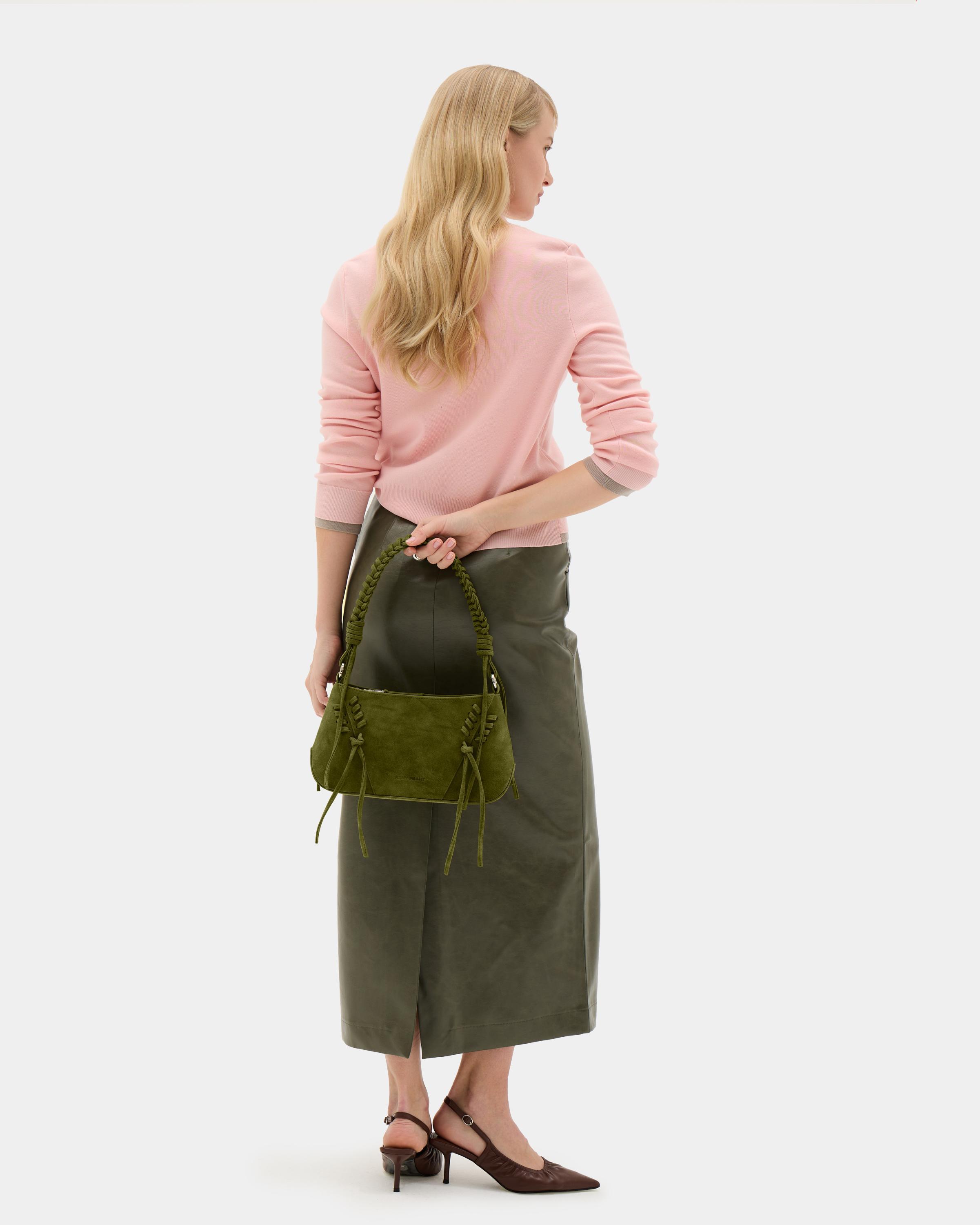 Небольшая сумка с декоративной шнуровкой и плетеной ручкой из замшевой экокожи